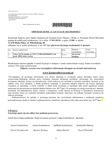 Dnia 16-01-2015r. przy Sądzie Rejonowym Poznań-Nowe Miasto i Wilda w Poznaniu Paweł Śliwiński Kancelaria Komornicza w Swarzędzu 62-020 Swarzędz Wrzesińska 9a Km 5398/13 *0020001028516* #Beata *0020001028516*/0419/ OBWIESZCZENIE O LICYTACJI RUCHOMOŚCI Komornik Sądowy przy Sądzie Rejonowym Poznań-Nowe Miasto i Wilda w Poznaniu Paweł Śliwiński podaje do publicznej wiadomości, że w dniu 17-03-2015r. o godz. 12:00 w lokalu: 12-230 Biała Piska, ul. Piłsudskiego 4E odbędzie się w trybie ustalonym w art. 867 kpc pierwsza licytacja ruchomości w postaci: Lp. Nazwa ruchomości Ilość 1 Volvo XC70, kombi, nr VIN YV1BZ14691064013 rok prod. 2009, kolor czarny 1 [szt.] Wartość szacunkowa do wyceny biegłego Cena wywołania Ruchomości można oglądać w dzień licytacji w miejscu i czasie oznaczonym wyżej. Suma wywołania wynosi 75% sumy oszacowania. Zdjęcia, wycena oraz szczegółowe informacje dostępne na stronie internetowej www.komornikswarzedz.pl Przystępujący do przetargu obowiązany jest złożyć rękojmię w wysokości jednej dziesiątej części sumy oszacowania. Rękojmię złożoną przez licytanta, któremu udzielono przybicia, zatrzymuje się; pozostałym licytantom rękojmię zwraca się niezwłocznie. Jeżeli nabywca nie wykonał w terminie warunków licytacji co do zapłaty ceny, traci rękojmię, a skutki przybicia wygasają. Z utraconej rękojmi pokrywa się koszty egzekucji związanej ze sprzedażą, a reszta wchodzi w skład sumy uzyskanej w egzekucji albo jeżeli egzekucja została umorzona jest przelewana na dochód Skarbu Państwa (art. 8671 kpc). W przetargu nie mogą uczestniczyć: dłużnik, komornik, ich małżonkowie, dzieci, rodzice i rodzeństwo, osoby obecne na licytacji w charakterze urzędowym oraz licytant, który nie wykonał warunków poprzedniej licytacji. Stawienie się jednego licytanta wystarcza do odbycia przetargu. Pełnomocnictwo do udziału w przetargu powinno być stwierdzone dokumentem z podpisem urzędowo poświadczonym, chyba że chodzi o pełnomocnictwo udzielone adwokatowi lub radcy prawnemu (art. 8672 kpc) UWAGA: Licytacja może się nie odbyć bez podania przyczyny. Jeżeli drzwi będą zamknięte, będą otwierane na koszt i odpowiedzialność dłużnika . Asesor komorniczy Asesor komorniczy Aplikant komorniczy Komornik Sądowy Paweł Nowakowski Bartosz Kramer Adam Dębicki Paweł Śliwiński 1