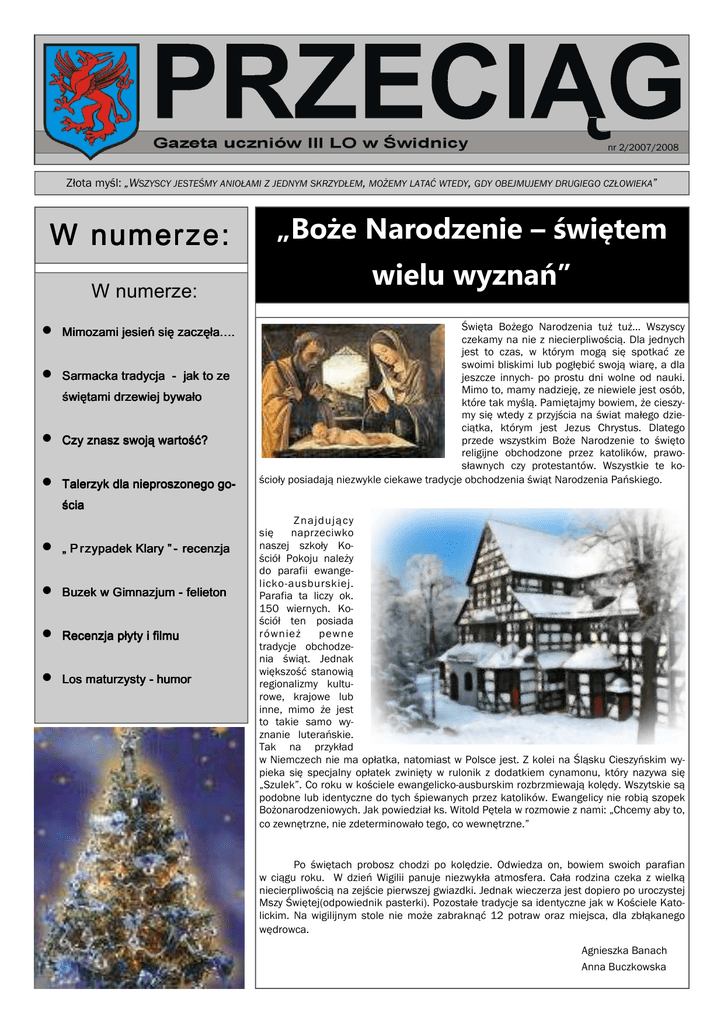 nr 2/2007/2008 Złota myśl: „WSZYSCY JESTEŚMY ANIOŁAMI Z JEDNYM SKRZYDŁEM, MOŻEMY LATAĆ WTEDY, GDY OBEJMUJEMY DRUGIEGO CZŁOWIEKA” W numerze: W numerze: • Mimozami jesień się zaczęła…. • Sarmacka tradycja - jak to ze świętami drzewiej bywało • Czy znasz swoją wartość? • Talerzyk dla nieproszonego go- „Boże Narodzenie – świętem wielu wyznań” Święta Bożego Narodzenia tuż tuż… Wszyscy czekamy na nie z niecierpliwością. Dla jednych jest to czas, w którym mogą się spotkać ze swoimi bliskimi lub pogłębić swoją wiarę, a dla jeszcze innych- po prostu dni wolne od nauki. Mimo to, mamy nadzieję, ze niewiele jest osób, które tak myślą. Pamiętajmy bowiem, że cieszymy się wtedy z przyjścia na świat małego dzieciątka, którym jest Jezus Chrystus. Dlatego przede wszystkim Boże Narodzenie to święto religijne obchodzone przez katolików, prawosławnych czy protestantów. Wszystkie te kościoły posiadają niezwykle ciekawe tradycje obchodzenia świąt Narodzenia Pańskiego. ścia • „ P rzypadek Klary ” - recenzja • Buzek w Gimnazjum - felieton • Recenzja płyty i filmu • Los maturzysty - humor Znajdu ją cy się naprzeciwko naszej szkoły Kościół Pokoju należy do parafii ewangelicko-ausburskiej. Parafia ta liczy ok. 150 wiernych. Kościół ten posiada również pewne tradycje obchodzenia świąt. Jednak większość stanowią regionalizmy kulturowe, krajowe lub inne, mimo że jest to takie samo wyznanie luterańskie. Tak na przykład w Niemczech nie ma opłatka, natomiast w Polsce jest. Z kolei na Śląsku Cieszyńskim wypieka się specjalny opłatek zwinięty w rulonik z dodatkiem cynamonu, który nazywa się „Szulek”. Co roku w kościele ewangelicko-ausburskim rozbrzmiewają kolędy. Wszytskie są podobne lub identyczne do tych śpiewanych przez katolików. Ewangelicy nie robią szopek Bożonarodzeniowych. Jak powiedział ks. Witold Pętela w rozmowie z nami: „Chcemy aby to, co zewnętrzne, nie zdeterminowało tego, co wewnętrzne.” Po świętach probosz chodzi po kolędzie. Odwiedza on, bowiem swoich parafian w ciągu roku. W dzień Wigilii panuje niezwykła atmosfera. Cała rodzina czeka z wielką niecierpliwością na zejście pierwszej gwiazdki. Jednak wieczerza jest dopiero po uroczystej Mszy Świętej(odpowiednik pasterki). Pozostałe tradycje sa identyczne jak w Kościele Katolickim. Na wigilijnym stole nie może zabraknąć 12 potraw oraz miejsca, dla zbłąkanego wędrowca. Agnieszka Banach Anna Buczkowska PRZECIĄG www.lo3.net.pl Mimozami jesień się zaczęła…. Już od godzin porannych 15 listopada aula szkolna była wypełniona uczestnikami konkursu… Śpiew rozbrzmiewał w całej szkole i panowała napięta atmosfera. Tego to dnia odbył się III Powiatowy Konkurs Piosenki Poetyckiej. Wśród uczestników przeważały osoby z naszej szkoły, lecz także mogliśmy posłuchać wykonawców m.in. z 3 Gimnazjum w Świdnicy, ze szkół dzierżoniowskich i z I LO w naszym mieście. Piosenki, które były śpiewane, dotyczyły najczęściej jesiennego klimatu albo poruszały tematy naprawdę ważne dla świadomej egzystencji każdego człowieka. Rozmowa Łukaszem Grabickim: P:Powiedz nam o uczuciach jakie towarzyszyły Ci na scenie. ŁG: Zależało mi bardzo na tym, aby przekazać wszystkie emocje jakie towarzyszyły mi przez czas spędzony z piosenką, a także tak wyszedłem na scenę i zobaczyłem wszystkie oczy wpatrzone we mnie coś ścisnęło mnie za gardło, a następnie poczułem skrzydła u ramion i to dodało mi pewności siebie. Poziom był naprawdę bardzo wysoki. Mimo że dość duża liczba uczestników nie pojawiła się, to poprzeczka podnosiła się z występem każdego kolejnego zawodnika, a dziecinna ciekawość wzrastała z każdą kolejną sekundą… Gdy na scenę wyszła pierwsza zawodniczka na jej twarzy widać było wielką nadzieję i zdenerwowanie (Czemu w ogóle nie można się dziwić). U kolejnych zawodników także można było bardzo dużo wyczytać z twarzy, jednak nie były to ciągle te same uczucia. Jednemu pokrywała się ona rumieńcem, innemu znów oczy rozbłysły dziwnym blaskiem, a jeszcze innemu rozjaśniła się w uśmiechu… P: O czym myślałeś, gdy wyszedłeś na scenę? ŁG: Myślałem o tym, czy wybrałem dobry sposób zaśpiewania piosenki, bo zależało mi na tym aby dotarła do wszystkich ludzi zebranych na sali… (śmiech) a później miałem ogromną nadzieję, że mi nie wyłączą mikrofonu. P: A co myślałeś o konkurencji? ŁG: Uważam, że w tym roku była ona spora i poprzeczka została wysoko ustawiona. Było z kim powalczyć i to sprawia, że uczucie wygranej jest jeszcze słodsze. Gdy konkurs dobiegł końca, jury udało się na naradę, a na scenę zajaśniała gwiazda ówczesnego wieczoru - Hell Heaven. Cała publiczność została rozruszana i nie taiła zdziwienia, że w III LO jest tak dobry zespół. Podczas gdy jury poszło na obrady, wśród osób, które głosowały na uczestników Konkursu, została wylosowana nagroda. Otrzymała ją Małgorzata Słubicka. P: Co czułeś, gdy jury wyczytało Twoje nazwisko, oznajmiając że Grand Prix’a masz w kieszeni? ŁK: Nie spodziewałem się, że wygram. W ogóle mi to na myśl nie przyszło. Byłem z tego powodu naprawdę szczęśliwy i zaniemówiłem z wrażenia… Po prostu nagle zabrakło mi słów. Chcę jednak zaznaPo powrocie jury zostały wręczone nagro- czyć, że bez pomocy Roksany Kani nie osiągnąłbym tego wszystkiego. Przy okazji chcę jej niezmiernie podziękować. dy: wyróżnienia, 3,2,1 miejsce i Grand Prix. Byłam zupełnie rozczarowana, gdy ogłoszono, że Małgorzata Wilk, która zaśpiewała autorska piosenkę- „łzy P: A powiedz nam o przygotowaniach… długo trwały? smutku” otrzymała tylko wyróżnienie. ŁG: (śmiech) Jak grzeczny uczeń przygotowywałem się całe dwa Skoro dziewczyna, która tak pięknie śpiewa dostała tylko wyróżnienie, to