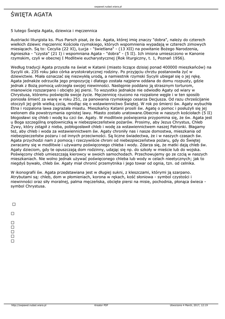 swpawel.rudasl.wiara.pl ŚWIĘTA AGATA 5 lutego Święta Agata, dziewica i męczennica Austriacki liturgista ks. Pius Parsch pisał, że św. Agata, której imię znaczy "dobra", należy do czterech wielkich dziewic męczennic Kościoła rzymskiego, których wspomnienia wypadają w czterech zimowych miesiącach. Są to: Cecylia (22 XI), Łucja - "świetlana" - (13 XII) na powitanie Bożego Narodzenia, Agnieszka - "czysta" (21 I) i wspomniana Agata - "dobra" - (5 II). Ich imiona umieszczono w Kanonie rzymskim, czyli w obecnej I Modlitwie eucharystycznej (Rok liturgiczny, t. 1, Poznań 1956). Według tradycji Agata przyszła na świat w Katanii (miasto liczące dzisiaj ponad 400000 mieszkańców) na Sycylii ok. 235 roku jako córka arystokratycznej rodziny. Po przyjęciu chrztu postanowiła żyć w dziewictwie. Miała oznaczać się niezwykłą urodą, a namiestnik rzymski Sycylii ubiegał się o jej rękę. Agata jednakże odrzuciła jego propozycję i dlatego została najpierw oddana do domu rozpusty, gdzie jednak z Bożą pomocą ustrzegła swojej niewinności. Następnie poddano ją strasznym torturom, mianowicie rozszarpano i obcięto jej piersi. To wszystko jednakże nie odwiodło Agaty od wiary w Chrystusa, któremu poświęciła swoje życie. Męczennicę rzucono na rozpalone węgle i w ten sposób poniosła śmierć za wiarę w roku 251, za panowania rzymskiego cesarza Decjusza. Od razu chrześcijanie otoczyli jej grób wielką czcią, modląc się o wstawiennictwo Świętej. W rok po śmierci św. Agaty wybuchła Etna i rozpalona lawa zagrażała miastu. Mieszkańcy Katanii prosili św. Agatę o pomoc i posłużyli się jej welonem dla powstrzymania ognistej lawy. Miasto zostało uratowane.Obecnie w naszych kościołach (5 II) błogosławi się chleb i wodę ku czci św. Agaty. W modlitwie poświęcenia przypomina się, że św. Agata jest u Boga szczególną orędowniczką w niebezpieczeństwie pożarów. Prosimy, aby Jezus Chrystus, Chleb Żywy, który zstąpił z nieba, pobłogosławił chleb i wodę za wstawiennictwem naszej Patronki. Błagamy też, aby chleb i woda za wstawiennictwem św. Agaty chroniły nas i nasze domostwa, mieszkania od niebezpieczeństw pożaru i od innych przeciwności. Są liczne świadectwa, że i w naszych czasach św. Agata przychodzi nam z pomocą i rzeczywiście chroni od niebezpieczeństwa pożaru, gdy do Świętej zwracamy się w modlitwie i używamy poświęconego chleba i wody. Zdarza się, że matki dają chleb św. Agaty dzieciom, gdy te opuszczają dom rodzinny, udając się np. do szkoły w mieście lub do wojska. Poświęcony chleb umieszczają kierowcy w swoich samochodach. Przechowujemy go ze czcią w naszych mieszkaniach. Nie wolno jednak używać poświęconego chleba lub wody w celach nieetycznych; jak to niegdyś bywało, chleb św. Agaty miał chronić przemytnika i jego towar od ognia, tzn. od celnika. W ikonografii św. Agata przedstawiana jest w długiej sukni, z kleszczami, którymi ją szarpano. Atrybutami są: chleb, dom w płomieniach, korona w rękach, kość słoniowa - symbol czystości i niewinności oraz siły moralnej, palma męczeńska, obcięte piersi na misie, pochodnia, płonąca świeca symbol Chrystusa. http://swpawel.rudasl.wiara.pl Kreator PDF Utworzono 4 March, 2017, 12:19