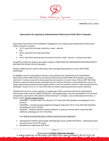 KRAKÓW, 03.11.2013 Zaproszenie do organizacji Indywidualnych Mistrzostw Polski 2014 w Squashu. Zaproszenie kierowane do firm/obiektów ubiegających się o organizację Indywidualnych Mistrzostw Polski w Squashu w dniach: 15-17 maja 2014 (turnieje seniorskie: męski , damski) lub 29-31 maja 2014 (turnieje juniorskie) lub 28-31 maja 2014 opcja łączona (turnieje seniorskie: męski , damski + turnieje juniorskie) Zarząd PFS serdecznie zaprasza do wzięcia udziału w PRZETARGU NA ORGANIZACJĘ INDYWIDUALNYCH MISTRZOSTW POLSKI 2014 W SQUASHU. Poniżej znajdą Państwo istotne informacje, które pomogą odpowiedzieć na nasze ZAPYTANIE OFERTOWE. W ubiegłym sezonie najważniejsze imprezy naszej społeczności squashowej czyli Indywidualne Mistrzostwa Polski (IMP) 2013 oraz Drużynowe Mistrzostwa Polski (DMP) 2013 okazały się wielkim sukcesem i znacząco przyczyniły się do popularyzacji squasha w naszym kraju. Podczas IMP 2013 klub SoSquash zapewnił wykorzystanie szklanego kortu w centrum Poznania, a klub Squash4You już po raz drugi zorganizował Drużynowe Mistrzostwa Polski w centrum Krakowa również z wykorzystaniem kortu szklanego. Liczymy na to, że i w roku 2014 obie te imprezy okażą się ponownie dużym sukcesem. Podobnie jak rok temu mamy nadzieję, że napływające oferty pozwolą zrealizować Indywidualne Mistrzostwa Polski w duchu ŚWIĘTA SQUASHA, czyli wyjątkowego czasu dla zawodników i ich trenerów, sympatyków, sponsorów i Wszystkich zainteresowanych. Z związku z tym przekazujemy formularz, w którym należy określić rodzaj turnieju: SENIORSKI – turnieje męski oraz damski 15-17 maja 2014 (dla obiektów posiadających min 6 kortów), JUNIORSKI – turnieje wg poszczególnych kategorii wiekowych 29-31 maja 2014 (dla obiektów posiadających min 6 kortów), ŁĄCZONY – SENIOR+JUNIOR w jednym obiekcie, w jednym terminie 28-31 maja 2014 (dla obiektów posiadających min 10 kortów). oraz wybrać przynajmniej jedną z dwóch poniższych opcji organizacji: 1. Udostępnienie obiektu sportowego spełniającego normy wg RRI 2013/2014 – organizacją zajmą się wyznaczone przez PFS osoby. 2. Kompleksowa organizacja IMP 2014. Strona 1 / 2 Stowarzyszenie Polska Federacja Squasha ul. Księcia Józefa 54a; 30-206 Kraków; KRS 0000133701; Regon 015266427; NIP 527-23-91-187 Ad.1 W tej odpowiedzi na nasze zapytanie ofertowe oczekujemy: podania ceny za wynajęcie obiektu na czas trwania IMP, opcjonalnej wpłaty do PFS, opcjonalnego oddelegowania osób/kontaktów do pracy przy organizacji imprezy (pomoc przy prowadzeniu rozgrywek, organizacji bazy noclegowej, nagłośnienia imprezy, itp), oczekiwane informacje na temat ilości osób oraz ich doświadczenia. Ad. 2 Oczekiwane informacje tej opcji będą zbliżone do procedury przetargowej, która dotyczyła turniejów kat. A w sezonie 2013/2014, czyli: dane obiektu/klubu, zgłaszającego, komitetu organizacyjnego, doświadczenie w organizacji turnieju, wysokość wpłaty dla PFS, rodzaje i zawartość pakietów, pula nagród finansowych (przy czym minimalna kwota nagród finansowych w turniejach seniorskich to 12 tys. zł, co wynika ze zgłoszenia turnieju jako PSA National Closed i WSA Super Challenger National Closed), planowane nagrody rzeczowe, działania mające na celu nagłośnienie imprezy oraz promocji squasha, opcje zakwaterowania uczestników. Mając na uwadze imprezy z ubiegłego sezonu bardzo prosimy o przekazanie szczegółowego planu dotyczącego promocji squasha, ponieważ będzie to także istotne kryterium przetargowe. Zdajemy sobie sprawę, iż konstrukcja takich ofert nie będzie łatwa. Kieruje nami natomiast chęć zorganizowania IMP na najwyższym poziomie. Uprzejmie prosimy o składanie ofert w opcjach, w których czujecie się Państwo swobodnie i jesteście przekonani o poprawnym wykonaniu złożonej oferty. Prosimy o zapoznanie się z załącznikiem 12 do RRI 2013/14 dotyczącym IMP2014. Zapraszamy do składania ofert WYŁĄCZNIE poprzez e-mail wysyłając ofertę na adres [email protected] do dnia 18 listopada 2013r. Przyjęcie oferty zostanie potwierdzone wiadomością zwrotną. Maciej Kliś Przewodniczący Komisji Przetargowej PFS Strona 2 / 2 Stowarzyszenie Polska Federacja Squasha ul. Księcia Józefa 54a; 30-206 Kraków; KRS 0000133701; Regon 015266427; NIP 527-23-91-187