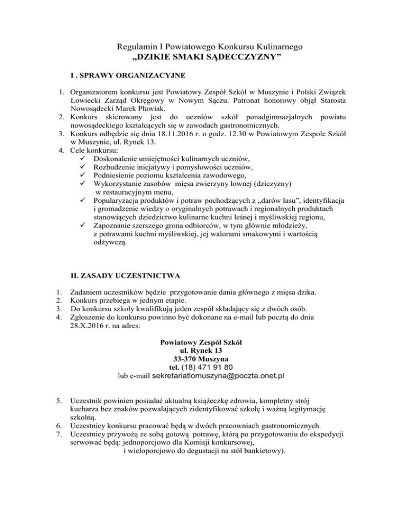 Regulamin I Powiatowego Konkursu Kulinarnego „DZIKIE SMAKI SĄDECCZYZNY” I . SPRAWY ORGANIZACYJNE 1. Organizatorem konkursu jest Powiatowy Zespół Szkół w Muszynie i Polski Związek Łowiecki Zarząd Okręgowy w Nowym Sączu. Patronat honorowy objął Starosta Nowosądecki Marek Pławiak. 2. Konkurs skierowany jest do uczniów szkół ponadgimnazjalnych powiatu nowosądeckiego kształcących się w zawodach gastronomicznych. 3. Konkurs odbędzie się dnia 18.11.2016 r. o godz. 12.30 w Powiatowym Zespole Szkół w Muszynie, ul. Rynek 13. 4. Cele konkursu: Doskonalenie umiejętności kulinarnych uczniów, Rozbudzenie inicjatywy i pomysłowości uczniów, Podniesienie poziomu kształcenia zawodowego, Wykorzystanie zasobów mięsa zwierzyny łownej (dziczyzny) w restauracyjnym menu, Popularyzacja produktów i potraw pochodzących z „darów lasu”, identyfikacja i gromadzenie wiedzy o oryginalnych potrawach i regionalnych produktach stanowiących dziedzictwo kulinarne kuchni leśnej i myśliwskiej regionu, Zapoznanie szerszego grona odbiorców, w tym głównie młodzieży, z potrawami kuchni myśliwskiej, jej walorami smakowymi i wartością odżywczą. II. ZASADY UCZESTNICTWA 1. 2. 3. 4. Zadaniem uczestników będzie przygotowanie dania głównego z mięsa dzika. Konkurs przebiega w jednym etapie. Do konkursu szkoły kwalifikują jeden zespół składający się z dwóch osób. Zgłoszenie do konkursu powinno być dokonane na e-mail lub pocztą do dnia 28.X.2016 r. na adres: Powiatowy Zespół Szkół ul. Rynek 13 33-370 Muszyna tel. (18) 471 91 80 lub e-mail [email protected] 5. 6. 7. Uczestnik powinien posiadać aktualną książeczkę zdrowia, kompletny strój kucharza bez znaków pozwalających zidentyfikować szkołę i ważną legitymację szkolną. Uczestnicy konkursu pracować będą w dwóch pracowniach gastronomicznych. Uczestnicy przywożą ze sobą gotową potrawę, którą po przygotowaniu do ekspedycji serwować będą: jednoporcjowo dla Komisji konkursowej, i wieloporcjowo do degustacji na stół bankietowy). 8. Czas na wykonanie zadania wynosi: 90 minut. 9. Uczestnicy przywożą ze sobą wizytówki z nazwą potrawy na stół bankietowy, recepturę wykonania potrawy, potrzebny sprzęt gastronomiczny i zastawę potrzebną do serwowania potrawy. III. ZASADY ORGANIZACYJNE 1. Koszty przejazdu oraz przypraw i dodatków do wykonania potraw konkursowych pokrywają szkoły uczestniczące w konkursie. 2. Organizator zapewnia uczestnikom stanowisko do pracy wyposażone w podstawowy sprzęt kuchenny, dostęp do kuchenki indukcyjnej lub zwykłej kuchenki elektrycznej, czteropalnikowej z piekarnikiem elektrycznym oraz do pieca konwekcyjnego. 3. Surowiec do wykonania potrawy (mięso dzika) w ilości ok.4kg dostarczy PZŁ Zarząd Okręgowy w Nowym Sączu. (2kg mięsa należy przeznaczyć na wykonanie potrawy konkursowej, pozostałą część należy przeznaczyć na ćwiczenia). 4. Przystąpienie do konkursu następuje poprzez zapoznanie się z regulaminem, przesłanie wypełnionego formularza zgłoszeniowego. IV. PRZEBIEG KONKURSU I PRZEPROWADZENIE OCENY 1. Orientacyjny przebieg konkursu (szczegółowy scenariusz zostanie opracowany bezpośrednio w dniach poprzedzających konkurs, bez zmian pozostanie godzina rejestracji i rozpoczęcia konkursu): 12.30 - rejestracja uczestników; 13.00 - oficjalne rozpoczęcie, losowanie stanowisk, rozpoczęcie pracy przez zespoły konkursowe, program artystyczny, przekazanie potraw do degustacji przez Jury; 14.40 - prezentacja potraw publiczności; 15.40 - ogłoszenie wyników, degustacja potraw. 2. Oceny pracy zespołów konkursowych dokonuje Jury powołane przez Starostę Nowosądeckiego. 3. Praca zespołów konkursowych oceniana będzie pod kątem: smaku potrawy; estetyki podania; sposobu prezentacji; oryginalności i pomysłowości; doboru składników; techniki wykonania. 4. Decyzje Jury są ostateczne. 5. Pytania i wątpliwości należy kierować bezpośrednio do koordynatora konkursu: POWIATOWY ZESPÓŁ SZKÓŁ W MUSZYNIE, Pani Małgorzata Jarząb, tel. 723 754 603 V. NAGRODY 1. Zwycięzcy trzech pierwszych miejsc otrzymują cenne nagrody rzeczowe i dyplomy, pozostali uczestnicy wyróżnienia i dyplomy za udział w konkursie. 2. Dla Opiekunów również przewidziano cenne nagrody. KARTA ZGŁOSZENIA DO KONKURSU „DZIKIE SMAKI SĄDECCZYZNY” 1.Imiona i nazwiska uczestników................................................................ …………………………………………………………………………………… 2.Nazwa Szkoły, adres, telefon kontaktowy................................................ ................................................................................................................. ................................................................................................................. 3.Imię i nazwisko opiekuna ........................................................................ ................................................................................................................. 4.Nazwa dania konkursowego.................................................................... …………………………………………………………………………………… Receptura dania konkursowego( należy dostarczyć w dniu konkursu przy rejestracji): ......................................................................................... .................................................................................................................. .................................................................................................................. .................................................................................................................. .................................................................................................................. ...........................................................................