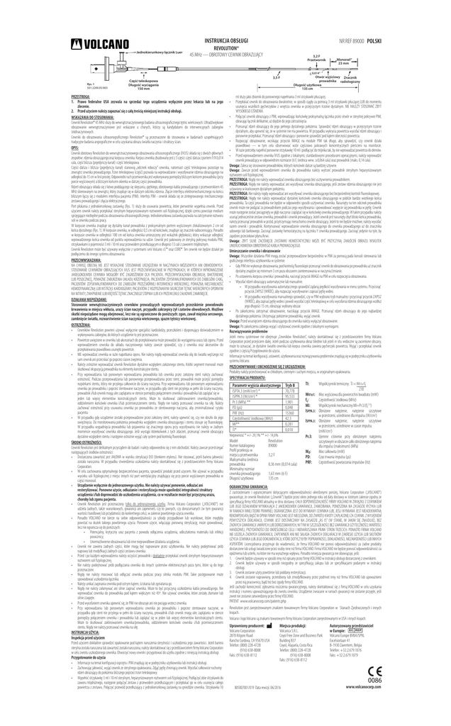 INSTRUKCJA OBSŁUGI Jednokierunkowy łącznik Luer NR REF 89000 POLSKI REVOLUTION® 45 MHz — OBROTOWY CEWNIK OBRAZUJĄCY 3,2 F Przetwornik „Monorail“ 23 mm < 0,014” Rys. 1 501-2200.05/003 3,5 F Część teleskopowa Długość wyciągania 150 mm PRZESTROGA: 1. Prawo federalne USA zezwala na sprzedaż tego urządzenia wyłącznie przez lekarza lub na jego zlecenie. 2. Przed użyciem należy zapoznać się z całą treścią niniejszej instrukcji obsługi. WSKAZANIA DO STOSOWANIA: Cewnik Revolution® 45 MHz służy do wewnątrznaczyniowego badania ultrasonograficznego tętnic wieńcowych. Ultradźwiękowe obrazowanie wewnątrznaczyniowe jest wskazane u chorych, którzy są kandydatami do interwencyjnych zabiegów śródnaczyniowych. Cewniki do obrazowania ultrasonograficznego Revolution® są przeznaczone do stosowania w badaniach uzupełniających tradycyjne badania angiograficzne w celu uzyskania obrazu światła naczynia i struktury ścian. OPIS: Cewnik obrotowy Revolution do wewnątrznaczyniowego obrazowania ultrasonograficznego (IVUS) składa się z dwóch głównych zespołów: rdzenia obrazującego oraz korpusu cewnika. Korpus cewnika zbudowany jest z 3 części: część dalsza z portem F/X 0,014 cala, część bliższa (pojedynczy kanał) i część teleskopowa. Części dalsza i bliższa (pojedynczy kanał) stanowią „odcinek roboczy” cewnika, natomiast część teleskopowa pozostaje na zewnątrz cewnika prowadzącego. Trzon teleskopowy (część) pozwala na wprowadzanie i wycofywanie rdzenia obrazującego na odległość do 15 cm w linii prostej. Odpowiedni ruch przetwornika jest wykonywany pomiędzy bliższym końcem prowadnika (przy porcie wyjściowym) a bliższym końcem okienka w dalszej części prowadnika. Rdzeń obrazujący składa się z łatwo poddającego się skręcaniu, giętkiego, obrotowego kabla prowadzącego z przetwornikiem 45 MHz skierowanym na zewnątrz, który znajduje się w dalszym odcinku rdzenia. Złącze interfejsu elektromechanicznego na końcu bliższym łączy się z modułem interfejsu pacjenta (PIM). Interfejs PIM - cewnik składa się ze zintegrowanego mechanicznego zestawu prowadzącego i złącza elektrycznego. Port płukania z jednokierunkową zastawką (Rys. 1) służy do usuwania powietrza, które pierwotnie wypełnia cewnik. Przed użyciem cewnik należy przepłukać sterylnym heparynizowanym roztworem soli fizjologicznej, dzięki czemu powstaje medium sprzęgające niezbędne podczas obrazowania ultrasonograficznego. Jednokierunkowa zastawka pozwala na zatrzymanie roztworu soli w cewniku podczas pracy. W korpusie cewnika znajduje się dystalny kanał prowadnika z proksymalnym portem wyjściowym zlokalizowanym 2 cm od końca dystalnego (Rys. 1). W korpusie cewnika, w odległości 0,5 cm od końcówki, znajduje się znacznik radiocieniujący. Ponadto w korpusie cewnika w odległości 100 cm od końca cewnika umieszczony jest wskaźnik głębokości, który wskazuje odległość wprowadzonego końca cewnika od punktu wprowadzenia na udzie. Cewnik jest pakowany ze sterylną pokrywą modułu PIM, strzykawkami o pojemności 3 ml i 10 ml oraz przewodem przedłużającym o długości 13 cali z zaworem trójdrożnym. Cewnik Revolution może być używany wyłącznie z systemami serii Volcano s5™ oraz CORE®. Ten cewnik nie będzie działał po podłączeniu do innego systemu obrazowania. PRZECIWWSKAZANIA: NA CHWILĘ OBECNĄ NIE JEST WSKAZANE STOSOWANIE URZĄDZENIA W NACZYNIACH MÓZGOWYCH ANI OBWODOWYCH. STOSOWANIE CEWNIKÓW OBRAZUJĄCYCH IVUS JEST PRZECIWWSKAZANE W PRZYPADKACH, W KTÓRYCH WPROWADZENIE JAKIEGOKOLWIEK CEWNIKA MOGŁOBY BYĆ ZAGROŻENIEM DLA PACJENTA. PRZECIWWSKAZANIA OBEJMUJĄ: BAKTERIEMIĘ LUB POSOCZNICĘ, POWAŻNE ZABURZENIA UKŁADU KRZEPNIĘCIA, PACJENTÓW ZDYSKWALIFIKOWANYCH DO ZABIEGÓW CABG, PACJENTÓW ZDYSKWALIFIKOWANYCH DO ZABIEGÓW PRZEZSKÓRNEJ INTERWENCJI WIEŃCOWEJ, POWAŻNĄ NIESTABILNOŚĆ HEMODYNAMICZNĄ LUB WSTRZĄS KARDIOGENNY, PACJENTÓW Z ROZPOZNANYM SKURCZEM TĘTNIC WIEŃCOWYCH OPORNYM NA NITRATY, ZWAPNIENIE LUB KRĘTOŚĆ TĘTNIC ZNACZNEGO STOPNIA LUB ICH PRZEWLEKŁE CAŁKOWIE ZAMKNIĘCIE. DZIAŁANIA NIEPOŻĄDANE: Stosowanie wewnątrznaczyniowych cewników prowadzących wprowadzanych przezskórnie powodowało krwawienia w miejscu wkłucia, urazy ścian naczyń, przypadki zakrzepicy żył i zatorów obwodowych. Możliwe skutki niepożądane mogą obejmować, lecz nie są ograniczone do poniższych: zgon, zawał mięśnia sercowego, zamknięcie światła, rozwarstwienie ścian naczynia wieńcowego, spazm tętnicy wieńcowej. OSTRZEŻENIA: • Cewników Revolution powinni używać wyłącznie specjaliści kardiolodzy, przeszkoleni i dysponujący doświadczeniem w wykonywaniu zabiegów, do których urządzenie to jest przeznaczone. • Powietrze uwięzione w cewniku lub akcesoriach do przepłukiwania może prowadzić do wystąpienia urazu lub zgonu. Przed wprowadzeniem cewnika do układu naczyniowego należy zawsze sprawdzić, czy z cewnika oraz akcesoriów do przepłukiwania prawidłowo usunięto powietrze. • NIE wprowadzać cewnika w razie napotkania oporu. Nie należy nigdy wprowadzać cewnika siłą do światła węższego niż sam cewnik ani przeciskać go poprzez ciasne zwężenia. • Należy ostrożnie wprowadzać cewnik Revolution dystalnie względem założonego stentu. Krótki segment monorail może skutkować ekspozycją prowadnika na elementy konstrukcyjne stentu. • Przy wprowadzaniu lub ponownym wprowadzaniu prowadnika lub cewnika przez założony stent należy zachować ostrożność. Podczas przeprowadzania lub ponownego przeprowadzania przez stent, prowadnik może przejść pomiędzy rozpórkami stentu, który nie przylega całkowicie do ściany naczynia. Przy wprowadzaniu lub ponownym wprowadzaniu cewnika po prowadniku i poprzez stentowane naczynie, w przypadku gdy stent nie przylega w pełni do ściany naczynia, prowadnik i/lub cewnik mogą ulec zaplątaniu w stencie pomiędzy połą