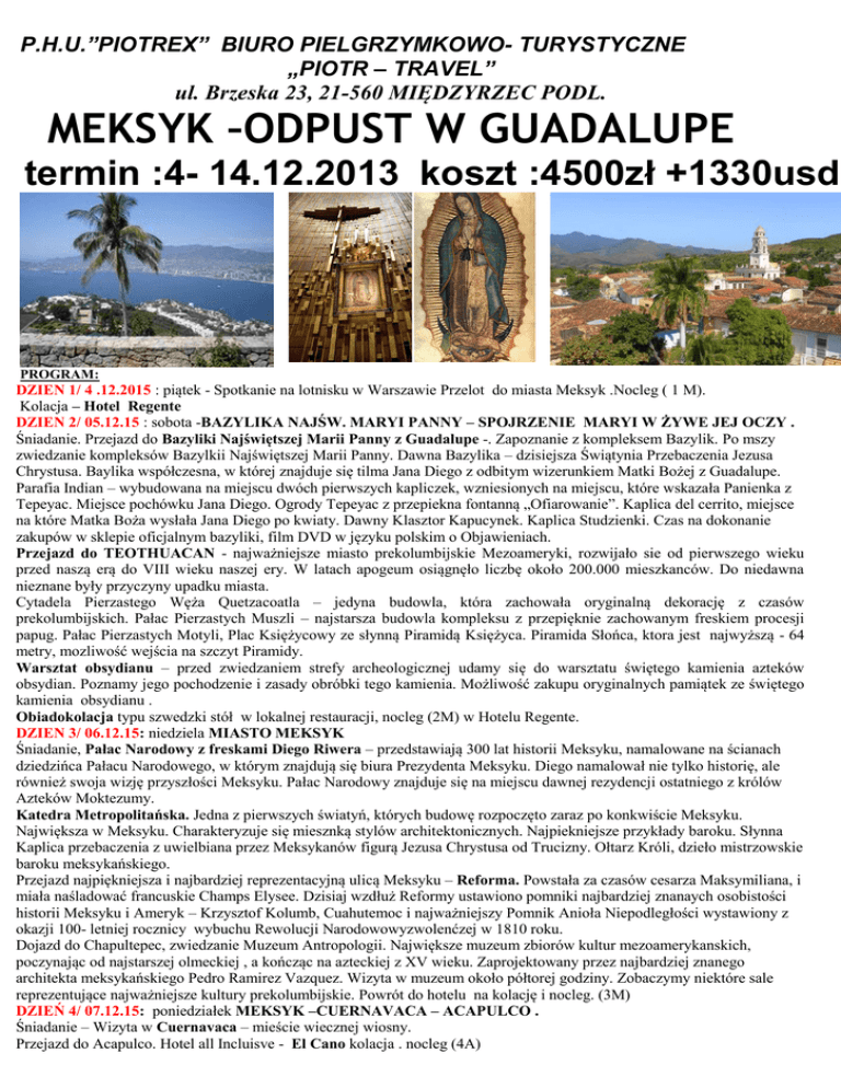 P.H.U.”PIOTREX” BIURO PIELGRZYMKOWO- TURYSTYCZNE „PIOTR – TRAVEL” ul. Brzeska 23, 21-560 MIĘDZYRZEC PODL. MEKSYK –ODPUST W GUADALUPE termin :4- 14.12.2013 koszt :4500zł +1330usd PROGRAM: DZIEN 1/ 4 .12.2015 : piątek - Spotkanie na lotnisku w Warszawie Przelot do miasta Meksyk .Nocleg ( 1 M). Kolacja – Hotel Regente DZIEN 2/ 05.12.15 : sobota -BAZYLIKA NAJŚW. MARYI PANNY – SPOJRZENIE MARYI W ŻYWE JEJ OCZY . Śniadanie. Przejazd do Bazyliki Najświętszej Marii Panny z Guadalupe -. Zapoznanie z kompleksem Bazylik. Po mszy zwiedzanie kompleksów Bazylkii Najświętszej Marii Panny. Dawna Bazylika – dzisiejsza Świątynia Przebaczenia Jezusa Chrystusa. Baylika współczesna, w której znajduje się tilma Jana Diego z odbitym wizerunkiem Matki Bożej z Guadalupe. Parafia Indian – wybudowana na miejscu dwóch pierwszych kapliczek, wzniesionych na miejscu, które wskazała Panienka z Tepeyac. Miejsce pochówku Jana Diego. Ogrody Tepeyac z przepiekna fontanną „Ofiarowanie”. Kaplica del cerrito, miejsce na które Matka Boża wysłała Jana Diego po kwiaty. Dawny Klasztor Kapucynek. Kaplica Studzienki. Czas na dokonanie zakupów w sklepie oficjalnym bazyliki, film DVD w języku polskim o Objawieniach. Przejazd do TEOTHUACAN - najważniejsze miasto prekolumbijskie Mezoameryki, rozwijało sie od pierwszego wieku przed naszą erą do VIII wieku naszej ery. W latach apogeum osiągnęło liczbę około 200.000 mieszkanców. Do niedawna nieznane były przyczyny upadku miasta. Cytadela Pierzastego Węża Quetzacoatla – jedyna budowla, która zachowała oryginalną dekorację z czasów prekolumbijskich. Pałac Pierzastych Muszli – najstarsza budowla kompleksu z przepięknie zachowanym freskiem procesji papug. Pałac Pierzastych Motyli, Plac Księżycowy ze słynną Piramidą Księżyca. Piramida Słońca, ktora jest najwyższą - 64 metry, mozliwość wejścia na szczyt Piramidy. Warsztat obsydianu – przed zwiedzaniem strefy archeologicznej udamy się do warsztatu świętego kamienia azteków obsydian. Poznamy jego pochodzenie i zasady obróbki tego kamienia. Możliwość zakupu oryginalnych pamiątek ze świętego kamienia obsydianu . Obiadokolacja typu szwedzki stół w lokalnej restauracji, nocleg (2M) w Hotelu Regente. DZIEN 3/ 06.12.15: niedziela MIASTO MEKSYK Śniadanie, Pałac Narodowy z freskami Diego Riwera – przedstawiają 300 lat historii Meksyku, namalowane na ścianach dziedzińca Pałacu Narodowego, w którym znajdują się biura Prezydenta Meksyku. Diego namalował nie tylko historię, ale również swoja wizję przyszłości Meksyku. Pałac Narodowy znajduje się na miejscu dawnej rezydencji ostatniego z królów Azteków Moktezumy. Katedra Metropolitańska. Jedna z pierwszych światyń, których budowę rozpoczęto zaraz po konkwiście Meksyku. Największa w Meksyku. Charakteryzuje się miesznką stylów architektonicznych. Najpiekniejsze przykłady baroku. Słynna Kaplica przebaczenia z uwielbiana przez Meksykanów figurą Jezusa Chrystusa od Trucizny. Ołtarz Króli, dzieło mistrzowskie baroku meksykańskiego. Przejazd najpiękniejsza i najbardziej reprezentacyjną ulicą Meksyku – Reforma. Powstała za czasów cesarza Maksymiliana, i miała naśladować francuskie Champs Elysee. Dzisiaj wzdłuż Reformy ustawiono pomniki najbardziej znanaych osobistości historii Meksyku i Ameryk – Krzysztof Kolumb, Cuahutemoc i najważniejszy Pomnik Anioła Niepodległości wystawiony z okazji 100- letniej rocznicy wybuchu Rewolucji Narodowowyzwolenćzej w 1810 roku. Dojazd do Chapultepec, zwiedzanie Muzeum Antropologii. Największe muzeum zbiorów kultur mezoamerykanskich, poczynając od najstarszej olmeckiej , a kończąc na azteckiej z XV wieku. Zaprojektowany przez najbardziej znanego architekta meksykańskiego Pedro Ramirez Vazquez. Wizyta w muzeum około półtorej godziny. Zobaczymy niektóre sale reprezentujące najważniejsze kultury prekolumbijskie. Powrót do hotelu na kolację i nocleg. (3M) DZIEŃ 4/ 07.12.15: poniedziałek MEKSYK –CUERNAVACA – ACAPULCO . Śniadanie – Wizyta w Cuernavaca – mieście wiecznej wiosny. Przejazd do Acapulco. Hotel all Incluisve - El Cano kolacja . nocleg (4A) DZIEN 5 i 6 / 08-09.12.15: wtorek ,środa ACAPULCO – QUEBARDE . pobyt w hotelu i na plaży All Inclusive, Relax wypoczynek nad PACYFIKIEM - wyjątkowo atrakcyjne miejsce do regeneracji sił – kurort światowej sławy. Wyjazd na pokaz skoków do wody z wys. 40 m na Quebarde. Nocleg Możliwość skorzystania z wycieczek fakultatywnych (5A), (6A) DZIEN 7/ 10.12.15 : czwartek ACAPULCO – TAXCO – MEKSYK Śniadanie, rano przejazd do Meksyku, przez stolicę srebra Taxco. Po drodze wizyta w sklepie warsztacie, zapoznanie z produkcja wyrobów ze srebra, degustacja lokalnego drinka Berta. Zwiedzanie Kościoła wybudowanego przez ojca dla syna SANTA PRISCA . Czas na zakupy srebra. Zakwaterowanie w hotelu w Meksyku .Kolacja. Nocleg (7M) DZIEŃ 8/ 11.12.15 : piątek – po siadaniu wyjazd do QURETARO . Msza św. w kościele SANTA CRUZ. Nawiedzimy kościół i klasztor św. Krzyża, ze słynnym i unikatowym drzewem, które rodzi kolce w kształcie krzyża, stare miasto – kolebka walki o niepodległość Meksyku, oraz Wzgórze Dzwonów. Przejazd do TEPOTZOTLAN – przepiękne kolonialne, meksykańskie miasteczko, gdzie znajduje się Muzeum Wicekrólestwa z przepięknym barokowym Kościołem . Przejazd do miasta Meksyk. Zakwaterowanie. Kolacja .Nocleg w hotelu Regente.(8M) DZIEŃ 9/ 12.12.15: WIELKIE UROCZYSTOŚCI w GUADALUPE – MSZA ŚW. ODPUSTOWA /tzw. MSZA RÓŻ / Śniadanie, uczestnictwo w obchodach Objawień Najświętszej Marii Panny z Guadalupe - patronki życia poczętego. Na tę uroczystość przyjeżdżają miliony ludzi , z różnych państw świata i poszczególnych szczepów Indianie. Amerykanie z południa i z północy przyjeżdżają do swojej patronki – do swojej jak JĄ nazywają CESARZOWEJ. Jest to wyjątkowy , niepowtarzalny w całym roku 