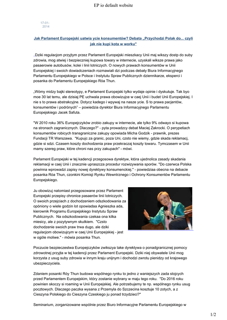EP io default website 17-012014 Jak Parlament Europejski uatwia ycie konsumentów? Debata „Przychodzi Polak do... czyli jak nie kupi kota w worku" Dziki regulacjom przyjtym przez Parlament Europejski mieszkacy Unii maj wikszy dostp do suby zdrowia, mog atwiej i bezpieczniej kupowa towary w internecie, uzyskali wiksze prawa jako pasaerowie autobusów, kolei i linii lotniczych. O nowych prawach konsumentów w Unii Europejskiej i swoich dowiadczeniach rozmawiali dzi podczas debaty Biura Informacyjnego Parlamentu Europejskiego w Polsce i Instytutu Spraw Publicznych dziennikarze, eksperci i posanka do Parlamentu Europejskiego Róa Thun. „Wómy midzy bajki stereotypy, e Parlament Europejski tylko wydaje opinie i dyskutuje. Tak byo moe 30 lat temu, ale dzisiaj PE uchwala prawa obowizujce w caej Unii i budet Unii Europejskiej. I nie s to prawa abstrakcyjne. Dotycz kadego i wpywaj na nasze ycie. S to prawa pacjentów, konsumentów i podrónych” – powiedzia dyrektor Biura Informacyjnego Parlamentu Europejskiego Jacek Safuta. "W 2010 roku 36% Europejczyków zrobio zakupy w internecie, ale tylko 9% odwayo si kupowa na stronach zagranicznych. Dlaczego?" - pyta prowadzcy debat Maciej Zakrocki. O perypetiach konsumentów robicych transgraniczne zakupy opowiada Micha Godzik - prawnik, prezes Fundacji TR Warszawa. "Kupujc za granic, poza Uni, czsto nie wiemy, gdzie skada reklamacj, gdzie si sdzi. Czasem koszty dochodzenia praw przekraczaj koszty towaru. Tymczasem w Unii mamy szereg praw, które chroni nas przy zakupach" - mówi. Parlament Europejski w tej kadencji przegosowa dyrektyw, która ujednolica zasady skadania reklamacji w caej Unii i znacznie upraszcza procedur rozwizywania sporów. "Do czerwca Polska powinna wprowadzi zapisy nowej dyrektywy konsumenckiej." - powiedziaa obecna na debacie posanka Róa Thun, czonkini Komisji Rynku Wewntrznego i Ochrony Konsumentów Parlamentu Europejskiego. Ju obowizuj natomiast przegosowane przez Parlament Europejski przepisy chronice pasaerów linii lotniczych. O swoich przejciach z dochodzeniem odszkodowania za opóniony o wiele godzin lot opowiadaa Agnieszka ada, kierownik Programu Europejskiego Instytutu Spraw Publicznych. Na odszkodowania czekaa ona kilka miesicy, ale z pozytywnym skutkiem. "Czsto dochodzenie swoich praw trwa dugo, ale dziki regulacjom obowizujcym w caej Unii Europejskiej - jest w ogóle moliwe." - mówia posanka Thun. Poczucie bezpieczestwa Europejczyków zwikszya take dyrektywa o ponadgranicznej pomocy zdrowotnej przyjta w tej kadencji przez Parlament Europejski. Dziki niej obywatele Unii mog korzysta z usug suby zdrowia w innym kraju unijnym i dochodzi zwrotu pienidzy od krajowego ubezpieczyciela. Zdaniem posanki Róy Thun budowa wspólnego rynku to jedno z waniejszych zada stojcych przed Parlamentem Europejskim, który zostanie wybrany w maju tego roku. "Do 2016 roku powinien skoczy si roaming w Unii Europejskiej. Ale potrzebujemy te np. wspólnego rynku usug pocztowych. Dlaczego paczka wysana z Przemyla do Szczecina kosztuje 10 zotych, a z Cieszyna Polskiego do Cieszyna Czeskiego ju ponad trzydzieci?" Seminarium, zorganizowane wspólnie przez Biuro Informacyjne Parlamentu Europejskiego w 1/2 EP io default website Polsce i Instytut Spraw Publicznych, byo kolejn z cyklu debat przed zaplanowanymi na maj wyborami do Parlamentu Europejskiego. "Polacy maj bardzo dobr opini o Parlamencie Europejskim, ale jednoczenie mao o nim wiedz. Dziki tej debacie atwiej bdzie im zrozumie, czym Parlament si waciwie zajmuje i jak wielki wpyw ma na ich ycie" - powiedzia prezes ISP Jacek Kucharczyk. Wicej informacji Nowe prawo konsumenckie Uproszczenie zasad leczenia za granic Galeria zdj Podsumowanie spotkania na platformie Storify [ View the story "Jak Parlament Europejski uatwia ycie konsumentów? Debata „Przychodzi Polak do... czyli jak nie kupi kota w worku\"" on Storify] 2/2