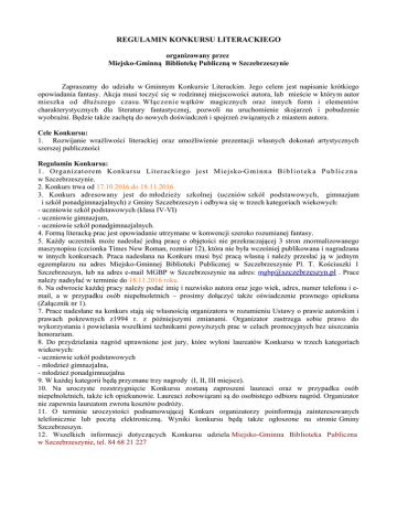 REGULAMIN KONKURSU LITERACKIEGO organizowany przez Miejsko-Gminną Bibliotekę Publiczną w Szczebrzeszynie Zapraszamy do udziału w Gminnym Konkursie Literackim. Jego celem jest napisanie krótkiego opowiadania fantasy. Akcja musi toczyć się w rodzinnej miejscowości autora, lub mieście w którym autor mieszka od dłuższego czasu. Włączenie wątków magicznych oraz innych form i elementów charakterystycznych dla literatury fantastycznej, pozwoli na uruchomienie skojarzeń i pobudzenie wyobraźni. Będzie także zachętą do nowych doświadczeń i spojrzeń związanych z miastem autora. Cele Konkursu: 1. Rozwijanie wrażliwości literackiej oraz umożliwienie prezentacji własnych dokonań artystycznych szerszej publiczności Regulamin Konkursu: 1. Organizatorem Konkursu Literackiego jest Miejsko-G m i n n a B i b l i o t e k a P u b l i c z n a w Szczebrzeszynie. 2. Konkurs trwa od 17.10.2016 do 18.11.2016 3. Konkurs adresowany jest do młodzieży szkolnej (uczniów szkół podstawowych, gimnazjum i szkół ponadgimnazjalnych) z Gminy Szczebrzeszyn i odbywa się w trzech kategoriach wiekowych: - uczniowie szkół podstawowych (klasa IV-VI) - uczniowie gimnazjum, - uczniowie szkół ponadgimnazjalnych. 4. Formą literacką prac jest opowiadanie utrzymane w konwencji szeroko rozumianej fantasy. 5. Każdy uczestnik może nadesłać jedną pracę o objętości nie przekraczającej 3 stron znormalizowanego maszynopisu (czcionka Times New Roman, rozmiar 12), która nie była wcześniej publikowana i nagradzana w innych konkursach. Praca nadesłana na Konkurs musi być pracą własną i należy przesłać ją w jednym egzemplarzu na adres Miejsko-Gminnej Biblioteki Publicznej w Szczebrzeszynie Pl. T. Kościuszki 1 Szczebrzeszyn, lub na adres e-mail MGBP w Szczebrzeszynie na adres: [email protected] . Prace należy nadsyłać w terminie do 18.11.2016 roku. 6. Na odwrocie każdej pracy należy podać imię i nazwisko autora oraz jego wiek, adres, numer telefonu i email, a w przypadku osób niepełnoletnich – prosimy dołączyć także oświadczenie prawnego opiekuna (Załącznik nr 1). 7. Prace nadesłane na konkurs stają się własnością organizatora w rozumieniu Ustawy o prawie autorskim i prawach pokrewnych z1994 r. z późniejszymi zmianami. Organizator zastrzega sobie prawo do wykorzystania i powielania wszelkimi technikami powyższych prac w celach promocyjnych bez uiszczania honorarium. 8. Do przydzielania nagród uprawnione jest jury, które wyłoni laureatów Konkursu w trzech kategoriach wiekowych: - uczniowie szkół podstawowych - młodzież gimnazjalna, - młodzież ponadgimnazjalna 9. W każdej kategorii będą przyznane trzy nagrody (I, II, III miejsce). 10. Na uroczyste rozstrzygnięcie Konkursu zostaną zaproszeni laureaci oraz w przypadku osób niepełnoletnich, także ich opiekunowie. Laureaci zobowiązani są do osobistego odbioru nagród. Organizator nie zapewnia laureatom zwrotu kosztów podróży. 11. O terminie uroczystości podsumowującej Konkurs organizatorzy poinformują zainteresowanych telefonicznie lub pocztą elektroniczną. Wyniki konkursu będą także ogłoszone na stronie Gminy Szczebrzeszyn. 12. Wszelkich informacji dotyczących Konkursu udziela Miejsko-Gminna Biblioteka Publiczna w Szczebrzeszynie, tel. 84 68 21 227 Załącznik nr 1: (imię i nazwisko rodzica/opiekuna*) ……………………………………………………………………… (adres) …….. ………………………………………………………………………………………………. (nr telefonu) ……………………………………………………………………………………………… OŚWIADCZENIE Jako rodzic/opiekun* działając w imieniu i na rzecz Uczestnika/Uczestniczki* Konkursu (imię, nazwisko, wiek) ….....………………………………………………………………………………… niniejszym wyrażam zgodę na jego/jej* udział w Konkursie organizowanym przez Miejsko-Gminną Bibliotekę Publiczną w Szczebrzeszynie na zasadach określonych w Regulaminie, z którymi zapoznałem się i akceptuję. Oświadczam, że praca jest pracą własną dziecka, nieprzedstawianą wcześniej w innych konkursach i wyrażam zgodę na jej rozpowszechnianie przez Organizatora bez wynagrodzenia. *niepotrzebne skreślić ………………………………………………….. data, podpis