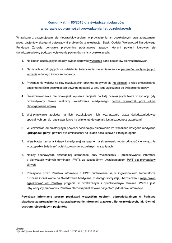 Komunikat nr 85/2016 dla świadczeniodawców w sprawie poprawności prowadzenia list oczekujących W związku z utrzymującymi się nieprawidłowościami w prowadzeniu list oczekujących oraz zgłaszanymi przez pacjentów skargami dotyczącymi problemów z rejestracją, Śląski Oddział Wojewódzki Narodowego Funduszu Zdrowia ponownie przypomina podstawowe zasady, którymi powinni kierować się świadczeniodawcy podczas wpisywania pacjentów na listy oczekujących: 1. Na listach oczekujących należy ewidencjonować wyłącznie dane pacjentów pierwszorazowych 2. Na listach oczekujących na udzielenie świadczenia nie umieszcza się pacjentów kontynuujących leczenie u danego świadczeniodawcy 3. Prowadzenie wpisów na listy oczekujących powinno odbywać się na bieżąco, a więc umieszczanie pacjenta na liście oczekujących powinno nastąpić w dniu jego zgłoszenia do świadczeniodawcy 4. Świadczeniodawca ma obowiązek wpisania pacjenta na listę oczekujących także w sytuacji, gdy przewidywany termin realizacji świadczenia medycznego będzie wykraczał poza okres obowiązywania umowy 5. Wstrzymywanie zapisów na listy oczekujących lub wyznaczanie przez świadczeniodawcę specjalnych dni do zapisywania się na wizytę lub do szpitala jest niezgodne z przepisami 6. W lecznictwie ambulatoryjnym pacjenci posiadający skierowanie ze wskazaną kategorią medyczną „przypadek pilny” powinni być umieszczani na listach oczekujących z taką kategorią 7. Weryfikacja i zmiana kategorii medycznej wskazanej na skierowaniu może odbywać się wyłącznie w przypadku świadczeń opieki zdrowotnej udzielanych w szpitalach 8. Należy dochowywać szczególnej staranności przy wyznaczaniu i przekazywaniu informacji o pierwszych wolnych terminach (PWT), ze szczególnym uwzględnieniem PWT dla przypadków pilnych 9. Przesyłane przez Państwa informacje o PWT publikowane są w Ogólnopolskim Informatorze o Czasie Oczekiwania na Świadczenia Medyczne, z którego korzystają ubezpieczeni i mają prawo egzekwować od Państwa przyjęcie w przekazanym i opublikowanym terminie. Ważne jest, aby wszyscy pracownicy Państwa placówki przekazywali pacjentom jednakowe informacje Powyższą informację proszę przekazać wszystkim osobom odpowiedzialnym w Państwa placówce za prowadzenie oraz przekazywanie informacji z zakresu list oczekujących, jak również osobom rejestrującym pacjentów Źródło: Wydział Spraw Świadczeniobiorców - 32 735 18 86, 32 735 18 81, 32 735 18 12 Przepisy prawne dot. list oczekujących 1. Ustawa z dnia 27 sierpnia 2004 r. o świadczeniach opieki zdrowotnej finansowanych ze środków publicznych (Dz.U.2015.581 j.t.) 2. Rozporządzenie Ministra Zdrowia z dnia 20 czerwca 2008 r. w sprawie zakresu niezbędnych informacji gromadzonych przez świadczeniodawców, szczegółowego sposobu rejestrowania tych informacji oraz ich przekazywania podmiotom zobowiązanym do finansowania świadczeń ze środków publicznych (Dz.U.2016.192 j.t.) 3. Rozporządzenie Ministra Zdrowia z dnia 26 września 2005 r. w sprawie kryteriów medycznych, jakimi powinni kierować się świadczeniodawcy, umieszczając świadczeniobiorców na listach oczekujących na udzielenie świadczenia opieki zdrowotnej (Dz.U.2005.200.1661) 4. Zarządzenie Nr 99/2014/DI Prezesa Narodowego Funduszu Zdrowia z dnia 30 grudnia 2014 r. w sprawie określenia szczegółowych komunikatów sprawozdawczych XML dotyczących list oczekujących (z późn. zm.) 5. Zarządzenie Nr 89/2013/DSOZ Prezesa Narodowego Funduszu Zdrowia z dnia 19 grudnia 2013 roku w sprawie określenia warunków zawierania i realizacji umów w rodzaju: leczenie szpitalne – załącznik 5 do umowy 2a (z późn. zm.) Źródło: Wydział Spraw Świadczeniobiorców - 32 735 18 86, 32 735 18 81, 32 735 18 12