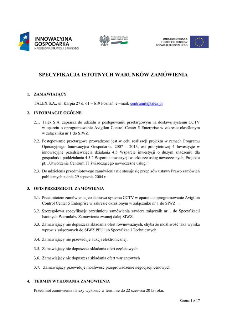 SPECYFIKACJA ISTOTNYCH WARUNKÓW ZAMÓWIENIA 1. ZAMAWIAJĄCY TALEX S.A., ul. Karpia 27 d, 61 – 619 Poznań, e –mail: [email protected] 2. INFORMACJE OGÓLNE 2.1. Talex S.A. zaprasza do udziału w postępowaniu przetargowym na dostawę systemu CCTV w oparciu o oprogramowanie Avigilon Control Center 5 Enterprise w zakresie określonym w załączniku nr 1 do SIWZ. 2.2. Postępowanie przetargowe prowadzone jest w celu realizacji projektu w ramach Programu Operacyjnego Innowacyjna Gospodarka, 2007 – 2013, osi priorytetowej 4 Inwestycje w innowacyjne przedsięwzięcia działania 4.5 Wsparcie inwestycji o dużym znaczeniu dla gospodarki, poddziałania 4.5.2 Wsparcie inwestycji w sektorze usług nowoczesnych, Projektu pt. „Utworzenie Centrum IT świadczącego nowoczesne usługi”. 2.3. Do udzielenia przedmiotowego zamówienia nie stosuje się przepisów ustawy Prawo zamówień publicznych z dnia 29 stycznia 2004 r. 3. OPIS PRZEDMIOTU ZAMÓWIENIA 3.1. Przedmiotem zamówienia jest dostawa systemu CCTV w oparciu o oprogramowanie Avigilon Control Center 5 Enterprise w zakresie określonym w załączniku nr 1 do SIWZ. . 3.2. Szczegółowa specyfikację przedmiotu zamówienia zawiera załącznik nr 1 do Specyfikacji Istotnych Warunków Zamówienia zwanej dalej SIWZ. 3.3. Zamawiający nie dopuszcza składania ofert równoważnych, chyba że możliwość taka wynika wprost z załączonych do SIWZ PFU lub Specyfikacji Technicznych 3.4. Zamawiający nie przewiduje aukcji elektronicznej. 3.5. Zamawiający nie dopuszcza składania ofert częściowych 3.6. Zamawiający nie dopuszcza składania ofert wariantowych 3.7. Zamawiający przewiduje możliwość przeprowadzenie negocjacji cenowych. 4. TERMIN WYKONANIA ZAMÓWIENIA Przedmiot zamówienia należy wykonać w terminie do 22 czerwca 2015 roku. Strona 1 z 17 5. WARUNKI UDZIAŁU W POSTĘPOWANIU 5.1. O zamówienie mogą się ubiegać Wykonawcy, którzy spełniają warunki dotyczące: 5.1.1. posiadania uprawnień do wykonywania określonej działalności lub czynności, jeżeli przepisy prawa nakładają obowiązek ich posiadania 5.1.2. posiadania wiedzy i doświadczenia dotyczące przedmiotu zapytania. Zamawiający nie wprowadza szczegółowych wymagań w tym zakresie. Nie spełnienie chociażby jednego z w/w warunków skutkować będzie wykluczeniem Wykonawcy z postępowania. 6. OŚWIADCZENIA I DOKUMENTY, JAKIE POWINNI ZAŁĄCZYĆ DO OFERTY WYKONAWCY 6.1. Wraz z ofertą Wykonawca winien złożyć następujące dokumenty: a) aktualny odpis z właściwego rejestru albo aktualne zaświadczenie o wpisie do ewidencji działalności gospodarczej, jeżeli odrębne przepisy wymagają wpisu do rejestru lub zgłoszenia do ewidencji działalności gospodarczej, wystawione nie wcześniej niż 1 miesiąc przed upływem terminu składania ofert b) oświadczenie lub aktualne zaświadczenia właściwego naczelnika urzędu skarbowego oraz właściwego oddziału Zakładu Ubezpieczeń Społecznych lub Kasy Rolniczego Ubezpieczenia Społecznego potwierdzających odpowiednio, że Wykonawca nie zalega z opłacaniem podatków, opłat oraz składek na ubezpieczenie zdrowotne i społeczne, lub zaświadczeń, że uzyskał przewidziane prawem zwolnienie, odroczenie lub rozłożenie na raty zaległych płatności lub wstrzymanie w całości wykonania decyzji właściwego organu - wystawione nie wcześniej niż 3 miesiące przed upływem terminu składania ofert c) certyfikat wystawiony przez producenta lub przedstawiciela producenta na terenie RP potwierdzający posiadanie aktualnej certyfikacji w zakresie instalacji, konfiguracji oraz serwisu zaoferowanego rozwiązania. 6.2. Do oferty Wykonawca dołącza oprócz dokumentów, o których mowa w pkt.6.1: a) Formularz cenowy – załącznik nr 3 i 3a, b) Pełnomocnictwo 7. OPIS SPOSOBU PRZYGOTOWANIA OFERTY. 7.1. Wykonawca ma prawo złożyć tylko jedną ofertę 7.2. Treść złożonej oferty musi odpowiadać treści SIWZ. 7.3. Ofertę należy złożyć mailowo na adres [email protected] w formacie pdf. 7.4. Oferta musi być napisana w języku polskim, na maszynie do pisania, komputerze lub inną trwałą i czytelną techniką oraz podpisana przez osobę(y) upoważnioną/ne do reprezentowania Wykonawcy na zewnątrz i zaciągania zobowiązań w wysokości odpowiadającej cenie oferty. Strona 2 z 17 7.5. W przypadku podpisywania oferty lub poświadczenia za zgodność z oryginałem kopii dokumentów przez osob(ę)y nie wymienion(ą)e w dokumencie rejestracyjnym (ewidencyjnym) Wykonawcy, należy do oferty dołączyć stosowne pełnomocnictwo. Pełnomocnictwo powinno być przedstawione w formie oryginału. 7.6. Wszystkie zapisane strony oferty, w tym zapisane strony wszystkich załączników powinny być zaparafowane oraz kolejno ponumerowane. 7.7. Wykonawcy ponoszą wszelkie koszty związane z przygotowaniem i złożeniem oferty. 8. TERMIN ZWIĄZANIA OFERTĄ Termin związania ofertą wynosi 30 dni. Bieg terminu rozpoczyna się wraz upływem terminu składania oferty. 9. MIEJSCE ORAZ TERMIN SKŁADANIA I OTWARCIA OFERT. Ofertę należy przesłać na adres [email protected] do dnia 8 czerwca 2015 r. do godziny 10.00. 10. OSOBY UPRAWNIONE DO POROZUMIEWANIA SIĘ Z WYKONAWCAMI 10.1. Wykonawca może zwrócić się do Zamawiającego o wyjaśnienie treści zawartych w SIWZ. 10.2. Do porozumiewania z Wykonawcami upoważniona jest Katarzyna Bil, e–mail: [email protected] 10.3. Wszelkie dokumenty prosimy przesyłać na adres: [email protected] oraz pocztą na adres Talex S.A., ul. Karpia 27 d, 61 – 619 Poznań. 11. SPOSÓB OBLICZENIA CENY 11.1. Wykonawca powinien wkalkulować w cenę ofertową (brutto) wszystkie jej składniki tj. wszystkie wymagania niniejszej SIWZ oraz obejmować wszelkie koszty, jakie poniesie Wykonawca z tytułu należytej oraz zgodnej z obowiązującymi przepisami realizacji przedmiotu zamówienia w tym również ryzyko wynikające z okoliczności, których nie można było przewidzieć w chwili składania oferty. 11.2. 