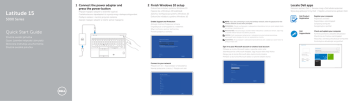 1 Connect the power adapter and press the power button Latitude 15 5000 Series Quick Start Guide Připojte napájecí adaptér a stiskněte vypínač Csatlakoztassa a tápadaptert és nyomja meg a bekapcsológombot Podłącz zasilacz i naciśnij przycisk zasilania Zapojte napájací adaptér a stlačte spínač napájania 2 Finish Windows 10 setup Locate Dell apps Dokončete instalaci systému Windows 10 Fejezze be a Windows 10 beállítását Zakończ konfigurację systemu Windows 10 Dokončite inštaláciu systému Windows 10 Enable Support and Protection Aktivujte možnost Podpora a ochrana Engedélyezze a támogatást és a védelmet Włącz ochronę i pomoc techniczną Povoľte podporu a ochranu Nalezení aplikací Dell | Keresse meg a Dell alkalmazásokat Wyszukaj aplikacje firmy Dell | Nájdite umiestnenie aplikácií Dell Dell SupportAssist Check and update your computer Kontrola počítače a případná aktualizace Ellenőrizze és frissítse számítógépét Wyszukaj i zainstaluj aktualizacje komputera Kontrolujte a aktualizujte svoj počítač POZNÁMKA: Pokud se připojujete k zabezpečené bezdrátové síti, po výzvě zadejte heslo pro přístup k bezdrátové síti. MEGJEGYZÉS: Ha biztonságos vezeték nélküli hálózathoz csatlakozik, kérésre, adja meg a vezeték nélküli hálózat hozzáférési jelszavát. POZNÁMKA: Ak sa pripájate k zabezpečenej bezdrôtovej sieti, zadajte po výzve heslo na prístup k tejto sieti. Sign in to your Microsoft account or create a local account Přihlaste se k účtu Microsoft nebo si vytvořte místní účet Jelentkezzen be a Microsoft fiókjába, vagy hozzon létre helyi fiókot Zaloguj się do konta Microsoft albo utwórz konto lokalne Prihláste sa do konta Microsoft alebo si vytvorte lokálne konto Connect to your network Připojte se k síti | Kapcsolódjon a hálózatához Nawiąż połączenie z siecią | Pripojte sa k sieti Register your computer Registrace počítače Regisztrálja a számítógépét Zarejestruj komputer Zaregistrujte si počítač NOTE: If you are connecting to a secured wireless network, enter the password for the wireless network access when prompted. UWAGA: Jeśli nawiązujesz połączenie z zabezpieczoną siecią bezprzewodową, wprowadź hasło dostępu do sieci po wyświetleniu monitu. Stručná úvodní příručka Gyors üzembe helyezési útmutató Skrócona instrukcja uruchomienia Stručná úvodná príručka Dell Product Registration Product support and manuals Podpora a příručky k produktům Terméktámogatás és kézikönyvek Pomoc techniczna i podręczniki Podpora a príručky produktu Contact Dell Kontaktujte společnost Dell | Kapcsolatfelvétel a Dell-lel Kontakt z firmą Dell | Kontaktujte Dell Regulatory and safety Regulace a bezpečnost Szabályozások és biztonság Przepisy i bezpieczeństwo Zákonom vyžadované a bezpečnostné informácie Regulatory model Regulační model | Szabályozó modell Model | Regulačný model Dell.com/support Dell.com/support/manuals Features Funkce | Jellemzők | Funkcje | Vlastnosti Dell.com/support/windows Dell.com/contactdell Dell.com/regulatory_compliance 1. Síťový konektor 15. Konektor náhlavní sady 1. Złącze sieciowe 15. Złącze zestawu słuchawkowego 2. Konektor VGA 16. Čtečka otisků prstů (volitelná) 2. Złącze VGA 16. Czytnik linii papilarnych (opcjonalny) 3. Slot pro karty SIM (volitelný) 3. Gniazdo karty SIM (opcjonalne) 4. Kamera 17. Bezkontaktní čtečka čipových karet (volitelná) 4. Kamera 17. Czytnik kart zbliżeniowych (opcjonalny) 5. Kontrolka stavu kamery 18. Indikátor stavu baterie 5. Lampka stanu kamery 18. Lampka stanu akumulatora 6. Konektor HDMI 19. Indikátor činnosti pevného disku 6. Złącze HDMI 19. Lampka aktywności dysku twardego 7. Konektor USB 3.0 20. Indikátor stavu napájení 20. Lampka stanu zasilania 8. Konektor napájení 7. Złącze USB 3.0 21. Reproduktory 21. Głośniki 9. Duální mikrofony 8. Złącze zasilania 22. Dotyková podložka 9. Zestaw mikrofonów cyfrowych 22. Tabliczka dotykowa 10. Vypínač 11. Slot bezpečnostního kabelu P48F 12. Konektor USB 3.0 s technologií PowerShare Regulatory type Regulační typ | Szabályozó típus Typ | Regulačný typ P48F001 Computer model Model počítače | Számítógép modell Model komputera | Model počítača Latitude 15-E5570 13. Konektor USB 3.0 Printed in China. © 2015 Microsoft Corporation. 2015-08 10. Przycisk zasilania 24. Konektor Thunderbolt 3 (volitelný) 11. Gniazdo linki antykradzieżowej 25. Dokovací konektor 12. Złącze USB 3.0 z funkcją PowerShare 26. Servisní štítek 13. Złącze USB 3.0 14. Czytnik kart pamięci SD 14. Čtečka paměťových karet SD 23. Czytnik kart inteligentnych (opcjonalny) 24. Złącze Thunderbolt 3 (opcjonalne) 25. Złącze dokowania 26. Etykieta ze znacznikiem serwisowym 1. Network connector 15. Headset connector 1. Hálózati csatlakozó 15. Fejhallgató csatlakozó 1. Sieťový konektor 15. Konektor náhlavnej súpravy 2. VGA connector 16. Fingerprint reader (optional) 2. VGA csatlakozó 16. Ujjlenyomat leolvasó (opcionális) 2. Konektor VGA 16. Čítačka odtlačkov prstov (voliteľná) 3. SIM-card slot (optional) 3. SIM kártya nyílás (opcionális) 4. Kamera 17. Érintésmentes SmartCard olvasó (opcionális) 3. Zásuvka karty SIM (voliteľná) 4. Camera 17. Contactless smart card reader (optional) 4. Kamera 17. Bezkontaktová čítačka kariet Smart (voliteľná) 5. Camera-status light 18. Battery-status light 5. Kamera állapot jelzőfény 18. Akkumulátor állapot jelzőfény 5. Kontrolka stavu kamery 18. Kontrolka stavu batérie 6. HDMI connector 19. Hard-drive activity light 6. HDMI csatlakozó 6. Konektor HDMI 19. Kontrolka aktivity pevného disku 7. USB 3.0 connector 20. Power-status light 7. USB 3.0 csatlakozó 19. Merevlemez-meghajtó aktivitás jelzőfény 7. Konektor USB 3.0 20. Kontrolka stavu napájania 8. Power connector 21. Speakers 8. Tápcsatlakozó 20. Beka