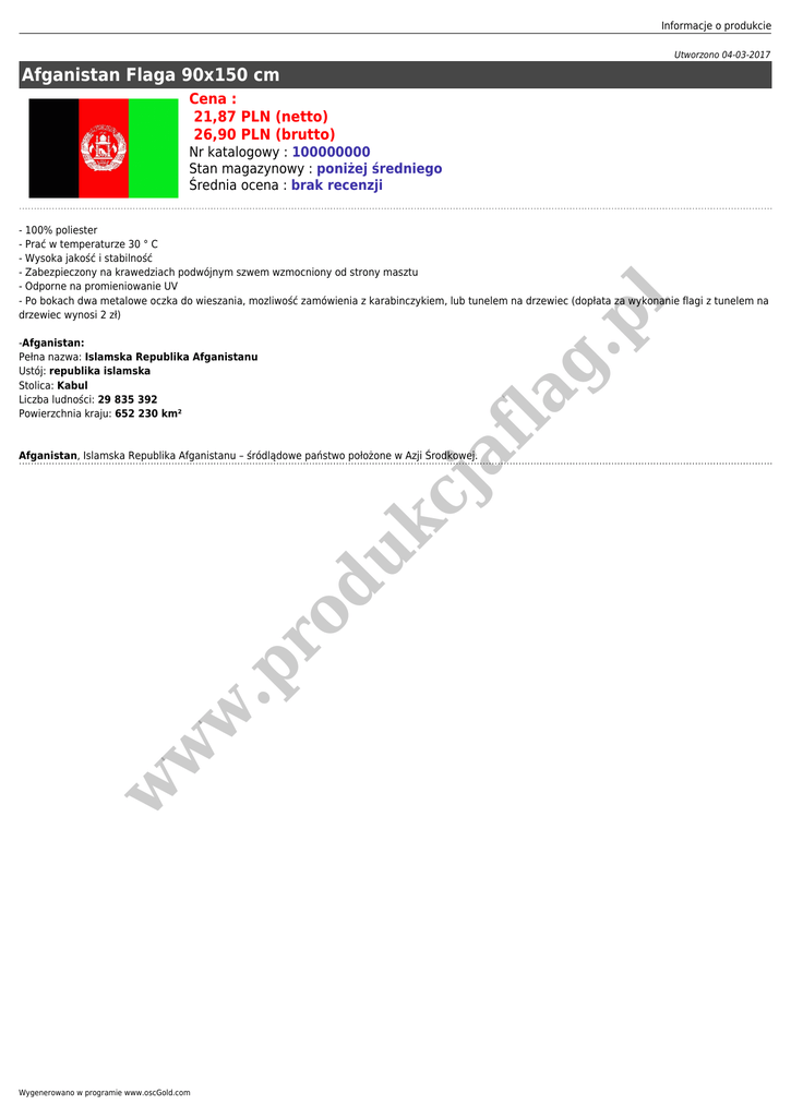 Informacje o produkcie Utworzono 04-03-2017 Afganistan Flaga 90x150 cm Cena : 21,87 PLN (netto) 26,90 PLN (brutto) Nr katalogowy : 100000000 Stan magazynowy : poniżej średniego Średnia ocena : brak recenzji .p l - 100% poliester - Prać w temperaturze 30 ° C - Wysoka jakość i stabilność - Zabezpieczony na krawedziach podwójnym szwem wzmocniony od strony masztu - Odporne na promieniowanie UV - Po bokach dwa metalowe oczka do wieszania, mozliwość zamówienia z karabinczykiem, lub tunelem na drzewiec (dopłata za wykonanie flagi z tunelem na drzewiec wynosi 2 zł) af la g -Afganistan: Pełna nazwa: Islamska Republika Afganistanu Ustój: republika islamska Stolica: Kabul Liczba ludności: 29 835 392 Powierzchnia kraju: 652 230 km² w w w .p ro du kc j Afganistan, Islamska Republika Afganistanu – śródlądowe państwo położone w Azji Środkowej. Wygenerowano w programie www.oscGold.com