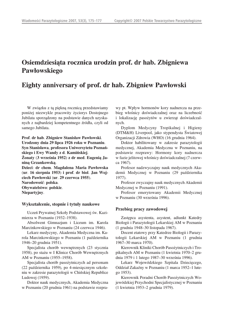 Wiadomoœci Parazytologiczne 2007, 53(3), 175–177 Copyright© 2007 Polskie Towarzystwo Parazytologiczne Osiemdziesiąta rocznica urodzin prof. dr hab. Zbigniewa Pawłowskiego Eighty anniversary of prof. dr hab. Zbigniew Pawłowski W związku z tą piękną rocznicą przedstawiamy poniżej niezwykle pracowity życiorys Dostojnego Jubilata sporządzony na podstawie danych uzyskanych z najbardziej kompetentnego źródła, czyli od samego Jubilata. Prof. dr hab. Zbigniew Stanisław Pawłowski. Urodzony dnia 29 lipca 1926 roku w Poznaniu. Syn Stanisława, profesora Uniwersytetu Poznańskiego i Ewy Wandy z d. Kamińskiej. Żonaty (3 września 1952) z dr med. Eugenią Janiną Grzankowską. Dzieci: dr chem. Magdalena Maria Pawłowska (ur. 16 sierpnia 1953) i prof. dr biol. Jan Wojciech Pawłowski (ur. 29 czerwca 1955). Narodowość: polska. Obywatelstwo: polskie. Niepartyjny. wy pt. Wpływ hormonów kory nadnercza na przebieg włośnicy doświadczalnej oraz na liczebność i lokalizację pasożytów u zwierząt doświadczalnych. Dyplom Medycyny Tropikalnej i Higieny (DTM&H) Liverpool, jako stypendysta Światowej Organizacji Zdrowia (WHO) (16 grudnia 1964). Doktor habilitowany w zakresie parazytologii medycznej, Akademia Medyczna w Poznaniu, na podstawie rozprawy: Hormony kory nadnercza w fazie jelitowej włośnicy doświadczalnej (7 czerwca 1967). Profesor nadzwyczajny nauk medycznych Akademii Medycznej w Poznaniu (29 października 1977). Profesor zwyczajny nauk medycznych Akademii Medycznej w Poznaniu (1991). Profesor emerytowany Akademii Medycznej w Poznaniu (30 września 1996). Wykształcenie, stopnie i tytuły naukowe Przebieg pracy zawodowej Uczeń Prywatnej Szkoły Podstawowej św. Kazimierza w Poznaniu (1932–1938). Absolwent Gimnazjum i Liceum im. Karola Marcinkowskiego w Poznaniu (24 czerwca 1946). Lekarz medycyny, Akademia Medyczna im. Karola Marcinkowskiego w Poznaniu (1 października 1946–20 grudnia 1951). Specjalista chorób wewnętrznych (23 stycznia 1958), po stażu w I Klinice Chorób Wewnętrznych AM w Poznaniu (1955–1958). Specjalista chorób pasożytniczych ad personam (22 października 1959), po 4−miesięcznym szkoleniu w zakresie parazytologii w Chińskiej Republice Ludowej (1959). Doktor nauk medycznych, Akademia Medyczna w Poznaniu (20 grudnia 1961) na podstawie rozpra- Zastępca asystenta, asystent, adiunkt Katedry Biologii i Parazytologii Lekarskiej AM w Poznaniu (1 grudnia 1948–30 listopada 1967). Docent etatowy przy Katedrze Biologii i Parazytologii Lekarskiej AM w Poznaniu (1 grudnia 1967–30 marca 1970). Kierownik Kliniki Chorób Pasożytniczych i Tropikalnych AM w Poznaniu (1 kwietnia 1970–2 grudnia 1979 i 1 lutego 1987–30 września 1996). Lekarz Wojewódzkiego Szpitala Dziecięcego, Oddział Zakaźny w Poznaniu (1 marca 1952–1 lutego 1953). Kierownik Poradni Chorób Pasożytniczych Wojewódzkiej Przychodni Specjalistycznej w Poznaniu (1 kwietnia 1953–2 grudnia 1979). 176 Dyrektor Instytutu Mikrobiologii i Chorób Zakaźnych Akademii Medycznej w Poznaniu (1 października 1978–2 grudnia 1979). Kierownik działu IPI (Intestinal Parasitic Infections), Programu Choroby Pasożytnicze (PDP — Parasitic Diseases Programme) Światowej Organizacji Zdrowia w Genewie (2 grudnia 1979–31 października 1986, delegowany z Akademii Medycznej w Poznaniu). Opiekun naukowy 2 habilitantów i promotor 10 doktorantów. Dorobek naukowy Autor 616 publikacji (do roku 2005), w tym: 80 prac oryginalnych, 13 podsumowań prac badawczych i analiz, 122 prace poglądowe, 135 streszczeń zjazdowych, 33 dokumenty WHO, 27 monografii i opracowań redakcyjnych, 109 rozdziałów w książkach i podręcznikach (w tym 33 w USA i 5 w UK), 97 innych, oraz 11 prac niepublikowanych1. Pełnione funkcje w ciałach kolegialnych Polskie Towarzystwo Parazytologiczne (sekretarz Zarządu Głównego 1962–1964; przewodniczący Oddziału Poznańskiego 1966–1970; wiceprezes 1970–1973, prezes 1973–1976). Polskie Towarzystwo Epidemiologów i Lekarzy Chorób Zakaźnych (wiceprezes 1975–1978, członek Zarządu 1979). Europejska Federacja Parazytologów (wiceprezydent 1973–1980). Międzynarodowa Komisja Włośnicowa (sekretarz generalny 1972–1976, prezydent 1976–1980). Rada Naukowa przy Ministrze Zdrowia i Opieki Społecznej: Komisja ds. Parazytologii Lekarskiej (sekretarz naukowy 1961–1974), Zespół ds. Chorób Tropikalnych (sekretarz naukowy 1966–1974), Zespół ds. Chorób Pasożytniczych i Tropikalnych (przewodniczący 1974–1978). Komitet ds. mianownictwa chorób (przewodniczący 1978–1979). Ministerstwo Zdrowia i Opieki Społecznej, Komisja Leków (członek 1988–1991). Nadzór specjalistyczny: Krajowy Zespół ds. Chorób Zakaźnych (członek 1975–1979), Z. Paw³owski Krajowy Zespół w dziedzinie medycyny tropikalnej (członek 1977–1980). Komisja epidemiologiczna Rady Sanitarno−Epidemiologicznej przy Głównym Inspektorze Sanitarnym (członek 1993–1998). Polska Akademia Nauk, Komitet Parazytologii (członek 1973–1979, 1987–2006, wiceprzewodniczący 1990–1996). Polska Akademia Nauk, Komitet Etiologii i Patogenezy Zakażeń Człowieka (członek 1996–1998). Główny wykonawca czterech 4−letnich programów badawczych z Centers for Disease Control and Prevention, Atlanta GA, USA w ramach współpracy naukowej polsko−amerykańskiej (1972–1981 i 1990–2000). Fundacja pomocy humanitarnej „Redemptoris Missio” — Medicus Mundi Poland (jeden z 3 fundatorów — 1992 — nadal, przewodniczący Rady Fundacji 1992–2004). Rada Europejskich Szkół i Instytutów Tropikalnych (członek 1969–1979 i 1987–1996, prezydent 1978). Ekspert Światowej Organizacji Zdrowia, (1972–1980 i 1987–2007). WHO Informal Working Group on Echinococcosis (przewodniczący sekcji medycznej 1988–1994, członek 1994–2006). United Nations Children's Fund, konsultant (1989). International Zoonosis Association (wiceprezes 1989–1991). Unia Europejska, program TEMPUS, (ki