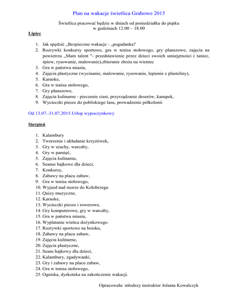 Plan na wakacje świetlica Grabowo 2015 Świetlica pracować będzie w dniach od poniedziałku do piątku w godzinach 12.00 – 18.00 Lipiec 1. Jak spędzić „Bezpieczne wakacje - „pogadanka? 2. Rozrywki konkursy sportowe, gra w tenisa stołowego, gry planszowe, zajęcia na powietrzu „Mam talent "- przedstawienie przez dzieci swoich umiejętności ( taniec, śpiew, rysowanie, malowanie),zbieranie zboża na wieniec 3. Gra w państwa miasta, 4. Zajęcia plastyczne (wycinanie, malowanie, rysowanie, lepienie z plasteliny), 5. Karaoke, 6. Gra w tenisa stołowego, 7. Gry planszowe, 8. Zajęcia kulinarne - pieczenie ciast, przyrządzanie deserów, kanapek, 9. Wycieczki piesze do pobliskiego lasu, prowadzenie półkolonii Od 13.07.-31.07.2015.Urlop wypoczynkowy Sierpień 1. Kalambury 2. Tworzenie i układanie krzyżówek, 3. Gry w szachy, warcaby, 4. Gry w pamięć, 5. Zajęcia kulinarne, 6. Seanse bajkowe dla dzieci, 7. Konkursy, 8. Zabawy na placu zabaw, 9. Gra w tenisa stołowego, 10. Wyjazd nad morze do Kołobrzegu 11. Quizy muzyczne, 12. Karaoke, 13. Wycieczki piesze i rowerowe, 14. Gry komputerowe, gry w warcaby, 15. Gra w państwa miasta, 16. Wyplatanie wieńca dożynkowego. 17. Rozrywki sportowe na boisku, 18. Zabawy na placu zabaw, 19. Zajęcia kulinarne, 20. Zajęcia plastyczne, 21. Seans bajkowy dla dzieci, 22. Kalambury, zgadywanki, 23. Gry i zabawy na placu zabaw, 24. Gra w tenisa stołowego, 25. Ogniska, dyskoteka na zakończenie wakacji. Opracowała: młodszy instruktor Jolanta Kowalczyk