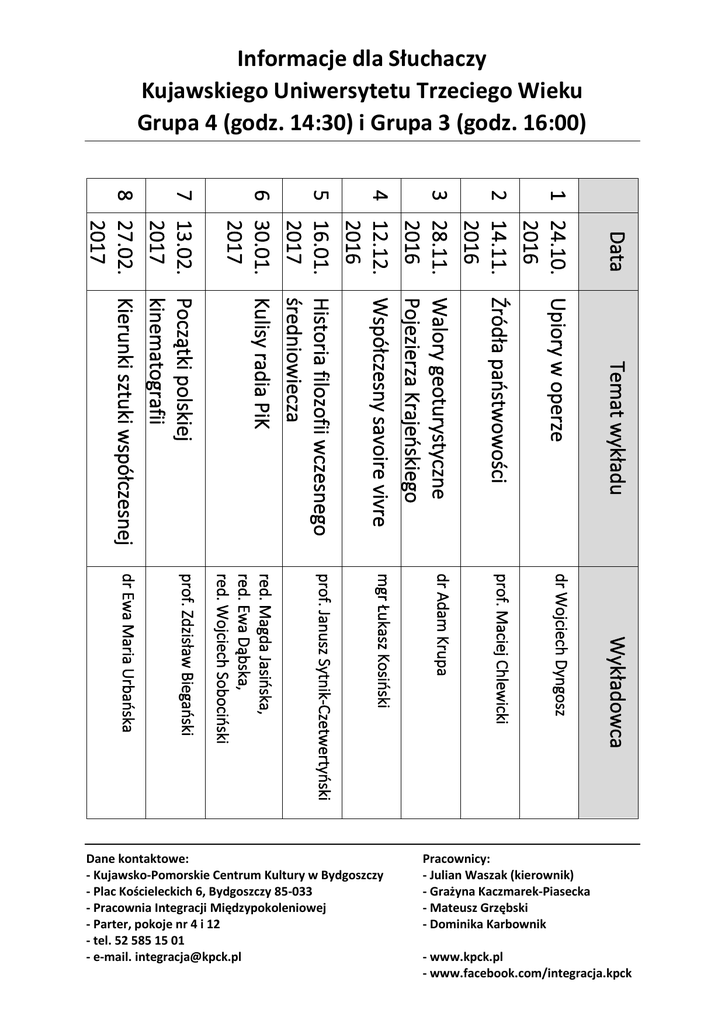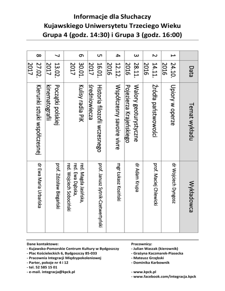 Informacje dla Słuchaczy Kujawskiego Uniwersytetu Trzeciego Wieku Grupa 4 (godz. 14:30) i Grupa 3 (godz. 16:00) 1 2 3 4 5 6 Data 24.10. 2016 14.11. 2016 28.11. 2016 12.12. 2016 16.01. 2017 30.01. 2017 7 13.02. 2017 8 27.02. 2017 Wykładowca dr Wojciech Dyngosz Temat wykładu Upiory w operze prof. Maciej Chlewicki dr Ewa Maria Urbańska prof. Zdzisław Biegański red. Magda Jasińska, red. Ewa Dąbska, red. Wojciech Sobociński prof. Janusz Sytnik-Czetwertyński mgr Łukasz Kosiński dr Adam Krupa Źródła państwowości Walory geoturystyczne Pojezierza Krajeńskiego Współczesny savoire vivre Historia filozofii wczesnego średniowiecza Kulisy radia PiK Początki polskiej kinematografii Kierunki sztuki współczesnej Pracownicy: - Julian Waszak (kierownik) - Grażyna Kaczmarek-Piasecka - Mateusz Grzębski - Dominika Karbownik - www.kpck.pl - www.facebook.com/integracja.kpck Dane kontaktowe: - Kujawsko-Pomorskie Centrum Kultury w Bydgoszczy - Plac Kościeleckich 6, Bydgoszczy 85-033 - Pracownia Integracji Międzypokoleniowej - Parter, pokoje nr 4 i 12 - tel. 52 585 15 01 - e-mail. [email protected] Informacje dla Słuchaczy Kujawskiego Uniwersytetu Trzeciego Wieku Grupa 4 (godz. 14:30) i Grupa 3 (godz. 16:00) Uroczysta Inauguracja Roku Akademickiego 2016/17 Szanowni Państwo, inauguracja roku akademickiego Kujawskiego Uniwersytetu Trzeciego Wieku odbędzie się w czwartek 6 października 2016 roku o godz. 16.00 w Filharmonii Pomorskiej im. Ignacego Jana Paderewskiego w Bydgoszczy przy ul. Andrzeja Szwalbego 6. Uroczystość uświetni wykład zatytułowany „Co wiemy, a co chcielibyśmy wiedzieć o umyśle?” który wygłosi dr hab. Andrzej Klawiter z Uniwersytetu Adama Mickiewicza w Poznaniu. Wstęp za okazaniem czerwonego indeksu słuchacza – Obsługa będzie przy wejściu sprawdzała pieczęć na semestr zimowy 2016/17. Osoby, które nie okażą indeksu przy wejściu lub nie będę miały uiszczonej opłaty semestralnej nie zostaną wpuszczone na salę. Bardzo prosimy stosować się do zaleceń i próśb Obsługi Filharmonii Pomorskiej w dniu Inauguracji. Jeżeli Pracownicy proszą Państwa o nie wchodzenie na salę, to robią to z troski o Państwa bezpieczeństwo i dobry przebieg imprezy. Prosimy o wyrozumiałość i cierpliwość. Opłata semestralna to 30 złotych – opłaty przyjmujemy i wydajemy indeksy w dniach od 1 do 26 września. Bardzo prosimy o wpłacanie odliczonych kwot! Nie będziemy rozmieniać banknotów o dużych nominałach. Nie będziemy przyjmować wpłat i wydawać indeksów podczas uroczystej inauguracji roku akademickiego. Nie będziemy przyjmować wpłat i wydawać indeksów przed wykładami w MULTIKINIE. Miejsce odbywania się wykładów Wykłady będą odbywać się w poniedziałki według harmonogramu Kujawskiego Uniwersytetu Trzeciego Wieku w bydgoskim MULTIKINIE przy ul. marsz. Ferdynanda Focha 48. Wykłady będą odbywały się w sali nr 7 – indeksy przed wejściem będzie sprawdzała Obsługa MULTIKINA przy bramkach biletowych, a lista obecności będzie sprawdzana przez Pracowników PIM przed wejściem na salę nr 7. Przy każdorazowym wyjściu i ponownym wejściu do MULTIKINA prosimy okazywać indeksy Obsłudze przy bramce biletowej. Bardzo prosimy o przychodzenie na wykłady grupy do której Państwo należycie. Jeżeli Słuchacz przyjdzie na wykład nie swojej grupy, to zostanie wpuszczony na salę dopiero wtedy gdy pozostali Słuchacze zajmą już miejsca i będzie mógł zająć wolne miejsce jeżeli takie pozostanie. Dojazd autobusami linii nr 54, 56, 61, 62, 71, 77, 79 oraz tramwajami linii nr 1, 3, 5, 8. Opiekę merytoryczną nad Kujawskim UTW sprawuje Rada Naukowo-Programowa: • dr hab. Janusz Sytnik-Czetwertyński (Przewodniczący Rady) • prof. dr hab. Kornelia Kędziora-Kornatowska • prof. dr hab. Janusz Stanecki • prof. dr hab. Adam Sudoł • prof. dr hab. Ewa Spychaj-Fabisiak • dr hab. Małgorzata Grela • dr hab. Anna Bochenek • dr hab. Zdzisław Biegański • dr hab. Maciej Chlewicki • ks. dr Sylwester Warzyński Dane kontaktowe: - Kujawsko-Pomorskie Centrum Kultury w Bydgoszczy - Plac Kościeleckich 6, Bydgoszczy 85-033 - Pracownia Integracji Międzypokoleniowej - Parter, pokoje nr 4 i 12 - tel. 52 585 15 01 - e-mail. [email protected] Pracownicy: - Julian Waszak (kierownik) - Grażyna Kaczmarek-Piasecka - Mateusz Grzębski - Dominika Karbownik - www.kpck.pl - www.facebook.com/integracja.kpck