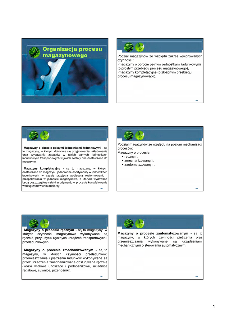 Organizacja procesu magazynowego Podział magazynów ze względu zakres wykonywanych czynności : •magazyny o obrocie pełnymi jednostkami ładunkowymi (o prostym przebiegu procesu magazynowego), •magazyny kompletacyjne (o złożonym przebiegu procesu magazynowego). 184 Magazyny o obrocie pełnymi jednostkami ładunkowymi - są to magazyny, w których dokonuje się przyjmowania, składowania oraz wydawania zapasów w takich samych jednostkach ładunkowych transportowych w jakich zostały one dostarczone do magazynu. Podział magazynów ze względu na poziom mechanizacji procesów: Magazyny o procesie: • ręcznym, • zmechanizowanym, • zautomatyzowanym. Magazyny kompletacyjne - są to magazyny, w których dostarczane do magazynu jednorodne asortymenty w jednostkach ładunkowych w czasie przyjęcia podlegają rozformowaniu i przepakowaniu w jednostki magazynowe, z których wydawane będą poszczególne sztuki asortymentu w procesie kompletowania według zamówienia odbiorcy. 185 Magazyny o procesie ręcznym - są to magazyny, w których czynności magazynowe wykonywane są ręcznie, przy użyciu ręcznych urządzeń transportowych i przeładunkowych. 186 Magazyny o procesie zautomatyzowanym - są to magazyny, w których czynności piętrzenia oraz przemieszczania wykonywane są urządzeniami mechanicznymi o sterowaniu automatycznym. Magazyny o procesie zmechanizowanym - są to magazyny, w których czynności przeładunków, przemieszczania i piętrzenia ładunków wykonywane są przez urządzenia zmechanizowane obsługiwane ręcznie (wózki widłowe unoszące i podnośnikowe, układnice regałowe, suwnice, przenośniki). 187 188 1 Czynniki wpływające na zagospodarowanie powierzchni magazynowej: • sposób realizacji magazynowych procesów przeładunkowych, • rodzaj technologicznego procesu magazynowego: - prosty, realizowany w magazynach o obrocie jednostkami ładunkowymi transportowymi, bez konieczności ich przeformowywania przy przyjmowaniu, kompletacji przy wydawaniu, - złożony, realizowany w magazynach kompletacyjnych, w których dokonywane jest przeformowywanie jednostek ładunkowych transportowych na jednostki magazynowe, kompletacja wewnątrz magazynu, formowanie jednostek zbiorczych według zamówienia odbiorcy. Metody rozmieszczenia zapasów w sferze składowania: •według stałych miejsc składowania, •według wolnych miejsc składowania, •według częstotliwości wydawania: A - asortymenty o najwyższej częstotliwości wydań, B - asortymenty o średniej częstotliwości, C - asortymenty o najniższej częstotliwości. 189 Ciężar a rozmieszczenie • W grupie asortymentowej A, B lub C znajdują się odpowiednio ładunki: 190 Wymiary a rozmieszczenie • Rozmieszczanie asortymentów w magazynie zmechanizowanym kompletacyjnym według rodzaju jednostek ładunkowych: – ciężkie o masie 600-1000 kg, składowanie w najniższych gniazdach segmentów (poziom 1), – średnie (400-600 kg), składowanie w średnich gniazdach (poziom 2), – lekkie (do 400 kg), składowanie w najwyższych gniazdach (poziom 3). – - grupa I - (wyroby ponadgabarytowe), które charakteryzują się wymiarami większymi od wymiaru znormalizowanej paletowej jednostki ładunkowej (1200 x 800 x 1000 mm) przez co nie mieszczą się w normalnych gniazdach regałowych. – - grupa II - (wyroby normalne), które umożliwiają tworzenie znormalizowanych jednostek paletowych (palety skrzyniowe i płaskie o wymiarach 1200 x 800 x 1000 mm), – - grupa III - (wyroby małogabarytowe) wymagające składowania w pojemnikach magazynowych. • Wynika to z warunków: – bezpieczeństwa pracy, – wydajności przeładunkowej, – techniczno-eksploatacyjnych. 191 192 Procesy magazynowe 2 Podstawowe procesy magazynowe • Przepływ towarów – przyjmowanie – składowanie – kompletacja – wydawanie • przepływ informacji Przyjmowanie • przyjęcie – wewnętrzne, – zewnętrzne • • • • rozładunek, sortowanie, identyfikacja kontrola – ilościowa, – jakościowa • przygotowanie do składowania • przekazanie do strefy składowania Składowanie • • • • odbiór towaru ze strefy przyjęcia, rozmieszczenie w strefie składowania, przechowywanie przekazanie do strefy kompletacji. Wydawanie • pakowanie i formowanie jednostek transportowych (o ile nie zostały sformowane wcześniej) • kontrola wydania • załadunek środków transportu, Kompletowanie • przygotowanie jednostek ładunkowych dla potrzeb kompletacji • kompletowanie zamówień • kontrola ilościowa • pakowanie i formowanie jednostek transportowych • przemieszczanie do strefy wydań Kompletacja • kompletacja może być prowadzona w strefie składowania lub w wydzielonej strefie kompletacji 3 Metody kompletacji • wg zamówień • według asortymentu Metody kompletacji • człowiek do towaru • towar do człowieka Przekazywanie poleceń kompletacji • • • • lista kompletacyjna etykiety terminal radiowy technologia świetlna 4