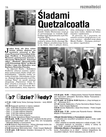 rozmaitoci 14 ladami Quetzalcoatla dzi³ do upadku pañstwo Azteków. Indiañski w³adca Montezuma wzi¹³ go za powracaj¹cego ze wschodu bia³obrodego boga Quetzalcoatla czyli Pierzastego Wê¿a. Fotografie Barbary Stawickiej-Pireckiej to ulotne chwile obecnego Meksyku. Zdjêcia przedstawiaj¹ bawi¹ce siê dzieci, dom w pe³nym s³oñcu, ulicê, siedz¹cego w oknie kota. Pokazuj¹ ¿ycie realne, dalekie od koloryzowania i upiêkszania. To pierwsza, ale z pewnoci¹ nie ostatnia wystawa fotograficzna w naszym muzeum zdradzi³ swoje plany Marek Fiedler Nastêpn¹ powiêcimy dêbom rogaliñskim. 4A@ J eden kraj, ale dwa ró¿ne wiaty mo¿na obejrzeæ na wystawie otwartej w Muzeum Pracowni Literackiej Arkadego Fiedlera w Puszczykowie. Wystawie powiêconej staremu i obecnemu Meksykowi. Autorami zdjêæ ladami Quetzalcoatla czyli Pierzastego Wê¿a s¹ Marek Fiedler i jego syn Rados³aw oraz Barbara Stawicka-Pirecka. Na zdjêciach Marka i Rados³awa Fiedlerów zobaczyæ mo¿emy najbardziej zachwycaj¹ce dzie³a sztuki prekolumbijskiej - tolteckie rzeby, azteckie wi¹tynie. Odwiedzaj¹c wystawê ladami Quetzalcoatla czyli Pierzastego Wê¿a nie sposób pomin¹æ ekspozycjê Tajemniczy wiat Indian otwart¹ w muzeum w 2003 roku. Spotkamy tam Fernando Korteza, konkwistadora, który doprowa- l 27.04 3.05 Turniej Tenisa Ziemnego Seniorów korty MOSiR PTS l 03.05 Rozgrywki sportowe w majowy weekend godz. 10.00 Pi³ka koszykowa ch³opców godz. 10.45 Pi³ka koszykowa dziewcz¹t godz. 11.15 Pi³ka siatkowa ch³opców godz. 12.00 Pi³ka siatkowa dziewcz¹t godz. 12.45 Pi³ka no¿na ch³opców l 07.05 Zawody Sp³awikowe Miasta Puszczykowa l 08.05 godz. 10.00 Program M³odzie¿ spotkanie dla klas gimnazjalnych puszczykowskich szkó³ z okazji Dnia Unii Europejskiej Biblioteka Miejska w Puszczykowie l 14.05 Rodzinny Rajd Rowerowy bli¿sze informacje mo¿na znaleæ na stronie www.ptspuszczykowo.pl PTS l 14.05 Sp³awikowe Mistrzostwa Ko³a Polski Zwi¹zek Wêdkarski l 15.05 godz. 9.00 Nadanie Sztandaru Gimnazjum Nr 1 w Puszczykowie l 22.05 godz. 10.00 I Miêdzyszkolny Festiwal Piosenki Ma³olata pod honorowym patronatem Burmistrza Miasta Puszczykowa Szko³a Podstawowa nr 1 l 21.05 godz. od 13.00 do 18.00 Majówka w Kraju kwitn¹cej wini Gimnazjum Nr 2 l 21.05 Zawody Wêdkarskie o Puchar Burmistrza Miasta Puszczykowa Polski Zwi¹zek Wêdkarski l 28.05 Zawody Wêdkarskie z okazji Dnia Dziecka Polski Zwi¹zek Wêdkarski l 30.05 godz. 17.30 wystaw prac Ryszarda Krawca Biblioteka Miejska w Puszczykowie l Miejski Orodek Kultury w Puszczykowie zaprasza: bryd¿ystów oraz wszystkich sympatyków do gry w rody i pi¹tki od godz. 18.00, dzieci i m³odzie¿ na warsztaty plastyczne w soboty od godz. 11.00, wszystkich chêtnych na warsztaty z wikliny w soboty na godz. 13.00 prowadzi pan Marek Kubiak. l Biblioteka Miejska w Puszczykowie zaprasza do udzia³u w konkursie Puszczykowo na co dzieñ konkurs fotograficzny dla wszystkich chêtnych. Termin nadsy³ania prac do 30.05. br.