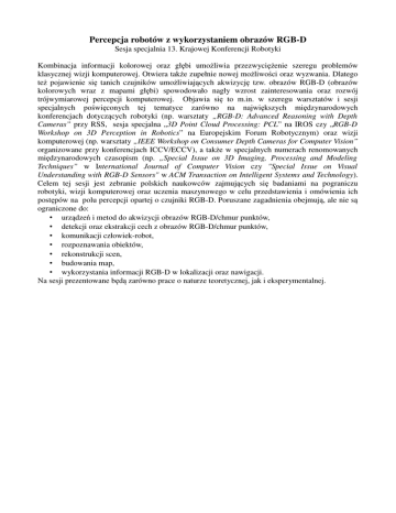 Percepcja robotów z wykorzystaniem obrazów RGB-D Sesja specjalnia 13. Krajowej Konferencji Robotyki Kombinacja informacji kolorowej oraz głębi umożliwia przezwyciężenie szeregu problemów klasycznej wizji komputerowej. Otwiera także zupełnie nowej możliwości oraz wyzwania. Dlatego też pojawienie się tanich czujników umożliwiających akwizycję tzw. obrazów RGB-D (obrazów kolorowych wraz z mapami głębi) spowodowało nagły wzrost zainteresowania oraz rozwój trójwymiarowej percepcji komputerowej. Objawia się to m.in. w szeregu warsztatów i sesji specjalnych poświęconych tej tematyce zarówno na największych międzynarodowych konferencjach dotyczących robotyki (np. warsztaty „RGB-D: Advanced Reasoning with Depth Cameras” przy RSS, sesja specjalna „3D Point Cloud Processing: PCL” na IROS czy „RGB-D Workshop on 3D Perception in Robotics” na Europejskim Forum Robotycznym) oraz wizji komputerowej (np. warsztaty „IEEE Workshop on Consumer Depth Cameras for Computer Vision” organizowane przy konferencjach ICCV/ECCV), a także w specjalnych numerach renomowanych międzynarodowych czasopism (np. „Special Issue on 3D Imaging, Processing and Modeling Techniques” w International Journal of Computer Vision czy "Special Issue on Visual Understanding with RGB-D Sensors" w ACM Transaction on Intelligent Systems and Technology). Celem tej sesji jest zebranie polskich naukowców zajmujących się badaniami na pograniczu robotyki, wizji komputerowej oraz uczenia maszynowego w celu przedstawienia i omówienia ich postępów na polu percepcji opartej o czujniki RGB-D. Poruszane zagadnienia obejmują, ale nie są ograniczone do: • urządzeń i metod do akwizycji obrazów RGB-D/chmur punktów, • detekcji oraz ekstrakcji cech z obrazów RGB-D/chmur punktów, • komunikacji człowiek-robot, • rozpoznawania obiektów, • rekonstrukcji scen, • budowania map, • wykorzystania informacji RGB-D w lokalizacji oraz nawigacji. Na sesji prezentowane będą zarówno prace o naturze teoretycznej, jak i eksperymentalnej.