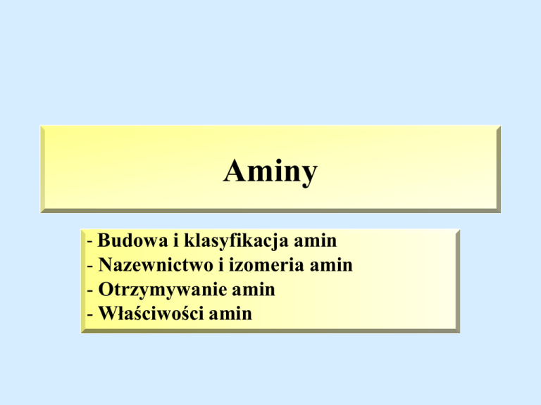Aminy - Budowa i klasyfikacja amin - Nazewnictwo i izomeria amin - Otrzymywanie amin - Właściwości amin Budowa i klasyfikacja amin • Aminy – pochodne amoniaku (NH3), w cząsteczce którego jeden lub kilka atomów wodoru zastąpiono podstawnikami węglowodorowymi (R lub Ar) • Klasyfikacja amin: • Aminy I-rzędowe: R – NH2 lub Ar – NH2 • Aminy II-rzędowe : R – NH – R • Aminy III-rzędowe: R – N – R • | • R • W zależności od podstawników węglowodorowych rozróżnia się aminy alifatyczne, aromatyczne, mieszane, jeżeli grupa aminowa nie jest związana bezpośrednio z pierścieniem aromatycznym, to aminy te należą do amin alifatycznych. • Ze względu na wolną parę elektronową na atomie N, aminy są elektronodonorami, czyli wykazują właściwości zasadowe. Nazewnictwo amin • Nazewnictwo – w kolejności alfabetycznej wymienia się podstawniki węglowodorowe, w przypadku większej liczby tych samych podstawników dodaje się przedrostki liczbowe (di, tri), nazwa kończy się słowem „amina” • H3C – NH2 : metyloamina (I-rz) • H3C – NH – CH3: dimetyloamina (II-rz) • H3C – N – CH3 | CH3 • CH3 – CH2 – NH2: etyloamina (I-rz) • CH3 – CH2 – NH – CH3: etylometyloamina (II-rz) • H2N–CH2–CH2–CH2–CH2–NH2: butano-1,4-diamina Nazewnictwo amin cd i izomeria • NH2 | • • • • NH2 | CH3 Fenyloamina 2-metylofenyloamina (anilina) I-rz (o-toluidyna) I-rz Izomeria – izomerami aminy I-rz propylo-1-aminy CH3 – CH2 – CH3 – NH2 są: trimetyloamina (III-rz), etylometyloamina (II-rz) Otrzymywanie amin • Otrzymywanie amin alifatycznych: alkilowanie amoniaku lub amin I i II halogenoalkanami, powstający produkt poddaje się hydrolizie zasadowej • CH3I + NH3 [CH3-NH3]+I• jodometan + amoniak jodek metyloamonium • [CH3-NH3]+I- + NaOH CH3 - NH2 + NaI + H2O • CH3I + CH3-NH2 CH3 – NH – CH3 + HI • jodometan + metloamina dimetyloamina • (w/w zapis – jest zapisem uproszczonym) Otrzymywanie amin cd • Otrzymywanie amin aromatycznych: • redukcja nitrobenzenu wodorem wobec katalizatora • C6H5-NO2 + 3H2 C6H5-NH2 + 2H2O nitrobenzen anilina • redukcja nitrobenzenu mieszaniną cynku (lub cyny, żelaza) i kwasu chlorowodorowego, w drugim etapie hydroliza w środowisku zasadowym • C6H5 – NO2 + 3Zn + 7HCl [C6H5-NH3]+Cl- + 3ZnCl2 + 2H2O nitrobenzen chlorek aniliny • [C6H5-NH3]+Cl- + NaOH C6H5-NH2 + NaCl + H2O Chlorek aniliny anilina Właściwości fizyczne amin • Metyloamina i etyloamina są gazami o nieprzyjemnym zapachu, aminy aromatyczne (anilina) i aminy o dłuższych łańcuchach węglowych są cieczami, difenyloamina, p-toluidyna są ciałami stałymi. • Aminy mają niskie temp. wrzenia, ponieważ nie mają zdolności tworzenia wiązań wodorowych. • Aminy alifatyczne dobrze rozpuszczają się w wodzie, ponieważ mogą tworzyć wiązania wodorowe z cząsteczkami wody poprzez wolna parę elektronową na atomie azotu. • Aminy aromatyczne - anilina trudno rozpuszcza się w wodzie, ponieważ wolna para elektronowa jest sprzężona z sekstetem elektronowym pierścienia aromatycznego, co obniża właściwości elektrodonorowe. Wraz ze wzrostem liczby grup aminowych związanych z pierścieniem aromatycznym wzrasta rozpuszczalność ich w wodzie. Właściwości chemiczne amin • Aminy wykazują właściwości zasadowe, podobnie jak amoniak (wolna para elektronowa na atomie azotu – elektronodoner) • dysocjacja elektrolityczna w roztworze wodnym • CH3 – NH2 + H2O ↔ CH3-NH3+ + OH• reakcja z kwasami sól • CH3-NH2 + HBr CH3-NH3Br metyloamina bromek metyloamonium • Aminy alifatyczne wykazują silniejsze właściwości zasadowe niż amoniak, natomiast alanina ma słabsze właściwości zasadowe niż amoniak i aminy alifatyczne. • Aminy, jako słabe zasady są wypierane z soli przez wodorotlenki litowców. Właściwości chemiczne amin cd • Pozostałe reakcje amin: • Aminy I i II-rzędowe ulegają alkilowaniu powstają odpowiedni aminy II i III- rzędowe, • Utlenianie do grupy nitrowej, • Halogenowaniu ( substytucji rodnikowej w na alifatycznej części węlowodorowej) • Aminy aromatyczne – substytucja elektrofilowa na pierścieniu aromatycznym, grupa aminowa jest podstawnikiem I- rodzaju, kolejne podstawniki są kierowane w pozycje orto (2 i 6) oraz para (4) Zastosowanie amin • Metyloamina CH3- NH2: produkcja barwników, środków farmaceutycznych, jest dodatkiem do rozpuszczalników, zmywaczy, paliw, • Diaminy od 2-ch do 6 at. C w cząsteczce stosowane są do produkcji włókien sztucznych (np. heksano-1,6-diamina jest półproduktem w produkcji nylonu) • Aminy III-rzędowe są stosowane jako utwardzacze żywic syntetycznych mających zastosowanie jako kleje (epidian), lakiery materiały izolacyjne. • Anilina – jest bezbarwną cieczą, brunatnieje pod wpływem powietrza, o słabym ale charakterystycznym zapachu, toksyczna, stosowana do produkcji barwników, farmaceutyków, materiałów wybuchowych i tworzyw sztucznych.