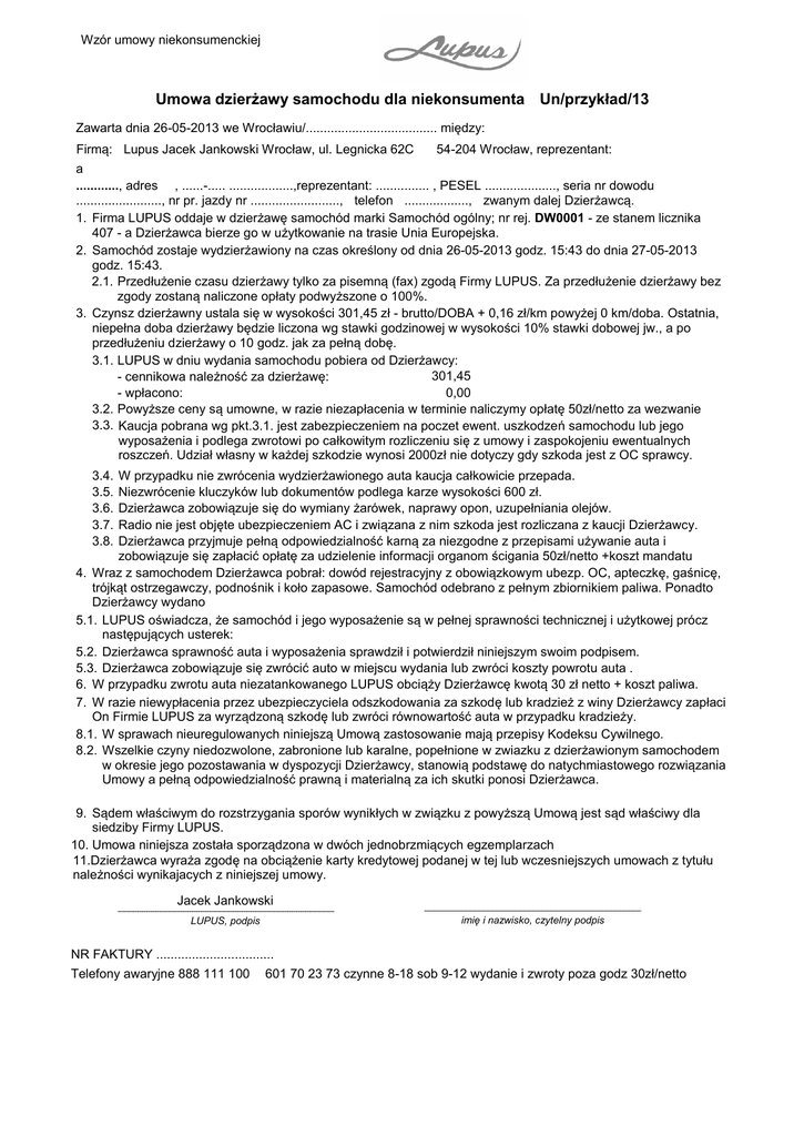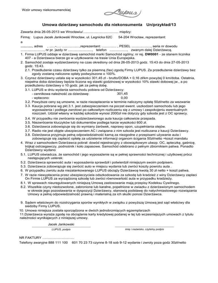 Wzór umowy niekonsumenckiej Umowa dzierżawy samochodu dla niekonsumenta Un/przykład/13 Zawarta dnia 26-05-2013 we Wrocławiu/..................................... między: Firmą: Lupus Jacek Jankowski Wrocław, ul. Legnicka 62C 54-204 Wrocław, reprezentant: a ............, adres , ......-..... ..................,reprezentant: ............... , PESEL ...................., seria nr dowodu ........................, nr pr. jazdy nr ........................., telefon .................., zwanym dalej Dzierżawcą. 1. Firma LUPUS oddaje w dzierżawę samochód marki Samochód ogólny; nr rej. DW0001 - ze stanem licznika 407 - a Dzierżawca bierze go w użytkowanie na trasie Unia Europejska. 2. Samochód zostaje wydzierżawiony na czas określony od dnia 26-05-2013 godz. 15:43 do dnia 27-05-2013 godz. 15:43. 2.1. Przedłużenie czasu dzierżawy tylko za pisemną (fax) zgodą Firmy LUPUS. Za przedłużenie dzierżawy bez zgody zostaną naliczone opłaty podwyższone o 100%. 3. Czynsz dzierżawny ustala się w wysokości 301,45 zł - brutto/DOBA + 0,16 zł/km powyżej 0 km/doba. Ostatnia, niepełna doba dzierżawy będzie liczona wg stawki godzinowej w wysokości 10% stawki dobowej jw., a po przedłużeniu dzierżawy o 10 godz. jak za pełną dobę. 3.1. LUPUS w dniu wydania samochodu pobiera od Dzierżawcy: 301,45 - cennikowa należność za dzierżawę: - wpłacono: 0,00 3.2. Powyższe ceny są umowne, w razie niezapłacenia w terminie naliczymy opłatę 50zł/netto za wezwanie 3.3. Kaucja pobrana wg pkt.3.1. jest zabezpieczeniem na poczet ewent. uszkodzeń samochodu lub jego wyposażenia i podlega zwrotowi po całkowitym rozliczeniu się z umowy i zaspokojeniu ewentualnych roszczeń. Udział własny w każdej szkodzie wynosi 2000zł nie dotyczy gdy szkoda jest z OC sprawcy. 3.4. 3.5. 3.6. 3.7. 3.8. W przypadku nie zwrócenia wydzierżawionego auta kaucja całkowicie przepada. Niezwrócenie kluczyków lub dokumentów podlega karze wysokości 600 zł. Dzierżawca zobowiązuje się do wymiany żarówek, naprawy opon, uzupełniania olejów. Radio nie jest objęte ubezpieczeniem AC i związana z nim szkoda jest rozliczana z kaucji Dzierżawcy. Dzierżawca przyjmuje pełną odpowiedzialność karną za niezgodne z przepisami używanie auta i zobowiązuje się zapłacić opłatę za udzielenie informacji organom ścigania 50zł/netto +koszt mandatu 4. Wraz z samochodem Dzierżawca pobrał: dowód rejestracyjny z obowiązkowym ubezp. OC, apteczkę, gaśnicę, trójkąt ostrzegawczy, podnośnik i koło zapasowe. Samochód odebrano z pełnym zbiornikiem paliwa. Ponadto Dzierżawcy wydano 5.1. LUPUS oświadcza, że samochód i jego wyposażenie są w pełnej sprawności technicznej i użytkowej prócz następujących usterek: 5.2. Dzierżawca sprawność auta i wyposażenia sprawdził i potwierdził niniejszym swoim podpisem. 5.3. Dzierżawca zobowiązuje się zwrócić auto w miejscu wydania lub zwróci koszty powrotu auta . 6. W przypadku zwrotu auta niezatankowanego LUPUS obciąży Dzierżawcę kwotą 30 zł netto + koszt paliwa. 7. W razie niewypłacenia przez ubezpieczyciela odszkodowania za szkodę lub kradzież z winy Dzierżawcy zapłaci On Firmie LUPUS za wyrządzoną szkodę lub zwróci równowartość auta w przypadku kradzieży. 8.1. W sprawach nieuregulowanych niniejszą Umową zastosowanie mają przepisy Kodeksu Cywilnego. 8.2. Wszelkie czyny niedozwolone, zabronione lub karalne, popełnione w zwiazku z dzierżawionym samochodem w okresie jego pozostawania w dyspozycji Dzierżawcy, stanowią podstawę do natychmiastowego rozwiązania Umowy a pełną odpowiedzialność prawną i materialną za ich skutki ponosi Dzierżawca. 9. Sądem właściwym do rozstrzygania sporów wynikłych w związku z powyższą Umową jest sąd właściwy dla siedziby Firmy LUPUS. 10. Umowa niniejsza została sporządzona w dwóch jednobrzmiących egzemplarzach 11.Dzierżawca wyraża zgodę na obciążenie karty kredytowej podanej w tej lub wczesniejszych umowach z tytułu należności wynikajacych z niniejszej umowy. Jacek Jankowski imię i nazwisko, czytelny podpis LUPUS, podpis NR FAKTURY ................................. Telefony awaryjne 888 111 100 601 70 23 73 czynne 8-18 sob 9-12 wydanie i zwroty poza godz 30zł/netto