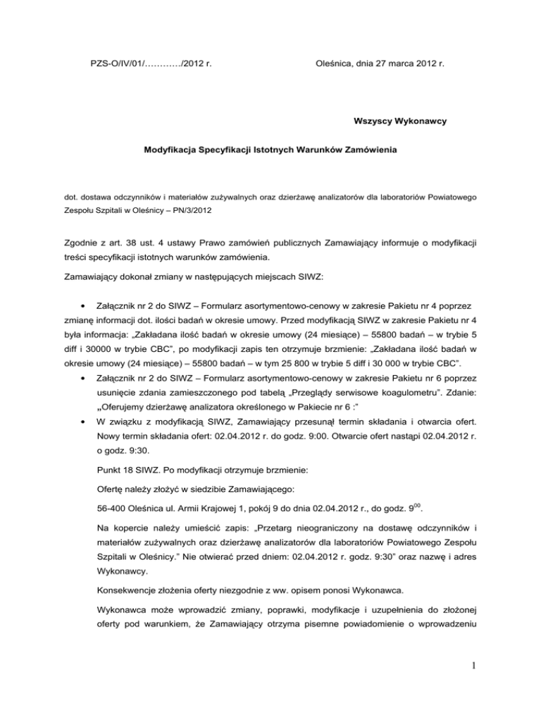PZS-O/IV/01/…………/2012 r. Oleśnica, dnia 27 marca 2012 r. Wszyscy Wykonawcy Modyfikacja Specyfikacji Istotnych Warunków Zamówienia dot. dostawa odczynników i materiałów zuŜywalnych oraz dzierŜawę analizatorów dla laboratoriów Powiatowego Zespołu Szpitali w Oleśnicy – PN/3/2012 Zgodnie z art. 38 ust. 4 ustawy Prawo zamówień publicznych Zamawiający informuje o modyfikacji treści specyfikacji istotnych warunków zamówienia. Zamawiający dokonał zmiany w następujących miejscach SIWZ: • Załącznik nr 2 do SIWZ – Formularz asortymentowo-cenowy w zakresie Pakietu nr 4 poprzez zmianę informacji dot. ilości badań w okresie umowy. Przed modyfikacją SIWZ w zakresie Pakietu nr 4 była informacja: „Zakładana ilość badań w okresie umowy (24 miesiące) – 55800 badań – w trybie 5 diff i 30000 w trybie CBC”, po modyfikacji zapis ten otrzymuje brzmienie: „Zakładana ilość badań w okresie umowy (24 miesiące) – 55800 badań – w tym 25 800 w trybie 5 diff i 30 000 w trybie CBC”. • Załącznik nr 2 do SIWZ – Formularz asortymentowo-cenowy w zakresie Pakietu nr 6 poprzez usunięcie zdania zamieszczonego pod tabelą „Przeglądy serwisowe koagulometru”. Zdanie: „Oferujemy dzierŜawę analizatora określonego w Pakiecie nr 6 :” • W związku z modyfikacją SIWZ, Zamawiający przesunął termin składania i otwarcia ofert. Nowy termin składania ofert: 02.04.2012 r. do godz. 9:00. Otwarcie ofert nastąpi 02.04.2012 r. o godz. 9:30. Punkt 18 SIWZ. Po modyfikacji otrzymuje brzmienie: Ofertę naleŜy złoŜyć w siedzibie Zamawiającego: 56-400 Oleśnica ul. Armii Krajowej 1, pokój 9 do dnia 02.04.2012 r., do godz. 900. Na kopercie naleŜy umieścić zapis: „Przetarg nieograniczony na dostawę odczynników i materiałów zuŜywalnych oraz dzierŜawę analizatorów dla laboratoriów Powiatowego Zespołu Szpitali w Oleśnicy.” Nie otwierać przed dniem: 02.04.2012 r. godz. 9:30” oraz nazwę i adres Wykonawcy. Konsekwencje złoŜenia oferty niezgodnie z ww. opisem ponosi Wykonawca. Wykonawca moŜe wprowadzić zmiany, poprawki, modyfikacje i uzupełnienia do złoŜonej oferty pod warunkiem, Ŝe Zamawiający otrzyma pisemne powiadomienie o wprowadzeniu 1 zmian, poprawek itp. przed terminem składania ofert. Powiadomienie o wprowadzeniu zmian, musi być złoŜone wg takich samych zasad, jak składana oferta z dopiskiem „ZMIANA”. Oferta złoŜona po terminie, zostanie zwrócona Wykonawcy. Wykonawca ma prawo przed upływem terminu składania ofert, wycofać się z postępowania, poprzez złoŜenie pisemnego powiadomienia (wg takich samych zasad jak wprowadzenie zmian i poprawek) z napisem „WYCOFANIE”. Koperty oznakowane w ten sposób, będą otwierane w pierwszej kolejności. Koperty oznakowane dopiskiem „ZMIANA”, zostaną otwarte przy otwieraniu oferty Wykonawcy, który wprowadził zmiany i po stwierdzeniu poprawności procedury dokonania zmian, zostaną dołączone do oferty. KaŜda zapisana strona zmiany lub wycofania oferty musi być podpisana przez osobę uprawnioną do reprezentowania Wykonawcy. • Punkt 19 SIWZ po modyfikacji otrzymuje brzmienie: Otwarcie ofert nastąpi dnia 02.04.2012r. o godz. 9:30 w siedzibie Zamawiającego w Powiatowym Zespole Szpitali z siedzibą w Oleśnicy ul. Armii Krajowej 1, pok. 14 piętro IV. Wykonawcy mogą być obecni przy otwieraniu ofert. Po modyfikacji Załącznik nr 2 do SIWZ w zakresie Pakietu nr 4 oraz Pakietu nr 6 otrzymuje brzmienie: 2 Nazwa Nazwa/ nr katalogowy Ilość opakowań na 24 miesiące Wielkość opakowania Cena jednostkowa brutto za opakowanie RAZEM: VAT (%) Wartość brutto 3 .............................................................. /podpis osoby upoważnionej do reprezentowania firmy/ Łączna wartość oferty w zakresie Pakietu nr 4 (odczynniki + materiały zużywalne + dzierżawa dwóch analizatorów) wynosi: ............................ zł. brutto Miesięczna rata dzierżawy za jeden analizator wynosi: ....................... zł. brutto, VAT 23% Oferujemy dzierżawę analizatora określonego w Pakiecie nr 4 : Wykonawca oświadcza, że wskazany w formularzu asortyment jest wystarczający dla prawidłowego wykonania w/w ilości oznaczeń. W przypadku nieuwzględnienia asortymentu potrzebnego do wykonania w/w ilości oznaczeń Wykonawca zobowiązuje się do bezpłatnego zapewnienia tego asortymentu Zamawiającemu. Wykonawca pokrywa koszt zakupu i transportu towaru do zamawiającego. 4. 3. 2. 1. L.p. 1. Odczynniki i materiały zużywalne Zakładana ilość badań w okresie umowy (24 miesiące) – 55800 badań – w tym 25 800 w trybie 5 diff i 30 000 w trybie CBC Pakiet nr 4 - Dostawa odczynników i materiałów zużywalnych do badań hematologicznych wraz z dzierżawą dwóch analizatorów 5 diff W trybie CBC oszczędność odczynników Liniowość: RBC min do 7 M/ul.; WBC min do 250 K/ul.; PLT min do 2000 K/ul.; HGB min do 25 g/dl Możliwość oceny niedojrzałych granulocytów jako odrębnej populacji wyrażonej w wartościach bezwzględnych i procentach 11 13. 12. Odczynniki bezcyjankowe 10. L.p. Warunki graniczne 1. Analizator z rozdziałem krwinek białych – 5 diff 2. Ilość raportowanych parametrów hematologicznych – minimum 24 Parametry mierzone: - erytrocyty - hemoglobina - trombocyty - leukocyty Różnicowanie leukocytów: - neurocyty - limfocyty - monocyty - eozyno file 3. - bazofile 4. Ocena całkowitej liczby WBC metodą optyczną 5. Dowolność trybu oznaczenia dla każdej próbki (CBC lub CBC + DIFF) Różnicowanie WBC na 5 populacji przy użyciu cystometrii przepływowej z wykorzystaniem światła laserowego 6. 7. Objętość aspirowanej próbki do 150 ul. (w obu trybach – CBC i CBC – DIFF) 8. Wydajność ok. 60 oznaczeń/godzinę 9. Maksymalna liczba reagentów (wraz z odczynnikiem odbiałczającym) – 5 Warunki graniczne dot. Pakietu nr 4 Spełnia* Karta spełniania warunków przedmiotu zamówienia Nie spełnia* 4 * wpisać odpowiednio 