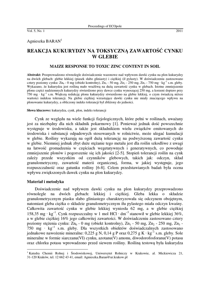 Proceedings of ECOpole Vol. 5, No. 1 2011 Agnieszka BARAN1 REAKCJA KUKURYDZY NA TOKSYCZNĄ ZAWARTOŚĆ CYNKU W GLEBIE MAIZE RESPONSE TO TOXIC ZINC CONTENT IN SOIL Abstrakt: Przeprowadzono równolegle doświadczenie wazonowe nad wpływem dawki cynku na plon kukurydzy na dwóch glebach: glebie lekkiej (piasek słabo gliniasty) i ciężkiej (ił pylasty). W doświadczeniu zastosowano cztery poziomy cynku: Zn0 - 0 mg (obiekt kontrolny), Zn1 - 50 mg, Zn2 - 250 mg, Zn3 - 750 mg · kg–1 s.m. gleby. Wykazano, że kukurydza jest rośliną mało wrażliwą na dużą zawartość cynku w glebach. Istotne zmniejszenie plonu części nadziemnych kukurydzy stwierdzono przy dawce cynku wynoszącej 250 mg, a korzeni dopiero przy 750 mg · kg–1 s.m. Większą redukcję plonu kukurydzy stwierdzono na glebie lekkiej, o czym świadczą niższe wartości indeksu tolerancji. Na glebie ciężkiej wzrastające dawki cynku nie miały znaczącego wpływu na plonowanie kukurydzy, a obliczony indeks tolerancji był zbliżony do jedności. Słowa kluczowe: kukurydza, cynk, plon, indeks tolerancji Cynk ze względu na wiele funkcji fizjologicznych, które pełni w roślinach, uważany jest za niezbędny dla nich składnik pokarmowy [1]. Ponieważ jednak dość powszechnie występuje w środowisku, a także jest składnikiem wielu związków emitowanych do środowiska i substancji odpadowych stosowanych w rolnictwie, może ulegać kumulacji w glebie. Rośliny wykazują na ogół dużą tolerancję na podwyższoną zawartość cynku w glebie. Niemniej jednak zbyt duże stężanie tego metalu jest dla roślin szkodliwe z uwagi na łatwość gromadzenia w częściach wegetatywnych i generatywnych, co powoduje zmniejszenie plonów i pogorszenie się ich jakości [2-5]. Stopień tolerancji roślin na cynk zależy przede wszystkim od czynników glebowych, takich jak: odczyn, skład granulometryczny, zawartość materii organicznej, forma, w jakiej występuje, jego rozpuszczalność oraz gatunku rośliny [6-8]. Celem przedstawianych badań była ocena wpływu zwiększonych dawek cynku na plon kukurydzy. Materiał i metodyka Doświadczenie nad wpływem dawki cynku na plon kukurydzy przeprowadzono równolegle na dwóch glebach: lekkiej i ciężkiej. Gleba lekka o składzie granulometrycznym piasku słabo gliniastego charakteryzowała się odczynem obojętnym, natomiast gleba ciężka o składzie granulometrycznym iłu pylastego miała odczyn kwaśny. Całkowita zawartość cynku w glebie lekkiej wyniosła 62 mg, a w glebie ciężkiej 158,35 mg · kg–1. Cynk rozpuszczalny w 1 mol HCl · dm−3 stanowił w glebie lekkiej 36%, a w glebie ciężkiej 16% jego całkowitej zawartości. W doświadczeniu zastosowano cztery poziomy stężenia cynku: Zn0 - 0 mg (obiekt kontrolny), Zn1 - 50 mg, Zn2 - 250 mg, Zn3 750 mg · kg–1 s.m. gleby. Dla wszystkich obiektów doświadczalnych zastosowano jednakowe nawożenie mineralne: 0,225 g N, 0,14 g P oraz 0,275 g K · kg–1 s.m. gleby. Sole mineralne w formie siarczanu(VI) cynku, azotanu(V) amonu, diwodorofosforanu(V) potasu oraz chlorku potasu wprowadzono przed siewem rośliny. Rośliną testową była kukurydza 1 Katedra Chemii Rolnej i Środowiskowej, Uniwersytet Rolniczy w Krakowie, al. Mickiewicza 21, 31-120 Kraków, tel. 12 662 43 41, email: [email protected] 156 Agnieszka Baran (Zea mays) odmiany „Bora”. Zbioru roślin dokonano w fazie 7-9 liści, po 40 dniach wegetacji, wydzielając: części nadziemne oraz korzenie. Po zbiorze materiał roślinny suszono w suszarce z wymuszonym obiegiem powietrza w temp. 70oC i określono ilość plonu suchej masy. Otrzymane wyniki opracowano statystycznie przy wykorzystaniu jednoczynnikowej analizy wariancji i testu Tukeya. Test stosowano, gdy wykazano brak równości pomiędzy średnimi. Analizę wariancji prowadzono przy poziomie istotności α = 0,01. Wyniki W doświadczeniu wykazano znaczący wpływ wzrastających dawek cynku na zmniejszenie się plonu części nadziemnych (tab. 1). Uzyskana biomasa nadziemna w zależności od poziomu zanieczyszczenia cynku była mniejsza odpowiednio o 7% (Zn1), 10% (Zn2) i 25% (Zn3) na glebie lekkiej oraz o 8% (Zn1), 10% (Zn2) i 21% (Zn3) na glebie ciężkiej w porównaniu do obiektu kontrolnego. Niezależnie od dawki cynku na obu glebach plony biomasy nadziemnej były porównywalne (tab. 1). Zanieczyszczenie gleb cynkiem zmniejszyło również plonowanie korzeni, przy czym w warunkach gleby lekkiej zależności te były statystycznie istotne (tab. 1). Wraz ze wzrostem dawki cynku ilość biomasy podziemnej na glebie lekkiej zmniejszała się o 15% (Zn2) i 58% (Zn3) w porównaniu do obiektu kontrolnego. W warunkach gleby ciężkiej, pod wpływem zanieczyszczenia gleb cynkiem, wykazano jedynie zniżkową tendencję w plonowaniu korzeni odpowiednio o 7% (Zn1), o 9% (Zn2) i o 11% (Zn3) w porównaniu do obiektu bez dodatku cynku (tab. 1). W obiekcie kontrolnym oraz z pierwszą i drugą dawką cynku uzyskano większe plony korzeni na glebie lekkiej niż ciężkiej odpowiednio od 7 do 30%. Jedynie w obiekcie z trzecią dawką cynku stwierdzono odwrotną zależność, tj. plony korzeni na glebie ciężkiej były większe o 85% niż na glebie lekkiej. Tabela 1 Plony części nadziemnych i korzeni kukurydzy Table 1 Yields of shoots and roots of maize Obiekt/Treatment Zn0 - 0 mg Zn1 - 50 mg Zn2 - 250 mg Zn3 - 750 mg NIR0,01, LSD0,01 Część nadziemna/Shoots gleba lekka/ gleba ciężka/ light soil heavy soil 24,47c* 24,41c 22,72bc 22,52b 22,02b 21,97b 18,29a 19,36a 1,74 1,36 Korzenie/Roots gleba lekka/ gleba ciężka/ light soil heavy soil 6,31b 5,54 6,66b 5,14 5,39b 5,02 2,66a 4,94 1,24 n.i.** * grupy jednorodne wyznaczone testem Tukeya/homogenous groups according to Tukey test, ** n.i. - nieistotne statystycznie/statistically non-significant Sumaryczny plon kukurydzy (części nadziemne + korzenie) przedstawiono na rysunku 1. W badaniach wykazano, że już najmniejsza z zastosowanych dawek cynku spowodowała zmn