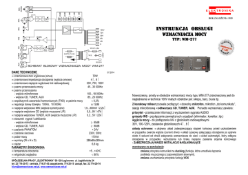 MIK. GONG 3 2 ELEKTRONIKA NISKIE 3 1 0dB -4dB -9dB ROK ZAŁOśENIA 1955 WYS. WZM. 2 CD INS MIK. MIK. PH. -20dB -30dB 1 SUMA NISKIE + 100V + 70V + 30V + 8R + 4R - 0 INSTRUKCJA OBSŁUGI WZMACNIACZA MOCY TYP: WM— WM—277 WTA-T-2,5A WYS. AUX 2xWTA-T-2,5A ~230V TUNER WZM. W.S. 05.2014 SCHEMAT BLOKOWY WZMACNIACZA MOCY WM-277 DANE TECHNICZNE 07.2014 • • • • • znamionowa moc wyjściowa (sinus) 70W znamionowa impedancja obciąŜenia (wyjścia omowe) 4Ω, 8Ω znamionowe napięcie wyjściowe linii radiowęzłowej 30V, 70V, 100V pasmo przenoszenia mocy 45...30 000Hz pasmo przenoszenia - wejście mikrofonowe 100...18 000Hz - wejścia CD, TUNER, AUX 85...20 000Hz • współczynnik zawartości harmonicznych (THD) w paśmie mocy < 0,3% • regulacja barwy dźwięku 100Hz, 10 000Hz ± 12dB • napięcie wejściowe MIK (wejście symetryczne) 1,5...300mV / 2,2kΩ • napięcie wejściowe CD (wejście muzyczne L/R) 0,5...9V / 47kΩ • napięcie wejściowe TUNER, AUX (wejścia muzyczne L/R) 0,2...5V / 22kΩ • stosunek sygnał / zakłócenia - wejście mikrofonowe ≥ 65dB - wejścia CD, TUNER, AUX ≥ 80dB • zasilanie PHANTOM + 24V • zasilanie sieciowe 230V, 50Hz • pobór mocy 170VA • wymiary (W x H x D) 288x88x280mm • cięŜar 6,8 kg PARAMETRY ŚRODOWISKA • temperatura otoczenia +5...+40oC • wilgotność względna < 80% SPÓŁDZIELNIA PRACY „ELEKTRONIKA” 05-120 Legionowo ul. Jagiellońska 24 tel: 22 774-20-73 centrala, 774-27-43 zaopatrzenie, 774-25-15 zarząd, fax: 22 774-20-74 [email protected], www.wzmacniacze.net.pl Nowoczesny, prosty w obsłudze wzmacniacz mocy typu WM-277 przeznaczony jest do nagłaśniania w technice 100V małych obiektów jak: sklepy, bary, biura itp. 2 kanałowy mikser pozwala podłączyć • dowolny mikrofon, mikrofon „do komunikatu”, stację mikrofonową • odtwarzacz CD, TUNER, AUX. Ponadto wzmacniacz zawiera: priorytet - przekazanie informacji z wyciszeniem sygnału AUDIO gniazdo INS - przyłączenie zewnętrznych urządzeń (eliminator, korektor, itp.) wyjścia mocy - do podłączenia linii z głośnikami radiowęzłowymi 30V, 100-120V, zestawów głośnikowych 4Ω, 8Ω układy ochronne: • aktywny układ zabezpieczający stopień końcowy przed uszkodzeniem w przypadku zwarcia wyjścia (current drive) • układ czasowy załączający obciąŜenie po upływie około 4 sekund od chwili załączenia wzmacniacza do sieci • układ automatyki, który odłącza obciąŜenie w przypadku: wzbudzenia lub braku napięcia zasilania stopnia końcowego - ZABEZPIECZAJĄ WASZE INSTALACJE NAGŁAŚNIAJĄCE montowane na zamówienie: zmiana priorytetu komunikat na ducking (funkcja, która umoŜliwia łączenie podkładu muzycznego z zapowiedziami słownymi). zmiana uruchamiania priorytetu funkcją VOX UWAGI DLA UśYTKOWNIKA UWAGA!: Urządzenie musi być zasilane z gniazda sieciowego z przyłączonym obwodem ochronnym (gniazdo z bolcem), a w przypadku wymiany bezpiecznika sieciowego naleŜy bezwzględnie wyjąć wtyczkę z gniazda sieciowego! Nie wolno uŜywać urządzenia w miejscach klasyfikowanych jako wilgotne np. baseny kąpielowe, mokre piwnice itp. - Dokonywanie jakichkolwiek przeróbek i napraw wzmacniacza przez osoby nieupowaŜnione do świadczeń gwarancyjnych pozbawia uŜytkownika uprawnień gwarancyjnych oraz moŜe być przyczyną pogorszenia parametrów technicznych i bezpieczeństwa uŜytkowania! Producent zastrzega sobie prawo wprowadzenia zmian w ramach modernizacji i postępu technicznego bez konieczności wprowadzenia ich do instrukcji obsługi o ile nie zmieniają one podstawowych parametrów objętych niniejszą instrukcją. WyposaŜenie wzmacniacza: - instrukcja obsługi, karta gwarancyjna, kabel sieciowy, zapasowe bezpieczniki, osłona zacisków wyjściowych Opis wzmacniacza 3 4 5 7 16 2 1- Pokrętło regulacji głośności kanału mikrofonowego 2- Włącznik zasilania phantom 3- Pokrętła regulacji barwy dźwięku kanału MIK 4- Sygnalizacja funkcji VOX (funkcja na zamówienie) 1 6 8 5- Pokrętło wyboru źródła muzyki (CD, TUNER, AUX) 6- Pokrętło regulacji głośności kanału AUDIO 7- Pokrętła regulacji barwy dźwięku (tony niskie i wysokie) kanału AUDIO 8- Pokrętło regulacji wzmocnienia sumy 16- Wskaźnik wysterowania (-30dB, -20dB, -9dB, -4dB, 0dB) 20- Włącznik zasilania sieciowego MIK TUNER CD 0dB AUX SUMA ELEKTRONI KA 0 dB WYS. www.wmacniacze.net.pl -4 dB 0dB 0dB 0dB -9 dB NISKIE PH 5 3 PRIOR -20 dB NISKIE 6 4 7 2 3 8 1 9 0 WZM. 6 4 7 2 1 7 WZMACNIACZ 8 1 WM-277 9 0 WZM. SIEĆ 6 2 9 0 5 3 8 21- Wejście mikrofonu „do komunikatu” (gniazdo DIN / symetryczne) 22- Wejście mikrofonowe (gniazdo XLR / symetryczne) 23- Wejście mikrofonowe (gniazdo JACK / symetryczne) 24- Wejścia źródeł AUDIO (gniazda CINCH) 27- Wejście / wyjście insertowe (gniazdo JACK) 30- Zaciski wyjściowe linii głośnikowych 30V, 70V, 100V, zestawów głośnikowych 4Ω, 8Ω 31- Gniazdo przyłącza sieciowego 32- Bezpiecznik sieciowy WTA-T 2,5A / 250V 33 - Zacisk uziemienia WM277/1 -30 dB WYSOKIE 5 10 20 30 0 24 AUX 4 Ω 8 Ω 30V 70V 100V TUNER 21 CD MIK/PRIOR 14 L -3 5 P WTA-T 2,5A 250V INS MIK ~230V 50Hz 170VA 32 31 33 27 23 22 ekran PODŁĄCZENIE WZMACNIACZA 1 - Podłączyć źródła dźwięku zgodnie z oznaczeniem. 3 sygnał 2 - Do wejścia mikrofonowego symetrycznego (gniazda MIK) doprowadzić sygnał sygnał rys.1 w postaci symetrycznej wtykiem XLR rys.1 lub Jack stereo φ 6,3mm rys.2. Konieczne jest wówczas stosowanie mikrofonów o wyjściach symetrycznych. Do wejścia priorytetowego (gniazdo DIN) przyłączyć mikrofon „do komunikatu” wtykiem DIN zgodnie z rys.5. Uwaga: W kanale mikrofonowym moŜna wykorzystać jednorazowo tylko jedno gniazdo wejściowe Podłączyć do gniazda INS (27) zewnętrzne urządzenia ekran (eliminator, kompresor, korektor) wtykiem Jack stereo rys.4. sygnał Gniazdo INS moŜna równieŜ wykorzystać do ZAPISU lub do podłączenia sygnał dodatkowej końcówki mocy. rys.2 Współpraca wzmacniacza z 