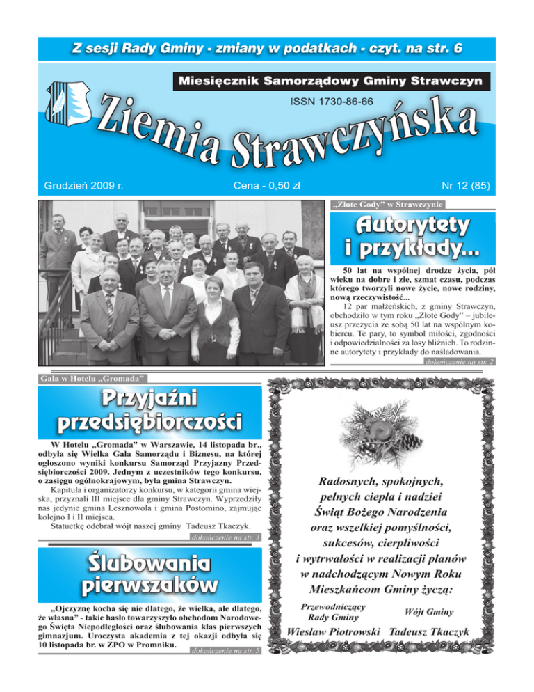 Z sesji Rady Gminy - zmiany w podatkach - czyt. na str. 6 Grudzień 2009 r. Nr 12 (85) „Złote Gody” w Strawczynie Autorytety i przykłady... 50 lat na wspólnej drodze życia, pół wieku na dobre i złe, szmat czasu, podczas którego tworzyli nowe życie, nowe rodziny, nową rzeczywistość... 12 par małżeńskich, z gminy Strawczyn, obchodziło w tym roku „Złote Gody” – jubileusz przeżycia ze sobą 50 lat na wspólnym kobiercu. Te pary, to symbol miłości, zgodności i odpowiedzialności za losy bliźnich. To rodzinne autorytety i przykłady do naśladowania. dokończenie na str. 2 Gala w Hotelu „Gromada” Przyjaźni przedsiębiorczości W Hotelu „Gromada” w Warszawie, 14 listopada br., odbyła się Wielka Gala Samorządu i Biznesu, na której ogłoszono wyniki konkursu Samorząd Przyjazny Przedsiębiorczości 2009. Jednym z uczestników tego konkursu, o zasięgu ogólnokrajowym, była gmina Strawczyn. Kapituła i organizatorzy konkursu, w kategorii gmina wiejska, przyznali III miejsce dla gminy Strawczyn. Wyprzedziły nas jedynie gmina Lesznowola i gmina Postomino, zajmując kolejno I i II miejsca. Statuetkę odebrał wójt naszej gminy Tadeusz Tkaczyk. dokończenie na str. 3 Ślubowania pierwszaków „Ojczyznę kocha się nie dlatego, że wielka, ale dlatego, że własna” - takie hasło towarzyszyło obchodom Narodowego Święta Niepodległości oraz ślubowania klas pierwszych gimnazjum. Uroczysta akademia z tej okazji odbyła się 10 listopada br. w ZPO w Promniku. dokończenie na str. 5 Radosnych, spokojnych, pełnych ciepła i nadziei Świąt Bożego Narodzenia oraz wszelkiej pomyślności, sukcesów, cierpliwości i wytrwałości w realizacji planów w nadchodzącym Nowym Roku Mieszkańcom Gminy życzą: Przewodniczący Rady Gminy Wójt Gminy Wiesław Piotrowski Tadeusz Tkaczyk „Złote Gody” w Strawczynie Autorytety i przykłady... dokończenie ze str. 1 W uznaniu zasług m.in. w rozwoju i cementowaniu rodzinnych więzów, władze gminy zwróciły się do Prezydenta RP o odznaczenie tych małżeństw medalami „Za długoletnie pożycie małżeńskie”. Uroczystość dekoracji tym odznaczeniem odbyła się 25 listopada br. w Gminnym Ośrodku Kultury. Po odegraniu marsza Mendelssohna, z-pca kierownika Urzędu Stanu Cywilnego - Elżbieta Kumańska powitała wszystkich uczestników jubileuszu z wójtem gminy Tadeuszem Tkaczykiem, przewodniczącym Rady Gminy Wiesławem Piotrowskim i jego zastępcą Januszem Malickim. Zwracając się do sędziwych małżonków, kierownik USC powiedziała m.in.: „ Minęło 50 lat od chwili, kiedy połączyliście Państwo swój los, od kiedy z miłością i nadzieją powiedzieliście sobie nawzajem –„tak” i włożyliście sobie obrączki. Przyrzeczenie to składaliście Państwo z ufnością, że będziecie dzielić dobre i złe chwile, wspierać się wzajemnie i cieszyć się wspólną radością. Mimo różnych przeciwności losu, dotrzymaliście danego sobie słowa. W ciągu tych długich lat było na pewno wiele dni radosnych i pięknych, było też, być może, wiele chwil smutnych, przykrych a nawet tragicznych. Wszystkie te przeżycia: radości i smutki, troski i obowiązki, związały Was jeszcze bardziej. Daliście z siebie wiele rodzinom i społeczeństwu, wychowując swoje dzieci, jak i pracując na rzecz całej społeczności. W jej imieniu przyjmijcie słowa podziękowania za ten 50-letni trud”. Następnie odczytano listę wyróżnionych przez Prezydenta RP. Znaleźli się na niej: Helena i Andrzej Buchcic z Oblęgorka, Stanisława i Tadeusz Buchcic z Oblęgora, Zofia i Stanisław Czechowicz ze Strawczyna, Józefa i Tadeusz Kowalscy z Korczyna, Maria i Roman Piotrowscy z Korczyna, Stefania i Stanisław Piotrowscy z Chełmiec, Helena i Edward Prokop z Promnika, Janina i Stanisław Smolarczykowie z Oblęgora, Otolia i Stanisław Stępień z Korczyna, Józefa i Stanisław Ślusarczyk z Chełmiec, Leokadia i Feliks Wieczorek z Chełmiec oraz Wanda i Władysław Zawadzcy z Kuźniaków. Dekoracji medalem „Za długoletnie pożycie małżeńskie” dokonał wójt Tadeusz Tkaczyk, gratulacje, kwiaty i prezenty złożyli także: Wiesław Piotrowski i Janusz Malicki. 2 cesy dzieci. Jeden z ich synów – Wiesław jest dziś przewodniczącym Rady Gminy – są powody do dumy... Otolia i Stanisław Stępniowie poznali się w 1958 r. na potańcówce w remizie OSP w Łopusznie: „zaiskrzyło” od razu. Przez kilka miesięcy wzajemnie się poznawali, by podjąć ostateczną decyzję: pobierzemy się ! Ślub odbył się 28 czerwca 1958 r. w kościele parafialnym w Łopusznie. Młodzi zamieszkali u rodziców Stanisława – w Korczynie. Młody żonkoś znalazł pracę w kieleckim „Wodrolu”, żona zajęła się pracą w domu i gospodarstwie, a potem wychowywaniem dzieci: urodziła się ich trójka. Dziś mają 12 wnuków i jedną prawnuczkę. Pan Stanisław lubi udzielać się społecznie: 25 lat „sołtysował” swojej wsi, obecnie jest radnym Rady Gminy w Strawczynie. U żony najbardziej ceni sobie: pracowitość i dbałość o rodzinę. Pani Otolia natomiast wyróżnia u męża: zaradność, dobroć i oddanie rodzinie. Oboje cieszą się dziećmi, wnukami i prawnuczką. Wszystkim „złotym” parom życzymy dużo zdrowia i wielkiej satysfakcji ze swojego, życiowego dorobku. (Kos.) Po dekoracji, wójt wzniósł toast szampanem za zdrowie Jubilatów, przekazując im gratulacje i życzenia: - Życzę Wam – mówił wójt – długich i pogodnych lat życia w jak najlepszym zdrowiu i zadowoleniu oraz zrealizowania wszystkich zamierzeń i planów. Gratulacje i życzenia miały miejsce w dalszej części uroczystości: śpiewająco złożyły je „złotym” jubilatom dzieci ze Szkoły Podstawowej w Korczynie, pod opieką Emilii Marszałek a także gminna orkiestra dęta pod batutą Michała Leśnika. Do tańca i słuchu zagrali „złotym” parom - Grzegorz Wawrzeńczyk i Stanisław Śliwa. Uczestniczący