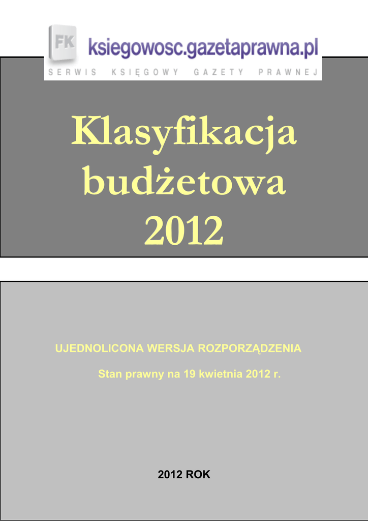 Klasyfikacja budżetowa 2012 UJEDNOLICONA WERSJA ROZPORZĄDZENIA Stan prawny na 19 kwietnia 2012 r. 2012 ROK SPIS TREŚCI UJEDNOLICONA WERSJA ROZPORZĄDZENIA…………............................3 • Załącznik nr 1 - KLASYFIKACJA DZIAŁÓW………………………………….……4 • Załącznik nr 2 - KLASYFIKACJA ROZDZIAŁÓW ……………………..................9 • Załącznik nr 3 - KLASYFIKACJA PARAGRAFÓW DOCHODÓW, PRZYCHODÓW I ŚRODKÓW (z objaśnieniami) …………………………….….40 • Załącznik nr 4 - KLASYFIKACJA PARAGRAFÓW WYDATKÓW I ŚRODKÓW (z objaśnieniami).........................………………….………………..54 • Załącznik nr 5 - KLASYFIKACJA PARAGRAFÓW PRZYCHODÓW................78 • Załącznik nr 6 - KLASYFIKACJA PARAGRAFÓW ROZCHODÓW …………...79 • Załącznik nr 7 - KLASYFIKACJA WYDATKÓW DLA ZADAŃ Z ZAKRESU BEZPIECZEŃSTWA ZEWNĘTRZNEGO….………………………………………..80 • Załącznik nr 8 - SZCZEGÓŁOWA KLASYFIKACJA WYDATKÓW DLA ZADAŃ Z ZAKRESU BEZPIECZEŃSTWA WEWNĘTRZNEGO ..………...89 2 1. UJEDNOLICONA WERSJA ROZPORZĄDZENIA Rozporządzenie ministra finansów z 2 marca 2010 r. w sprawie szczegółowej klasyfikacji dochodów, wydatków, przychodów i rozchodów oraz środków pochodzących ze źródeł zagranicznych (Dz.U. nr 38 poz. 207; ost.zm.; Dz.U. z 2012 r. poz. 421) wersja ujednolicona przez redakcję serwisu księgowego GP i obowiązująca od 2 stycznia do 31 grudnia 2012 r., uwzględnia zmianę obowiązującą od 18 kwietnia 2012 r. Na podstawie art. 39 ust. 4 pkt 1 i ust. 5 ustawy z dnia 27 sierpnia 2009 r. o finansach publicznych (Dz. U. Nr 157, poz. 1240 oraz z 2010 r. Nr 28, poz. 146) zarządza się, co następuje: § 1. Ustala się klasyfikację dochodów i wydatków publicznych, przychodów, o których mowa w art. 5 ust. 1 pkt 5, oraz środków, o których mowa w art. 5 ust. 1 pkt 2 i 3 ustawy z dnia 27 sierpnia 2009 r. o finansach publicznych, zwanej dalej "ustawą", według: 1) działów, zgodnie z załącznikiem nr 1 do rozporządzenia; 2) rozdziałów, zgodnie z załącznikiem nr 2 do rozporządzenia; 3) paragrafów dochodów, przychodów i środków, zgodnie z załącznikiem nr 3 do rozporządzenia; 4) paragrafów wydatków i środków, zgodnie z załącznikiem nr 4 do rozporządzenia. § 2. Ustala się klasyfikację przychodów, o których mowa w art. 5 ust. 1 pkt 4 ustawy, według paragrafów, zgodnie z załącznikiem nr 5 do rozporządzenia. § 3. Ustala się klasyfikację rozchodów, o których mowa w art. 6 ust. 2 ustawy, według paragrafów, zgodnie z załącznikiem nr 6 do rozporządzenia. § 4. 1. Ustala się klasyfikację wydatków o większej szczegółowości niż określona w § 1, dla zadań z zakresu bezpieczeństwa wewnętrznego i zewnętrznego, zgodnie z załącznikami nr 7 i 8 do rozporządzenia. 2. Klasyfikacja, o której mowa w ust. 1, może być stosowana wyłącznie na wewnętrzne potrzeby jednostek organizacyjnych: 1) Ministerstwa Obrony Narodowej w zakresie realizowanych działów oraz innych dysponentów części budżetowych w zakresie działu 752 Obrona narodowa, zgodnie z załącznikiem nr 7 do rozporządzenia; 2) Ministerstwa Spraw Wewnętrznych i Administracji w zakresie realizowanych działów oraz innych dysponentów części budżetowych w zakresie działu 754 Bezpieczeństwo publiczne i ochrona przeciwpożarowa, zgodnie z załącznikiem nr 8 do rozporządzenia. § 5. Szczegółowość stosowania podziałek klasyfikacji w planowaniu, rachunkowości i sprawozdawczości ustalają odrębne przepisy. § 6. 1. Paragrafy wydatków: 474 w brzmieniu "474 Zakup materiałów papierniczych do sprzętu drukarskiego i urządzeń kserograficznych" i 475 w brzmieniu "475 Zakup akcesoriów komputerowych, w tym programów i licencji", określone w załączniku nr 4 do rozporządzenia, obowiązują do dnia 31 grudnia 2010 r. 2. Do dnia 31 grudnia 2010 r. nazwa rozdziału "85147 Centra zdrowia publicznego" funkcjonuje w brzmieniu "85147 Zespoły metodyczne opieki zdrowotnej" i nie ma zastosowania do opracowania projektu ustawy budżetowej na rok 2011. § 7. W 2010 r. w odniesieniu do zakładów budżetowych, gospodarstw pomocniczych jednostek budżetowych, samorządowych funduszy celowych, rachunków dochodów własnych jednostek budżetowych oraz funduszy motywacyjnych, funkcjonujących na podstawie przepisów ustawy z dnia 30 czerwca 2005 r. o finansach publicznych (Dz. U. Nr 249, poz. 2104, z późn. zm. 1)), mają 3 zastosowanie podziałki klasyfikacji określone w rozporządzeniu Ministra Finansów z dnia 14 czerwca 2006 r. w sprawie szczegółowej klasyfikacji dochodów, wydatków, przychodów i rozchodów oraz środków pochodzących ze źródeł zagranicznych (Dz. U. Nr 107, poz. 726, z późn. zm. 2)). § 8. Rozporządzenie wchodzi w życie z dniem ogłoszenia, z mocą od dnia 1 stycznia 2010 r., z wyjątkiem rozdziału "73008 Narodowe Centrum Badań i Rozwoju" określonego w załączniku nr 2 do rozporządzenia, który wchodzi w życie z dniem 1 stycznia 2011 r. 3) Zmiany wymienionej ustawy zostały ogłoszone w Dz. U. z 2005 r. Nr 169, poz. 1420, z 2006 r. Nr 45, poz. 319, Nr 104, poz. 708, Nr 170, poz. 1217 i 1218, Nr 187, poz. 1381 i Nr 249, poz. 1832, z 2007 r. Nr 82, poz. 560, Nr 88, poz. 587, Nr 115, poz. 791 i Nr 140, poz. 984, z 2008 r. Nr 180, poz. 1112, Nr 209, poz. 1317, Nr 216, poz. 1370 i Nr 227, poz. 1505 oraz z 2009 r. Nr 19, poz. 100, Nr 62, poz. 504, Nr 72, poz. 619, Nr 79, poz. 666 i Nr 161, poz. 1277. 1) Zmiany wymienionego rozporządzenia zostały ogłoszone w Dz. U. z 2006 r. Nr 137, poz. 976 i Nr 195, poz. 1443, z 2007 r. Nr 48, poz. 322, Nr 128, poz. 890 i Nr 234, poz. 1721, z 2008 r. Nr 229, poz. 1526 oraz z 2009 r. Nr 121, poz. 1002. 2) Niniejsze rozporządzenie było poprzedzone rozporządzeniem Ministra Finansów z dnia 14 czerwca 2006 r. w sprawie szczegółowej klasyfikacji dochodów, wydatków, przyc