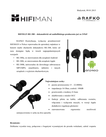 Białystok, 09.01.2015 HiFiMAN RE-300 – dokanałówki od audiofilskiego producenta już za 219zł! RAFKO Dystrybucja, wyłączny przedstawiciel HiFiMAN w Polsce wprowadza do sprzedaży najtańsze w historii marki słuchawki dokanałowe RE-300, które od razu dostępne będą w trzech najpopularniejszych wersjach: • RE-300a, ze sterowaniem dla urządzeń Android • RE-300i, ze sterowaniem dla urządzeń Apple • RE-300h, uniwersalne do dowolnego odtwarzacza MP3/MP4, smartfonów, tabletów i innych urządzeń z wyjściem słuchawkowym. Najważniejsze cechy: pasmo przenoszenia 15 – 22.000Hz impedancja 16 Ohm, czułość: 108dB przetwornik o średnicy 8.5mm okablowanie z miedzi OCC funkcje pilota na kablu: odbierania rozmów, włączania i wyłącznia muzyki, w wersji Apple dodatkowo regulacja głośności zaawansowana ergonomia: możliwość umiejscowienia w uchu na dwa sposoby Brzmienie: Delikatne wysokie tony, połączone z bogatymi wysuniętymi do przodu wokalami, całość wsparta ciepłym basem. Ceny: - 219zł za każdą dostępną wersję: RE-300A, RE-300i, RE-300h O marce HiFiMAN: HiFiMan to legendarna na terenie USA audiofilska marka, której właścicielem jest przedsiębiorstwo Head Direct z siedzibą w Nowym Jorku. Od kilku lat firma sukcesywnie wprowadza na rynek i popularyzuje alternatywny typ słuchawek określanych jako ortodynamiczne lub planarne. Jednym z pierwszych produktów jaki powstał w HiFiManie jest bez wątpienia najlepszy na świecie przenośny odtwarzacz audiofilski – HiFiMan HM-801. Produkt, który dał firmie międzynarodową sławę oraz bardzo mocną pozycję na amerykańskim rynku audiofilskim. Jakość marki HiFiMan: HiFiMan słynie z tego, że prototypy najwyższych modeli słuchawek dopracowuje przy udziale swoich potencjalnych Klientów. Normą stała się sytuacja, w której inżynierowie HiFiMana doszlifowują brzmienie swoich słuchawek w porozumieniu z użytkownikami audiofilskich for internetowych. Każdy nowy przetwornik od HiFiMana przechodzi aż roczny okres testowy. W efekcie tak nowatorskiej współpracy i zaufania w stosunku do swoich Klientów produkty HiFiMana uchodzą za niezwykle uniwersalne brzmieniowo oraz bezkonkurencyjnie niezawodne. http://hifiman.pl/ http://www.rafko.com/ Dodatkowych informacji udziela: Andrzej Lemański e-mail: [email protected] tel. (85) 747 97 58 tel. kom. 607 266 622 W kwestiach technicznych produktów HiFiMAN: Rafał Koc e-mail: [email protected] tel. (85) 747 97 51 Wszystkie użyte w informacji prasowej znaki towarowe, logotypy, loga, symbole są własnością ich prawowitych właścicieli. Ich użycie ma charakter wyłącznie informacyjny zgodnie z art. 156 ust. 1 pkt 3 P.w.p.