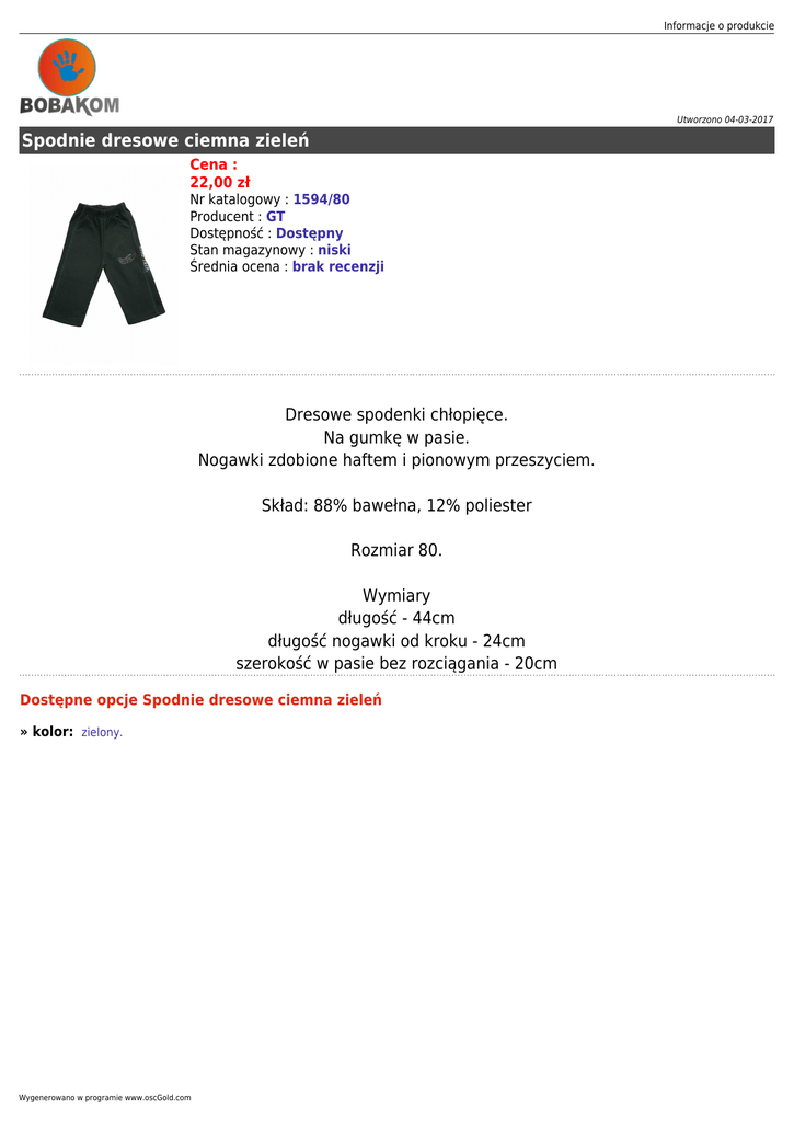 Informacje o produkcie Utworzono 04-03-2017 Spodnie dresowe ciemna zieleń Cena : 22,00 zł Nr katalogowy : 1594/80 Producent : GT Dostępność : Dostępny Stan magazynowy : niski Średnia ocena : brak recenzji Dresowe spodenki chłopięce. Na gumkę w pasie. Nogawki zdobione haftem i pionowym przeszyciem. Skład: 88% bawełna, 12% poliester Rozmiar 80. Wymiary długość - 44cm długość nogawki od kroku - 24cm szerokość w pasie bez rozciągania - 20cm Dostępne opcje Spodnie dresowe ciemna zieleń » kolor: zielony. Wygenerowano w programie www.oscGold.com