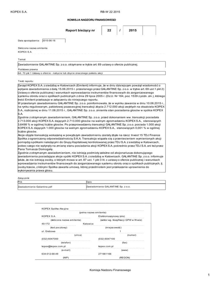 KOPEX S.A. RB-W 22 2015 KOMISJA NADZORU FINANSOWEGO Raport bieżący nr Data sporządzenia: 22 / 2015 2015-06-16 Skróc ona nazwa emitenta KOPEX S.A. Temat Zawiadomienie GALANTINE Sp. z o.o. otrzymane w trybie art. 69 ustawy o ofercie publicznej. Podstawa prawna Art. 70 pkt 1 Ustawy o oferc ie - nabyc ie lub zbycie znac znego pakietu akcji Treść raportu: Zarząd KOPEX S.A. z siedzibą w Katowicach (Emitent) informuje, że w dniu dzisiejszym powziął wiadomość o wpływie zawiadomienia z datą 15.06.2015 r. przesłanego przez GALANTINE Sp. z o.o. w trybie art. 69 ust.1 pkt 2) Ustawy o ofercie publicznej i warunkach wprowadzania instrumentów finansowych do zorganizowanego systemu obrotu oraz o spółkach publicznych z dnia 29 lipca 2005 r. (Dz.U. Nr 184, poz. 1539 z późn. zm.), którego treść Emitent przekazuje w załączeniu do niniejszego raportu. W przesłanym zawiadomieniu GALANTINE Sp. z o.o. poinformowała, że w wyniku zawarcia w dniu 10.06.2015 r., na rynku regulowanym, pakietowej pozasesyjnej transakcji zbycia 2.712.000 akcji zwykłych na okaziciela KOPEX S.A., rozliczonej w dniu 11.06.2015 r., GALANTINE Sp. z o.o. zmieniła stan posiadania głosów w spółce KOPEX S.A. Zgodnie z otrzymanym zawiadomieniem, GALANTINE Sp. z o.o. przed dokonaniem ww. transakcji posiadała 2.713.000 akcji KOPEX S.A. dających 2.713.000 głosów na walnym zgromadzeniu KOPEX S.A., stanowiących 3,6498 % w ogólnej liczbie głosów. Po przeprowadzeniu transakcji GALANTINE Sp. z o.o. posiada 1.000 akcji KOPEX S.A. dających 1.000 głosów na walnym zgromadzeniu KOPEX S.A., stanowiących 0,001 % w ogólnej liczbie głosów. Akcje objęte transakcją wskazaną w powyższym zawiadomieniu zostały zbyte na rzecz Invest 15 TDJ Finance Spółka z ograniczoną odpowiedzialnością S.K.A. Transakcja wiązała się z przeniesieniem wymienionych akcji pomiędzy spółkami należącymi do Grupy Kapitałowej kontrolowanej przez TDJ S.A. z siedzibą w Katowicach, wobec czego nie wpłynęły na zmianę stanu posiadania akcji KOPEX S.A. pośrednio przez TDJ S.A. ani też przez Pana Tomasza Domogałę. Zgodnie z otrzymanym zawiadomieniem, nie istnieją podmioty zależne od akcjonariusza dokonującego zawiadomienia posiadające akcje spółki KOPEX S.A. z siedzibą w Katowicach. GALANTINE Sp. z o.o. informuje także, że nie istnieją osoby, o których mowa w art. 87 ust. 1 pkt 3 lit. c ustawy o ofercie publicznej i warunkach wprowadzania instrumentów finansowych do zorganizowanego systemu obrotu oraz o spółkach publicznych, tj. osoby trzecie, z którymi Spółka zawarła umowę, której przedmiotem jest przekazanie uprawnienia do wykonywania prawa głosu. Załączniki Plik Opis Zawiadomienie Galantine.pdf Zawiadomienie GALANTINE Sp. z o.o. KOPEX Spółka Akc yjna (pełna nazwa emitenta) Elektromaszynowy (ele) KOPEX S.A. (skróc ona nazwa emitenta) 40-172 (sektor wg. klasyfikac ji GPW w W-wie) Katowice (kod poc ztowy) (miejscowość) ul. Grabowa 1 (ulic a) (032) 6047000 (numer) (032) 6047100 (telefon) [email protected] (fax) kopex.com.pl (e-mail) 634-012-68-49 (www) 271981166 (NIP) (REGON) Komisja Nadzoru Finansowego 1 KOPEX S.A. RB-W 22 2015 PODPISY OSÓB REPREZENTUJĄCYCH SPÓŁKĘ Data Imię i Nazwisko Stanowisko/Funkc ja 2015-06-16 Józef Wolski Prezes Zarządu 2015-06-16 Andrzej Meder Członek Zarządu Podpis Komisja Nadzoru Finansowego 2