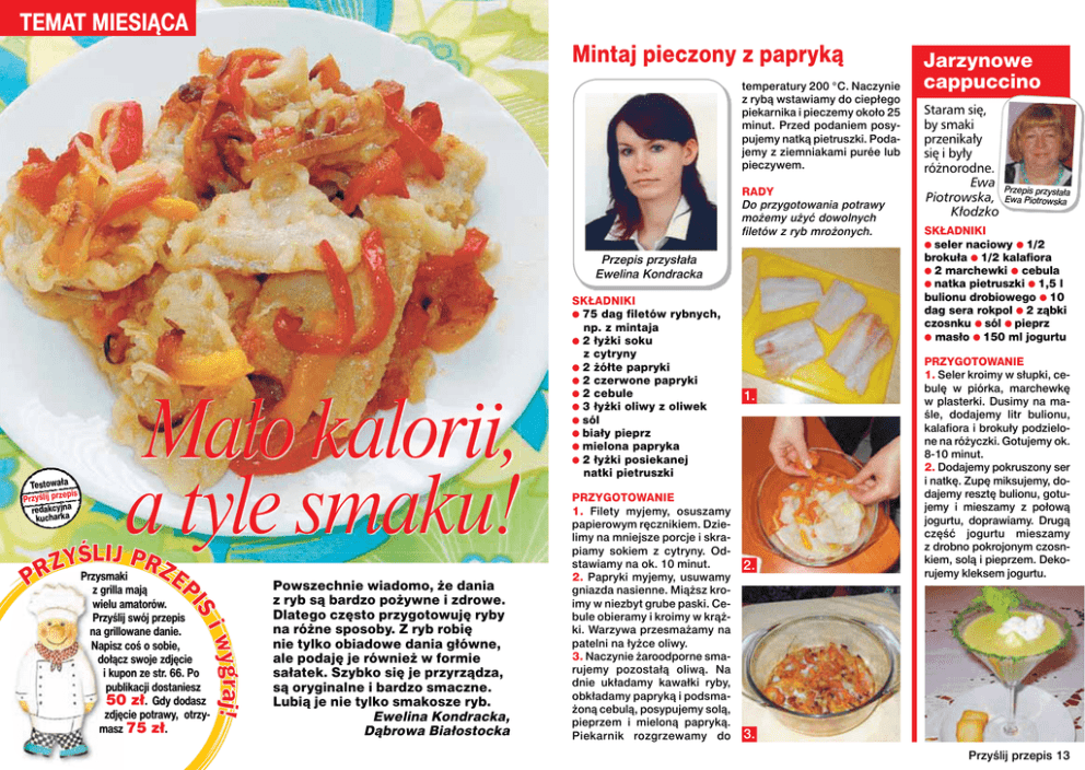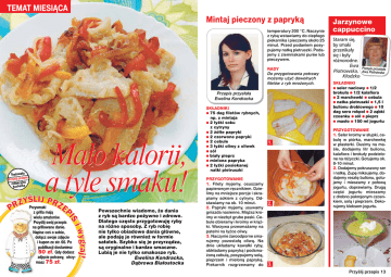 TEMAT MIESIĄCA Mintaj pieczony z papryką temperatury 200 °C. Naczynie z rybą wstawiamy do ciepłego piekarnika i pieczemy około 25 minut. Przed podaniem posypujemy natką pietruszki. Podajemy z ziemniakami purée lub pieczywem. RADY Do przygotowania potrawy możemy użyć dowolnych filetów z ryb mrożonych. Przepis przysłała Ewelina Kondracka Testowała pis Przyślij prze redakcyjna kucharka Mało kalorii, a tyle smaku! Przysmaki z grilla mają wielu amatorów. Przyślij swój przepis na grillowane danie. Napisz coś o sobie, dołącz swoje zdjęcie i kupon ze str. 66. Po publikacji dostaniesz 50 zł. Gdy dodasz zdjęcie potrawy, otrzymasz 75 zł. Powszechnie wiadomo, że dania z ryb są bardzo pożywne i zdrowe. Dlatego często przygotowuję ryby na różne sposoby. Z ryb robię nie tylko obiadowe dania główne, ale podaję je również w formie sałatek. Szybko się je przyrządza, są oryginalne i bardzo smaczne. Lubią je nie tylko smakosze ryb. Ewelina Kondracka, Dąbrowa Białostocka SKŁADNIKI ● 75 dag filetów rybnych, np. z mintaja ● 2 łyżki soku z cytryny ● 2 żółte papryki ● 2 czerwone papryki ● 2 cebule ● 3 łyżki oliwy z oliwek ● sól ● biały pieprz ● mielona papryka ● 2 łyżki posiekanej natki pietruszki PRZYGOTOWANIE 1. Filety myjemy, osuszamy papierowym ręcznikiem. Dzielimy na mniejsze porcje i skrapiamy sokiem z cytryny. Odstawiamy na ok. 10 minut. 2. Papryki myjemy, usuwamy gniazda nasienne. Miąższ kroimy w niezbyt grube paski. Cebule obieramy i kroimy w krążki. Warzywa przesmażamy na patelni na łyżce oliwy. 3. Naczynie żaroodporne smarujemy pozostałą oliwą. Na dnie układamy kawałki ryby, obkładamy papryką i podsmażoną cebulą, posypujemy solą, pieprzem i mieloną papryką. Piekarnik rozgrzewamy do 1. 2. Jarzynowe cappuccino Staram się, by smaki przenikały się i były różnorodne. Ewa Piotrowska, Kłodzko Przepis przysłała Ewa Piotrowska SKŁADNIKI ● seler naciowy ● 1/2 brokuła ● 1/2 kalafiora ● 2 marchewki ● cebula ● natka pietruszki ● 1,5 l bulionu drobiowego ● 10 dag sera rokpol ● 2 ząbki czosnku ● sól ● pieprz ● masło ● 150 ml jogurtu PRZYGOTOWANIE 1. Seler kroimy w słupki, cebulę w piórka, marchewkę w plasterki. Dusimy na maśle, dodajemy litr bulionu, kalafiora i brokuły podzielone na różyczki. Gotujemy ok. 8-10 minut. 2. Dodajemy pokruszony ser i natkę. Zupę miksujemy, dodajemy resztę bulionu, gotujemy i mieszamy z połową jogurtu, doprawiamy. Drugą część jogurtu mieszamy z drobno pokrojonym czosnkiem, solą i pieprzem. Dekorujemy kleksem jogurtu. 3. Przyślij przepis 13