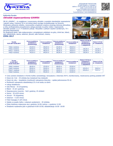 SPÓŁDZIELNIA TURYSTYCZNA 32-600 Oświęcim, ul. Solskiego 2 telefony: (0 48 33) 842-43-76, 842-27-19 tel/fax: (0 48 33) 842-59-94 e-mail: [email protected] Internet: www.turysta.oswiecim.pl Portal internetowy: www.nawakacje24.pl Ośrodek wypoczynkowy GAWRA OR-W „GAWRA” – to wyjątkowy i nowoczesny ośrodek o wysokim standardzie wyposażenia i jakości usług. Położony 50 m od dolnej stacji wyciągu krzesełkowego na Szrenicę. Atrakcyjne położenie obiektu, nowocześnie urządzone wnętrze emanują domową atmosferą a miła, profesjonalnie przygotowana załoga pozwala na pełny relaks i wypoczynek. Ośrodek posiada 1,2,3 i 4-osobowe pokoje. Wszystkie z pełnym węzłem sanitarnym, TV i skrzynką depozytową. Do dyspozycji gości: sala restauracyjna z przepięknym widokiem na góry, drink bar, bilard, sale szkoleniowe, sauna, solarium, jacuzzi, sala ćwiczeń, rowery. ZIMA 2017 Termin 14.01.2017-25.02.2017 Pokój 1-osobowy Pokój 2-osobowy Pokój 3 -osobowy Pokój 4-osobowy Termin 2-14.01.2017 i 25.02-19.03.2017 Pokój 1-osobowy Pokój 2-osobowy Pokój 3 -osobowy Pokój 4-osobowy Cena za pokój ze śniadaniem i obiadokolacją 225,00 370,00 555,00 740,00 zł zł zł zł Cena za pokój ze śniadaniem i obiadokolacją 180,00 296,00 444,00 592,00 zł zł zł zł Cena za pokój ze śniadaniem 200,00 320,00 480,00 640,00 zł zł zł zł Cena za pokój ze śniadaniem 155,00 246,00 369,00 492,00 zł zł zł zł Cena za osobę ze śniadaniem i obiadokolacją 225,00 185,00 185,00 185,00 zł zł zł zł Cena za osobę ze śniadaniem i obiadokolacją 180,00 148,00 148,00 148,00 zł zł zł zł Cena za osobę ze śniadaniem 200,00 160,00 160,00 160,00 zł zł zł zł Cena za osobę ze śniadaniem 155,00 123,00 123,00 123,00 zł zł zł zł Dzieci 4-12 lat ze śniadaniem i obiadokolacją ½ wyżywienia Dzieci 4-12 lat ze śniadaniem 130,00 zł 130,00 zł 130,00 zł 115,00 zł 115,00 zł 115,00 zł Dzieci 4-12 lat ze śniadaniem i obiadokolacją ½ wyżywienia Dzieci 4-12 lat ze śniadaniem 105,00 zł 105,00 zł 90,00 zł 90,00 zł Cena zawiera śniadanie w formie bufetu szwedzkiego, korzystanie z Internetu Wi-Fi, monitorowany, niestrzeżony parking podatek VAT Dzieci do 3 lat – 30 zł/doba bez świadczeń bez dostawki Dzieci do roku – bezpłatnie (możliwość wykupienia łóżeczka – opłata jednorazowa 50 zł) Możliwość wykupienia obiadokolacji 25 zł od osoby za dzień. Usługi dodatkowe: Sala fitness - 10 zł/1godzinę; Bilard - 15 zł/1 godzinę; Wypożyczenia rowerów - 5zł/1 godzinę; 25 zł/dzień Sauna - 30 zł/30 minut; Jacuzzi - 70 zł/godzinę; Solarium - 5 zł/5 minut; Fotel masujący 5 zł/5 minut. Opłata za pupila (tylko z własnym posłaniem) - 20 zł/doba. Doba hotelowa rozpoczyna się o godzinie 16:00, kończy o godzinie 12:00 Śniadanie wydawane jest w godzinach 8:00-10:00; obiadokolacje 16:00 -18:00