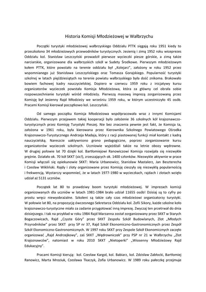 Historia Komisji Młodzieżowej w Wałbrzychu Początki turystyki młodzieżowej wałbrzyskiego Oddziału PTTK sięgają roku 1951 kiedy to przeszkolono 34 młodzieżowych przewodników turystycznych. Jesienią i zimą 1952 roku wiceprezes Oddziału kol. Stanisław Leszczyoski prowadził pierwsze wycieczki piesze górskie, a zimą także narciarskie, organizowane dla wałbrzyskich szkół w Sudety Środkowe. Pierwszym młodzieżowym kołem PTTK, które powstało na terenie oddziału był „Kolejarz”, założony w roku 1952 przez wspomnianego już Stanisława Leszczyoskiego oraz Tomasza Gorajskiego. Popularnośd turystyki szkolnej w latach pięddziesiątych na terenie powiatu wałbrzyskiego była dośd znikoma. Brakowało bowiem fachowej kadry nauczycielskiej. Dopiero w czerwcu 1959 roku z inicjatywy kursu organizatorów wycieczek powstała Komisja Młodzieżowa, która za główny cel obrała sobie rozpowszechnianie turystyki wśród młodzieży. Pierwszą masową imprezą zorganizowaną przez Komisję był Jesienny Rajd Młodzieży we wrześniu 1959 roku, w którym uczestniczyło 45 osób. Pracami Komisji kierował początkowo kol. Leszczyoski. Od samego początku Komisja Młodzieżowa współpracowała wraz z innymi Komisjami Oddziału. Pierwszym przejawem takiej kooperacji było założenie 36 szkolnych kół krajoznawczoturystycznych przez Komisję Turystyki Pieszej. Nie bez znaczenia pewnie jest fakt, że Komisja ta, założona w 1961 roku, była kierowana przez Kierownika Szkolnego Powiatowego Ośrodka Krajoznawczo-Turystycznego Andrzeja Madaja, który z racji piastowanej funkcji miał kontakt z kadrą nauczycielską. Nareszcie uaktywniono grono pedagogiczne, poprzez zorganizowanie kursu organizatorów wycieczek szkolnych. Uczniowie wyjeżdżali także na letnie obozy wędrowne. W drugiej połowie lat 70 dzięki kol. Bartłomiejowi Ranowiczowi Komisja rozwijała się niezwykle prężnie. Działało ok. 70 kół SKKT (sic!), zrzeszających ok. 1400 członków. Niezwykle aktywnie w prace Komisji włączali się opiekunowie SKKT: Maria Urbanowicz, Stanisław Mastalerz, Jan Beszterecha i Czesław Wiklioski. Rajdy i zloty organizowane przez Komisję cieszyły się niezwykłą popularnością i frekwencją. Wystarczy wspomnied, że w latach 1977-1980 w wycieczkach, rajdach i zlotach wzięło udział aż 5131 uczniów. Początek lat 80 to prawdziwy boom turystyki młodzieżowej. W imprezach komisji organizowanych dla uczniów w latach 1981-1984 brało udział 11655 osób! Dzisiaj są to cyfry po prostu wręcz niewyobrażalne. Szkoleni są także cały czas młodzieżowi organizatorzy turystyki. W połowie lat 80, na propozycję ówczesnego Sekretarza Oddziału kol. Zofii Sikory, każde szkolne koło krajoznawczo-turystyczne miało za zadanie przygotowad inną imprezę. Zwyczaj ten przetrwał do dnia dzisiejszego. I tak na przykład w roku 1984 Rajd Marzanna został zorganizowany przez SKKT w Starych Bogaczowicach, Rajd „Czyste Góry” przez SKKT Zespołu Szkół Budowlanych, Zlot „Młodych Przyrodników” przez SKKT przy SP nr 37, Rajd Szkół Ekonomiczno-Gastronomicznych przez Zespół Szkół Ekonomiczno-Gastronomicznych. W 1997 roku SKKT przy Zespole Szkół Ekonomicznych zaczęło organizowad „Rajd Andrzejkowy”, zaś SKKT „Wędrowniczek” przy PSP nr 21 w Wałbrzychu „Zlot Krajoznawców”, natomiast w roku 2010 SKKT „Nietoperki” „Wiosenny Młodzieżowy Rajd Edukacyjny”. Pracami Komisji kierują: kol. Czesław Kargol, kol. Babiarz, kol. Zdzisław Zabłocki, Bartłomiej Ranowicz, Marta Mroziuk, Czesława Tkaczyk, Zofia Urbanowicz. W 1989 roku pałeczkę przejmuje kol. Marta Przygoda i funkcję tę piastuje aż do 2009 roku. W latach 80 niezwykle prężnie działają: M.K. Urbanowiczowie, Lech Rębisz, Marta Przygoda, Marta Mroziuk, Jan Mazurek, Czesław Szwaja. Organizowane są m.i.n. takie imprezy jak: Rajd Skrzatów, 1-Majowe Zawody na Orientację, Rajd Szkół Ekonomiczno-Gastronomicznych, Rajd Młodzieży Szkolnej Trójgarb czy Akcja „Czyste Góry”. W latach 1985-1988 w imprezach Komisji uczestniczy aż 5471 osób. Największą popularnością cieszy się organizowany 21 marca Rajd Marzanna, w którym średnio każdego roku bierze udział 340 osób. W Zlocie Młodych Przyrodników uczestniczy średnio ok. 245 osób. Na początku lat 90, mimo zmiany ustrojowej w kraju nadal prężnie działają SKKT i ich opiekunowie: Marta Przygoda, Małgorzata Grędzioska, Artur Ciempa, Przemysław Chomiak, Jan Beszterecha, Czesław Szwaja. Szkoleni są nowi młodzieżowi organizatorzy turystyki. Pierwszy kurs ma miejsce w 1990 roku, a następny w 1991 roku. Warto zaznaczyd, że zostało też wyszkolonych kilku nowych młodzieżowych organizatorów turystyki w 2011 roku podczas kursu Organizatorów Turystyki. Młodzież wyjeżdża na obozy wędrowne, organizowane głównie przez kol. Małgorzatę Grędzioską, kol. Czesława Szwaję i kol. Artura Ciempę. Poznają m.i.n. uroki Pomorza Zachodniego i Środkowego, Kaszub, okolic Szczecina, Beskidu Żywieckiego, Niskiego, Śląskiego, Gorców, Tatr i Bieszczad. Przy okazji wycieczek młodzież zdobywała odznaki turystyki kwalifikowanej, głównie GOT oraz Młodzieżową Odznakę Krajoznawczą, Siedmiomilowe Buty a w 2010 roku Dziecięcą Odznakę Turystyczną. Warto zaznaczyd, że 10 uczniów w najnowszej historii oddziału otrzymało prestiżowe wyróżnienie Towarzystwa „Orli Lot”. Oprócz rajdów, zlotów i wycieczek Komisja organizowała także liczne konkursy oddziałowe, miejskie, powiatowe, również wojewódzkie. I tak od 2003 roku jest gospodarzem eliminacji wojewódzkich Ogólnopolskiego Konkursu Krasomówczego uczniów szkół podstawowych i młodzieży gimnazjalnej (od roku 2009 nazywanego Zlotem Krasomówców). Impreza gromadzi liczne grono adeptów piękna czystej polszczyzny i umiłowania swojej własnej ojczyzny. Ich liczba utrzymuje się mniej więcej na równym poziomie, z wyjątkiem pierwszego konk