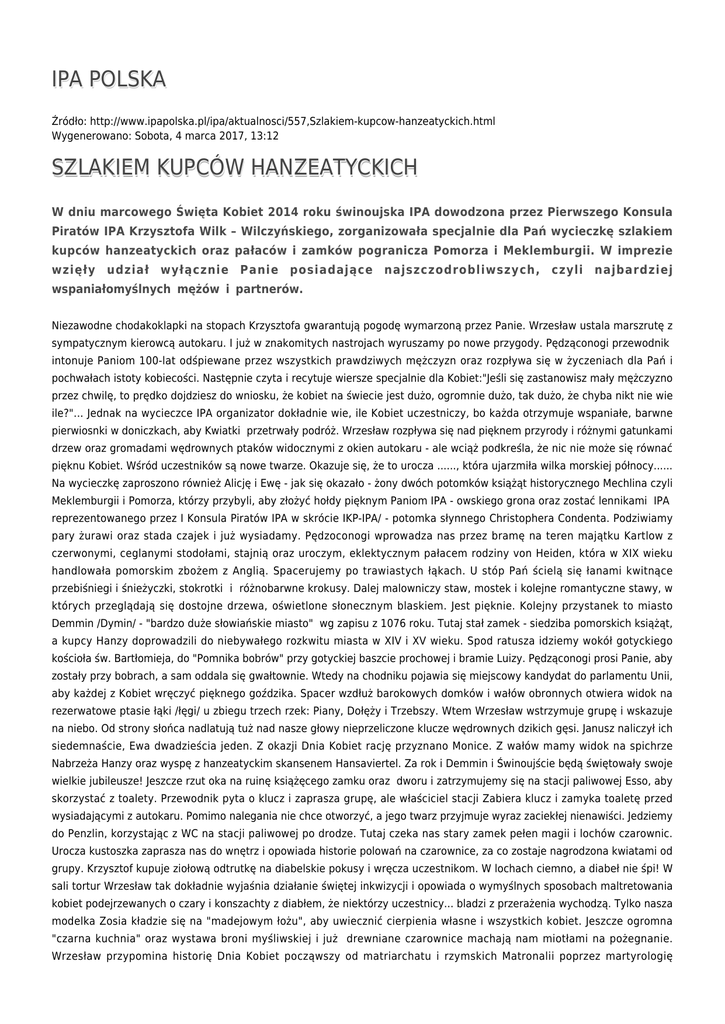 IPA POLSKA Źródło: http://www.ipapolska.pl/ipa/aktualnosci/557,Szlakiem-kupcow-hanzeatyckich.html Wygenerowano: Sobota, 4 marca 2017, 13:12 SZLAKIEM KUPCÓW HANZEATYCKICH W dniu marcowego Święta Kobiet 2014 roku świnoujska IPA dowodzona przez Pierwszego Konsula Piratów IPA Krzysztofa Wilk – Wilczyńskiego, zorganizowała specjalnie dla Pań wycieczkę szlakiem kupców hanzeatyckich oraz pałaców i zamków pogranicza Pomorza i Meklemburgii. W imprezie wzięły udział wyłącznie Panie posiadające najszczodrobliwszych, czyli najbardziej wspaniałomyślnych mężów i partnerów. Niezawodne chodakoklapki na stopach Krzysztofa gwarantują pogodę wymarzoną przez Panie. Wrzesław ustala marszrutę z sympatycznym kierowcą autokaru. I już w znakomitych nastrojach wyruszamy po nowe przygody. Pędząconogi przewodnik intonuje Paniom 100-lat odśpiewane przez wszystkich prawdziwych mężczyzn oraz rozpływa się w życzeniach dla Pań i pochwałach istoty kobiecości. Następnie czyta i recytuje wiersze specjalnie dla Kobiet:"Jeśli się zastanowisz mały mężczyzno przez chwilę, to prędko dojdziesz do wniosku, że kobiet na świecie jest dużo, ogromnie dużo, tak dużo, że chyba nikt nie wie ile?"... Jednak na wycieczce IPA organizator dokładnie wie, ile Kobiet uczestniczy, bo każda otrzymuje wspaniałe, barwne pierwiosnki w doniczkach, aby Kwiatki przetrwały podróż. Wrzesław rozpływa się nad pięknem przyrody i różnymi gatunkami drzew oraz gromadami wędrownych ptaków widocznymi z okien autokaru - ale wciąż podkreśla, że nic nie może się równać pięknu Kobiet. Wśród uczestników są nowe twarze. Okazuje się, że to urocza ......, która ujarzmiła wilka morskiej północy...... Na wycieczkę zaproszono również Alicję i Ewę - jak się okazało - żony dwóch potomków książąt historycznego Mechlina czyli Meklemburgii i Pomorza, którzy przybyli, aby złożyć hołdy pięknym Paniom IPA - owskiego grona oraz zostać lennikami IPA reprezentowanego przez I Konsula Piratów IPA w skrócie IKP-IPA/ - potomka słynnego Christophera Condenta. Podziwiamy pary żurawi oraz stada czajek i już wysiadamy. Pędzoconogi wprowadza nas przez bramę na teren majątku Kartlow z czerwonymi, ceglanymi stodołami, stajnią oraz uroczym, eklektycznym pałacem rodziny von Heiden, która w XIX wieku handlowała pomorskim zbożem z Anglią. Spacerujemy po trawiastych łąkach. U stóp Pań ścielą się łanami kwitnące przebiśniegi i śnieżyczki, stokrotki i różnobarwne krokusy. Dalej malowniczy staw, mostek i kolejne romantyczne stawy, w których przeglądają się dostojne drzewa, oświetlone słonecznym blaskiem. Jest pięknie. Kolejny przystanek to miasto Demmin /Dymin/ - "bardzo duże słowiańskie miasto" wg zapisu z 1076 roku. Tutaj stał zamek - siedziba pomorskich książąt, a kupcy Hanzy doprowadzili do niebywałego rozkwitu miasta w XIV i XV wieku. Spod ratusza idziemy wokół gotyckiego kościoła św. Bartłomieja, do "Pomnika bobrów" przy gotyckiej baszcie prochowej i bramie Luizy. Pędząconogi prosi Panie, aby zostały przy bobrach, a sam oddala się gwałtownie. Wtedy na chodniku pojawia się miejscowy kandydat do parlamentu Unii, aby każdej z Kobiet wręczyć pięknego goździka. Spacer wzdłuż barokowych domków i wałów obronnych otwiera widok na rezerwatowe ptasie łąki /łęgi/ u zbiegu trzech rzek: Piany, Dołęży i Trzebszy. Wtem Wrzesław wstrzymuje grupę i wskazuje na niebo. Od strony słońca nadlatują tuż nad nasze głowy nieprzeliczone klucze wędrownych dzikich gęsi. Janusz naliczył ich siedemnaście, Ewa dwadzieścia jeden. Z okazji Dnia Kobiet rację przyznano Monice. Z wałów mamy widok na spichrze Nabrzeża Hanzy oraz wyspę z hanzeatyckim skansenem Hansaviertel. Za rok i Demmin i Świnoujście będą świętowały swoje wielkie jubileusze! Jeszcze rzut oka na ruinę książęcego zamku oraz dworu i zatrzymujemy się na stacji paliwowej Esso, aby skorzystać z toalety. Przewodnik pyta o klucz i zaprasza grupę, ale właściciel stacji Zabiera klucz i zamyka toaletę przed wysiadającymi z autokaru. Pomimo nalegania nie chce otworzyć, a jego twarz przyjmuje wyraz zaciekłej nienawiści. Jedziemy do Penzlin, korzystając z WC na stacji paliwowej po drodze. Tutaj czeka nas stary zamek pełen magii i lochów czarownic. Urocza kustoszka zaprasza nas do wnętrz i opowiada historie polowań na czarownice, za co zostaje nagrodzona kwiatami od grupy. Krzysztof kupuje ziołową odtrutkę na diabelskie pokusy i wręcza uczestnikom. W lochach ciemno, a diabeł nie śpi! W sali tortur Wrzesław tak dokładnie wyjaśnia działanie świętej inkwizycji i opowiada o wymyślnych sposobach maltretowania kobiet podejrzewanych o czary i konszachty z diabłem, że niektórzy uczestnicy... bladzi z przerażenia wychodzą. Tylko nasza modelka Zosia kładzie się na "madejowym łożu", aby uwiecznić cierpienia własne i wszystkich kobiet. Jeszcze ogromna "czarna kuchnia" oraz wystawa broni myśliwskiej i już drewniane czarownice machają nam miotłami na pożegnanie. Wrzesław przypomina historię Dnia Kobiet począwszy od matriarchatu i rzymskich Matronalii poprzez martyrologię amerykańskich szwaczek - imigrantek po coroczny ormiański Miesiąc Kobiet. Panie z lubością przypominają sobie wspaniałe prezenty, jakie w tym dniu otrzymywały w czasach PRL-u. Były to obowiązkowe goździki oraz kawa i rajstopy, pachnące mydło i lniane ściereczki, czekolada, a nawet półhaleczki! Dalej zajeżdżamy do... Hollywood gdzie czeka nas zbiorowa fotografia z każdą aktorką – literą słynnego napisu i ... spacerujemy do dworu Wrodow wzorowanego na zameczkach Tudorów. Jesteśmy w Meklemburgii więc potomek książąt Mechlina - Meklemburga prędko przekonuje właściciela posiadłości, aby natychmiast zorganizował koncert na cześć Pań z IPA oraz oprowadził po pałacowych wnętrzach. Żona właściciela zasiada do fortepianu w ali ba
