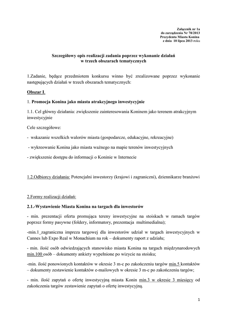 Załącznik nr 1a do zarządzenia Nr 78/2013 Prezydenta Miasta Konina z dnia 10 lipca 2013 roku Szczegółowy opis realizacji zadania poprzez wykonanie działań w trzech obszarach tematycznych 1.Zadanie, będące przedmiotem konkursu winno być zrealizowane poprzez wykonanie następujących działań w trzech obszarach tematycznych: Obszar I. 1. Promocja Konina jako miasta atrakcyjnego inwestycyjnie 1.1. Cel główny działania: zwiększenie zainteresowania Koninem jako terenem atrakcyjnym inwestycyjnie Cele szczegółowe: - wskazanie wszelkich walorów miasta (gospodarcze, edukacyjne, rekreacyjne) - wykreowanie Konina jako miasta ważnego na mapie terenów inwestycyjnych - zwiększenie dostępu do informacji o Koninie w Internecie 1.2.Odbiorcy działania: Potencjalni inwestorzy (krajowi i zagraniczni), dziennikarze branżowi 2.Formy realizacji działań: 2.1.-Wystawienie Miasta Konina na targach dla inwestorów - min. prezentacji oferta promująca tereny inwestycyjne na stoiskach w ramach targów poprzez formy pasywne (foldery, informatory, prezentacja multimedialna); -min.1 zagraniczna impreza targowej dla inwestorów udział w targach inwestycyjnych w Cannes lub Expo Real w Monachium na rok – dokumenty raport z udziału; - min. ilość osób odwiedzających stanowisko miasta Konina na targach międzynarodowych min.100 osób – dokumenty ankiety wypełnione po wizycie na stoisku; -min. ilość ponowionych kontaktów w okresie 3 m-c po zakończeniu targów min.5 kontaktów – dokumenty zestawienie kontaktów e-mailowych w okresie 3 m-c po zakończeniu targów; - min. ilość zapytań o ofertę inwestycyjną miasta Konin min.3 w okresie 3 miesięcy od zakończenia targów zestawienie zapytań o ofertę inwestycyjną. 1 Rekomendowany sposób realizacji zadania: 1) Prezentacja na targach: program dynamicznego stanowiska Miasta Konin podczas targów w tym wskazanie wszelkich innych walorów miasta (położenie w centrum Polski, miasto na Szlaku Bursztynowy, wykształcone kadry, bogata oferta kulturalna, turystyka lokalna) poprzez tzw. dynamiczne stoisko (np. prezentacje, występy artystyczne, degustacja potraw); 2) udział w min. 2 targach krajowych wraz z pokazem dynamicznym stoiska na rok ; - min. ilość osób odwiedzających stanowisko miasta Konina na targach krajowych min.100 osób – dokumenty ankiety wypełnione po wizycie na stoisku; -ilość ponowionych kontaktów w okresie 3 m-c po zakończeniu targów min.5 kontaktów – dokumenty zestawienie kontaktów e-mailowych w okresie 3 m-c po zakończeniu targów; -ilość zapytań o ofertę inwestycyjną miasta Konin min.3 w okresie 3 miesięcy od zakończenia targów zestawienie zapytań o ofertę inwestycyjną. 2.2.- Utworzenie portalu internetowego dotyczącego oferty inwestycyjnej Konina -stworzenie, opracowanie treści, promocja oraz administracja portalu min. w czterech językach: w języku polskim, angielskim, niemiecki, rosyjski (zawierający: prezentacja terenów inwestycyjnych, prezentacja gospodarcza Konina, otoczenia społeczno-kulturalnego, rekreacyjnego Konina, prezentacja otoczenia prawnego krajowego/lokalnego, „Ścieżka inwestora”, dane kontaktowe, statystyka Konina i regionu); Rekomendowany sposób realizacji zadania: -portalu min. w sześciu językach: w języku polskim, angielskim, niemiecki, rosyjski, chiński i francuski -min. ilość zarejestrowanych użytkowników (firm) portalu wraz zapytaniem: 100/rok – dokumenty statystyka portalu ( ilość e-maili, telefonów, wizyt na portalu). Sposób działania portalu: 1. 2. 3. 4. Kwartalny newsletter dla użytkowników skierowany do potencjalnych inwestorów (4 w roku) w języku polskim i angielskim Mailing reklamowo-promocyjny 30 miesięcznie dla niepowtarzających się adresatów w języku polskim i angielskim Administrowanie profilem na Facebook lub innych portalach społecznościowych Integracja portalu z serwisem miasta www.konin.pl Rekomendowany sposób realizacji zadania : -infolinia uzupełniająca portal. 2 2.3. Wywołanie zdarzenia promującego Miasto Konin jako miasto z terenami inwestycyjnymi. -zorganizowanie min. 1 konferencji na rok (min. 2 dniowej) wraz ze sesjami warsztatowymi w ramach konferencji (min.3 sesje) dotyczącej inwestowania w Polsce, Konin jako miasto z terenami inwestycyjnymi -wizytacja na terenach inwestycyjnych Konina - ilość uczestników konferencji min. 30 przedsiębiorców zewnętrznych, min.5 dziennikarzy branżowych z różnych mediów– dokumenty: listy obecności; -udział w konferencji po jednym przedstawicielu rządu ds. gospodarczych i instytucji finansowych lub okołobiznesowych w charakterze prelegentów -ilość zapytań o oferty inwestycyjne Miasta Konin w ciągu 2 miesięcy od zakończenia konferencji min. 2 zapytania – dokumenty -wysłane oferty (e-mail, poczta); -ilość materiałów prasowych, telewizyjnych, radiowych, internetowych opisujących Konin jako miejsce inwestycji w ciągu 2 miesięcy od zakończenia konferencji - min.3 – zestawienie artykułów; Rekomendowany sposób realizacji zadania: -zorganizowanie min. 1 konferencji na rok (min. 2 dniowej) wraz ze sesjami warsztatowymi w ramach konferencji (min.5 sesje) dotyczącej inwestowania w Polsce, Konin jako miasto z terenami inwestycyjnymi -udział w konferencji po dwóch przedstawicieli rządu ds. gospodarczych i instytucji finansowych lub okołobiznesowych w charakterze prelegentów - ilość uczestników konferencji min. 60 przedsiębiorców zewnętrznych, min.10 dziennikarzy branżowych z różnych mediów– dokumenty: listy obecności; -ilość artykułów, materiałów prasowych, telewizyjnych, opisujących konferencje – min. 5 – zestawienie artykułów. radiowych, internetowych 3.Warunki techniczne służące do realizacji zadania (potencjał techniczny) 3.1.Wyposażenie stoiska targowego: -materiały drukowane – mapy i plany zagospodarowania terenów inwestycyjnych, foldery informacyjne o Koninie, ulotki min. w j. angielskim -prez