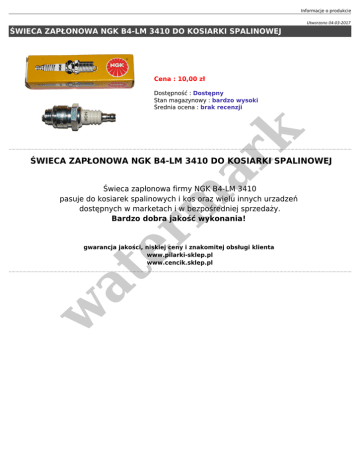 Informacje o produkcie Utworzono 04-03-2017 ŚWIECA ZAPŁONOWA NGK B4-LM 3410 DO KOSIARKI SPALINOWEJ Cena : 10,00 zł er m ar k Dostępność : Dostępny Stan magazynowy : bardzo wysoki Średnia ocena : brak recenzji ŚWIECA ZAPŁONOWA NGK B4-LM 3410 DO KOSIARKI SPALINOWEJ Świeca zapłonowa firmy NGK B4-LM 3410 pasuje do kosiarek spalinowych i kos oraz wielu innych urzadzeń dostępnych w marketach i w bezpośredniej sprzedaży. Bardzo dobra jakość wykonania! w at gwarancja jakości, niskiej ceny i znakomitej obsługi klienta www.pilarki-sklep.pl www.cencik.sklep.pl