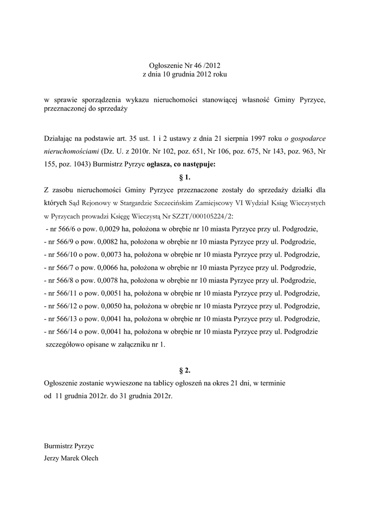 Ogłoszenie Nr 46 /2012 z dnia 10 grudnia 2012 roku w sprawie sporządzenia wykazu nieruchomości stanowiącej własność Gminy Pyrzyce, przeznaczonej do sprzedaży Działając na podstawie art. 35 ust. 1 i 2 ustawy z dnia 21 sierpnia 1997 roku o gospodarce nieruchomościami (Dz. U. z 2010r. Nr 102, poz. 651, Nr 106, poz. 675, Nr 143, poz. 963, Nr 155, poz. 1043) Burmistrz Pyrzyc ogłasza, co następuje: § 1. Z zasobu nieruchomości Gminy Pyrzyce przeznaczone zostały do sprzedaży działki dla których Sąd Rejonowy w Stargardzie Szczecińskim Zamiejscowy VI Wydział Ksiąg Wieczystych w Pyrzycach prowadzi Księgę Wieczystą Nr SZ2T/000105224/2: - nr 566/6 o pow. 0,0029 ha, położona w obrębie nr 10 miasta Pyrzyce przy ul. Podgrodzie, - nr 566/9 o pow. 0,0082 ha, położona w obrębie nr 10 miasta Pyrzyce przy ul. Podgrodzie, - nr 566/10 o pow. 0,0073 ha, położona w obrębie nr 10 miasta Pyrzyce przy ul. Podgrodzie, - nr 566/7 o pow. 0,0066 ha, położona w obrębie nr 10 miasta Pyrzyce przy ul. Podgrodzie, - nr 566/8 o pow. 0,0078 ha, położona w obrębie nr 10 miasta Pyrzyce przy ul. Podgrodzie, - nr 566/11 o pow. 0,0051 ha, położona w obrębie nr 10 miasta Pyrzyce przy ul. Podgrodzie, - nr 566/12 o pow. 0,0050 ha, położona w obrębie nr 10 miasta Pyrzyce przy ul. Podgrodzie, - nr 566/13 o pow. 0,0041 ha, położona w obrębie nr 10 miasta Pyrzyce przy ul. Podgrodzie, - nr 566/14 o pow. 0,0041 ha, położona w obrębie nr 10 miasta Pyrzyce przy ul. Podgrodzie szczegółowo opisane w załączniku nr 1. § 2. Ogłoszenie zostanie wywieszone na tablicy ogłoszeń na okres 21 dni, w terminie od 11 grudnia 2012r. do 31 grudnia 2012r. Burmistrz Pyrzyc Jerzy Marek Olech Załącznik nr 1 do ogłoszenia nr 46/2012 Burmistrza Pyrzyc z dnia 10 grudnia 2012r. WYKAZ nieruchomości stanowiącej własność Gminy Pyrzyce przeznaczonej do sprzedaży Działka nr 566/6 o pow. 0,0029 ha, położona w obrębie nr 10 miasta Pyrzyce przy ul. Podgrodzie, KW Nr SZ2T/000105224/2 Opis nieruchomości Przedmiotowa działka gruntu położona jest w kompleksie gruntów zabudowanych budynkami mieszkalnymi przy ul. Podgrodzie. Działka została wydzielona z działki nr 566 na powiększenie nieruchomości przyległej. Stanowi ona nieruchomość gruntową nie zabudowaną przyległą od strony południowej do nieruchomości zabudowanej budynkiem mieszkalnym na działce nr 420/3 natomiast od strony wschodniej na odcinku 2 m /szerokości działki/ do drogi stanowiącej działkę nr 536, z której możliwy jest dojazd. Działka w kształcie wydłużonego prostokąta. Położenie działki jej kształt i wielkość umożliwia wykorzystanie terenu na powiększenie nieruchomości przyległych pod teren zielony – ogród. Przeznaczanie nieruchomości w planie zagospodarowania przestrzennego Działka nie jest objęta aktualnym planem zagospodarowania przestrzennego. W Studium uwarunkowań i kierunków zagospodarowania przestrzennego, położona jest w strefie rolniczej przestrzeni produkcyjnej (obszar rolnictwa ekstensywnego). Zobowiązania i obciążenia brak Forma sprzedaży Przetarg ustny nieograniczony Cena wywoławcza nieruchomości 1 000,00 zł + 23% VAT Działka nr 566/9 o pow. 0,0082 ha, położona w obrębie nr 10 miasta Pyrzyce przy ul. Podgrodzie, KW Nr SZ2T/000105224/2 Opis nieruchomości Przedmiotowa działka gruntu położona jest w kompleksie gruntów zabudowanych budynkami mieszkalnymi przy ul. Podgrodzie. Działka została wydzielona z działki nr 566 na powiększenie nieruchomości przyległej. Stanowi ona nieruchomość gruntową nie zabudowaną przyległą od strony południowej do nieruchomości zabudowanej budynkiem mieszkalnym na działce nr 420/12 natomiast od strony zachodniej na odcinku 2 m /szerokości działki/ do działki nr 376/10. Działka w kształcie wydłużonego prostokąta. Położenie działki jej kształt i wielkość umożliwia wykorzystanie terenu na powiększenie nieruchomości przyległych pod teren zielony – ogród. Przeznaczanie nieruchomości w planie zagospodarowania przestrzennego Działka nie jest objęta aktualnym planem zagospodarowania przestrzennego. W Studium uwarunkowań i kierunków zagospodarowania przestrzennego, położona jest w strefie rolniczej przestrzeni produkcyjnej (obszar rolnictwa ekstensywnego) Zobowiązania i obciążenia brak Forma sprzedaży Przetarg ustny ograniczony Cena wywoławcza nieruchomości 2900,00 zł + 23% VAT Działka nr 566/10 o pow. 0,0073 ha, położona w obrębie nr 10 miasta Pyrzyce przy ul. Podgrodzie, KW Nr SZ2T/000105224/2 Opis nieruchomości Przedmiotowa działka gruntu położona jest w kompleksie gruntów zabudowanych budynkami mieszkalnymi przy ul. Podgrodzie. Działka została wydzielona z działki nr 566 na powiększenie nieruchomości przyległej. Stanowi ona nieruchomość gruntową nie zabudowaną przyległą od strony północnej do nieruchomości zabudowanej budynkiem mieszkalnym na działce nr 544 natomiast od strony zachodniej na odcinku 2 m /szerokości działki/ do działki nr 376/10. Działka w kształcie wydłużonego prostokąta. Położenie działki jej kształt i wielkość umożliwia wykorzystanie terenu na powiększenie nieruchomości przyległych pod teren zielony – ogród. Przeznaczanie nieruchomości w planie zagospodarowania przestrzennego Działka nie jest objęta aktualnym planem zagospodarowania przestrzennego. W Studium uwarunkowań i kierunków zagospodarowania przestrzennego, położona jest w strefie rolniczej przestrzeni produkcyjnej (obszar rolnictwa ekstensywnego) Zobowiązania i obciążenia brak Forma sprzedaży Przetarg ustny ograniczony Cena wywoławcza nieruchomości 2600,00 + 23% VAT Działka nr 566/7 o pow. 0,0066 ha, położona w obrębie nr 10 miasta Pyrzyce przy ul. Podgrodzie, KW Nr SZ2T/000105224/2 Opis nieruchomości Przedmiotowa działka gruntu położona jest w kompleksie gruntów zabudowanych budynkami mieszkalnymi przy ul. Podgrodzie. Działka została wydzielona z dzia