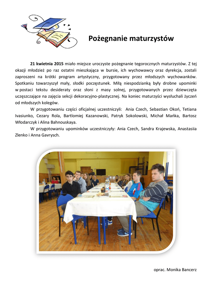Pożegnanie maturzystów 21 kwietnia 2015 miało miejsce uroczyste pożegnanie tegorocznych maturzystów. Z tej okazji młodzież po raz ostatni mieszkająca w bursie, ich wychowawcy oraz dyrekcja, zostali zaproszeni na krótki program artystyczny, przygotowany przez młodszych wychowanków. Spotkaniu towarzyszył mały, słodki poczęstunek. Miłą niespodzianką były drobne upominki w postaci tekstu desideraty oraz słoni z masy solnej, przygotowanych przez dziewczęta uczęszczające na zajęcia sekcji dekoracyjno-plastycznej. Na koniec maturzyści wysłuchali życzeń od młodszych kolegów. W przygotowaniu części oficjalnej uczestniczyli: Ania Czech, Sebastian Okoń, Tetiana Ivasiunko, Cezary Rola, Bartlomiej Kazanowski, Patryk Sokolowski, Michał Mańka, Bartosz Włodarczyk i Alina Bahnouskaya. W przygotowaniu upominków uczestniczyły: Ania Czech, Sandra Krajewska, Anastasiia Zlenko i Anna Gavrysch. oprac. Monika Bancerz