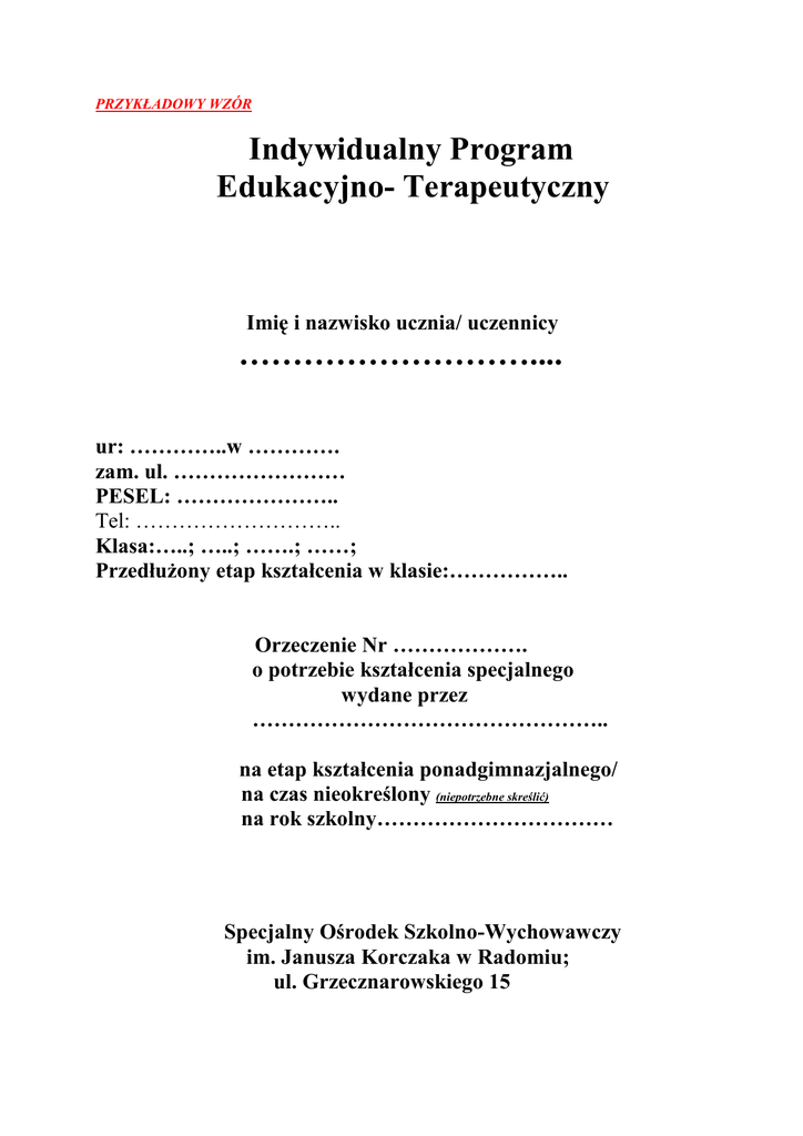 PRZYKŁADOWY WZÓR Indywidualny Program Edukacyjno- Terapeutyczny Imię i nazwisko ucznia/ uczennicy ……………………….... ur: …………..w …………. zam. ul. …………………… PESEL: ………………….. Tel: ……………………….. Klasa:…..; …..; …….; ……; Przedłużony etap kształcenia w klasie:…………….. Orzeczenie Nr ………………. o potrzebie kształcenia specjalnego wydane przez ………………………………………….. na etap kształcenia ponadgimnazjalnego/ na czas nieokreślony (niepotrzebne skreślić) na rok szkolny…………………………… Specjalny Ośrodek Szkolno-Wychowawczy im. Janusza Korczaka w Radomiu; ul. Grzecznarowskiego 15 Publiczna Szkoła Przysposabiająca do Pracy Uczeń/ uczennica ……………………………. (imię i nazwisko ucznia/ uczennicy) uczestniczy w zajęciach edukacyjno- terapeutycznych w zespole klasowym. Jest nauczany/a w oparciu o Indywidualny Program Edukacyjno- Terapeutyczny opracowany przez zespół nauczycieli uczących w tej klasie i zgodny z Podstawą programową kształcenia ogólnego dla szkół specjalnych przysposabiających do pracy dla uczniów z upośledzeniem umysłowym w stopniu umiarkowanym lub znacznym oraz dla uczniów z niepełnosprawnościami sprzężonymi obowiązującą od 1 września 2009 r. na podstawie Rozporządzenia Ministra Edukacji Narodowej z dn. 23 grudnia 2008 r. Priorytetem w edukacji dziecka z upośledzeniem umysłowym jest wyposażenie go w takie umiejętności, aby: - mogło porozumiewać się z otoczeniem w najpełniejszy sposób, -zdobyło maksymalną niezależność życiową w zakresie zaspokajania podstawowych potrzeb życiowych, - było zaradne w życiu codziennym, adekwatnie do indywidualnego poziomu sprawności i umiejętności życiowych oraz posiadało poczucie sprawczości, - mogło uczestniczyć w różnych formach życia społecznego na równi z innymi członkami danej zbiorowości, znając i przestrzegając ogólnie przyjętych norm współżycia społecznego zachowując zarazem prawo do intymności. Najważniejsze informacje o uczniu: (na podstawie obserwacji, analizy orzeczenia, rozmowy z rodzicami/ opiekunami prawnymi, wielospecjalistycznej oceny funkcjonowania ucznia/ uczennicy); • Stopień upośledzenia umysłowego: ……………… • Stan zdrowia ucznia/ uczennicy (zaburzenia towarzyszące): a) …………………………………. b) ………………………………….. c) ………………………………….. d) ………………………………….. • Szczególne zalecenia medyczne (z zaświadczenia lekarskiego); w tym: …………………………………………………………………………………………… Reakcje emocjonalne ucznia/ uczennicy: (z obserwacji)…………………………………………………………………………………. ………………………………………………………………………………………………….. …………………………………………………………………………………………………… (z orzeczenia)………………………………………………………………………………. ……………………………………………………………………………………………….. ………………………………………………………………………………………………… • Współpraca w grupie (z obserwacji n-la po co najmniej miesiącu ): ……………………………………………………………………………………………… ……………………………………………………………………………………………… ……………………………………………………………………………………………… ………………………………………………………………………………………………. (należy wpisać zaobserwowane istotne zmiany w funkcjonowaniu dziecka przez cały okres pracy z nim) ……………………………………………………………………………………………………… ……………………………………………………………………………………………………… ………………………………………………………………………………………………………. • Jak komunikuje się z otoczeniem ( z orzeczenia i obserwacji)- informacja wstępna ……………………………………………………………………………………………………… ……………………………………………………………………………………………………… ……………………………………………………………………………………………………… ……………………………………………………………………………………………………… (należy wpisać zaobserwowane istotne zmiany w funkcjonowaniu dziecka przez cały okres pracy z nim) • • ……………………………………………………………………………………………………… ……………………………………………………………………………………………………… ……………………………………………………………………………………………............... Zakres samoobsługi: (z obserwacji, rozmowy z rodzicem/ opiekunem prawnym, uczniem): ……………………………………………………………………………………………………… ……………………………………………………………………………………………………… ……………………………………………………………………………………………………… …………………………………………………………………………