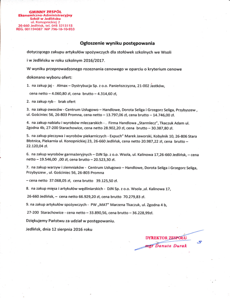 GM|NNY ZESPÓŁ m inistracyjny szkół w Jedlińsku Ekonomlczno-Ad ul. Konopnickiej 2 26-66a Jedlińsk, te|.048 32131l5 REG.001 194087 NlP 796_18_10-933 Ogłoszen!e wyniku postępowania dotyczącego zakupu artykułów spożywczych dla stołówek szkolnych we Wsoli iw Jedlińsku w roku szkolnym 2Ot6l2O77, W wyniku przeprowadzonego rozeznania cenowego w oparciu o kryterium cenowe dokonano wyboru ofert: - 1. na zakup jaj cena netto - Almax - Dystrybucja Sp. z o.o. Panieńs zczyzna, 21-0)2Jistków, 4.050,80 zł, cena brutto 2. na zakup ryb - - 4.314,60 zl, brak ofert 3. na zakup owoców - Centrum Usługowo - ul. Gościniec56, 26-803 Promna, cena netto Handlowe, Dorota Seliga i GrzegorzSeliga, Przybyszew, - 73.797,a6 zł, cena brutto - t4,746,oo zł. 4. na zakup nabiału i wyrobów mleczarskich - . Firma Handlowa ,,Starmlecz", Tkaczuk Adam ul. Zgodna 4b,27-2OO Starachowice, cena netto 28.902,2O zł, cena brutto - 30.387,80 zł. 5. na zakup pieczywa i wyrobów piekarniczych - Expuch" Marek Jaworski, Kobylnik 10, 26-806 Stara Błotnica, Piekarnia ul. Konopnickiej 23, 26-660 Jedlińsk, cena netto 20.987,22 zł, cena brutto - ż2.120,04 zł. 6. na zakup wyrobów garmażeryjnych - DJN Sp. z o.o. Wsola, ul. Kalinowa 17,26-66oJedlińsk, - cena netto - 19.546,00 ,oo zl, cena brutto - 2o.523,3o zł. 7. na zakup warzyw i ziemniaków - Centrum Usługowo - Handlowe, Dorota Seliga i Grzegorz Seliga, Przybyszew, ul. Gościniec 56, 26-803 Promna - cena netto 37.068,05 zł, cena brutto 39.t25,50 zl. 8. na zakup mięsa i artykułów węd|iniarskich - DJN Sp. z o.o. Wsola ,ul. Kalinowa 17, ż6-660 Jedlińsk, - cena netto 66.929,2O zł, cena brutto 70.279,83 zl. 9. na zakup artykułów spożywczych - 27-200 Starachowice - cena netto - PW,,MAr Marzena Tkaczuk, ul, Zgodna 4 b, 33.890,56, cena brutto - 36.228,99zl. Dziękujemy Państwu za udział w postępowaniu. Jedlińsk, dnia ].2 sierpnia 2016 roku nuta Durak