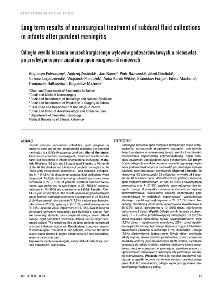 Praca O R Y G I N A L N A / original article Long term results of neurosurgical treatment of subdural fluid collections in infants after purulent meningitis Odległe wyniki leczenia neurochirurgicznego wylewów podtwardówkowych u niemowląt po przebytym ropnym zapaleniu opon mózgowo-rdzeniowych Augustyn Folwaczny1, Andrzej Życiński2 , Jan Baron3, Piotr Bażowski2, Józef Dzielicki4, Tomasz Legaszewski5, Wojciech Pieniążek1, Anna Kuroś-Wikło6, Stanisław Furgał1, Edyta Machura1, Franciszek Halkiewicz1, Bogusław Mazurek7 Chair and Department of Paediatrics in Zabrze Chair and Clinic of Neurosurgery 3 Chair and Department of Radiology and Nuclear Medicine 4 Chair and Department of Paediatric`s Surgery in Zabrze 5 First Chair and Department of Radiology in Zabrze 6 Chair and Clinic of Anesthesiology and Intensive Care 7 Department of Paediatric Cardiology Medical University of Silesia, Katowice 1 2 ABSTRACT Despite efficient vaccination schedules, great progress in intensive care and potent antimicrobial therapies the bacterial meningitis is still life-threatening condition. Aim of the study: Assessment of remote neurosurgical – treatment results of subdural fluid collections in infants after bacterial meningitis. Material: 40 infants (12 girls and 28 boys) aged 3 weeks to 10 month of life. All the children had a history of purulent meningitis in: 14 (35%) with concomitant septicemia – and meningo- encephalitis in 7 (17,5%). In all patients subdural fluid collections were diagnosed. Multiple decompressing subdural punctures were performed in 27 (67,5%) of patients. Bilateral burr-hole trepanation was performed in two stages in 28 (70%) of patients, unilateral in 10 (25%) and craniotomy in 2 (5%). Results: After 13-31 year observations, the results of neurosurgical treatment are as follows: normal psychomotor development in 33 (82,5%) of children, mental retardation in 3 (7,5%), serious psychomotor retardation in 2 (5%), epilepsy in (3) 7,5%, partial hearing loss in (6) 15%, unilateral visual impairment in 3 (7,5%). Two of patients completed university education, two bachelor’s degree, four are university students, five completed college, seven attend college, eight completed vocational school, five attended secondary school. The remaining five disabled patients completed or attend individual education. Conclusions: Long term results of neurosurgical treatment in our patients, who are the most severe cases treated in region inhabited by 6,5 mln population, seem to be satisfactory. Key words: bacterial meningitis, subdural fluid collections, burr hole trepanation, craniotomy. Vol . 1 9 /20 1 0 , n r 3 8 Streszczenie Bakteryjne zapalenia opon mózgowo-rdzeniowych mimo wprowadzenia skutecznych programów szczepień ochronnych, dużych postępów w intensywnej terapii, szerokich możliwości zastosowania odpowiedniej antybiotykoterapii, nadal pozostają poważnym, zagrażającym życiu schorzeniem. Cel pracy: Ocena odległych wyników leczenia neurochirurgicznego wylewów podtwardówkowych u niemowląt po przebytym ropnym zapaleniu opon mózgowo-rdzeniowych. Materiał i metoda: 40 niemowląt (12 dziewczynek i 28 chłopców) w wieku od 3 tygodni do 10 miesiąca życia. Wszystkie dzieci przebyły zapalenie opon mózgowo-rdzeniowych, w tym 14 (35%) z towarzyszącą posocznicą oraz 7 (17,5%) zapalenie opon mózgowo-rdzeniowych i mózgu. U wszystkich niemowląt stwierdzono wylewy podtwardówkowe. Wielokrotne nakłucia odbarczające podtwardówkowe w oddziałach macierzystych województwa śląskiego i opolskiego wykonywano u 27 (67,5%) dzieci. Trepanację otworkową obustronną wykonywano dwuetapowo u 28 (70%) dzieci, jednostronną u 10 (25%) dzieci. Kraniotomię wykonano u 2 dzieci. Wyniki: Odległe wyniki leczenia po obserwacji 13 – 31-letniej przedstawiają się następująco: 33 (82,5%) dzieci wykazuje prawidłowy rozwój psychomotoryczny, troje (7,5%) dzieci – upośledzenie umysłowe, 2(5%) dzieci upośledzenie psychomotoryczne dużego stopnia, u trojga (7,5%) dzieci stwierdzono padaczkę, u sześciorga (15%) niedosłuch, u trojga (7,5%) niedowidzenie jednostronne. Dwoje dzieci ukończyło szkołę wyższą, dwoje studium pomaturalne, czworo uczęszcza do szkoły wyższej, pięcioro ukończyło szkołę średnią, siedmioro uczęszcza do szkoły średniej, ośmioro ukończyło szkołę zawodową, pięcioro uczęszcza do gimnazjum, pozostałe pięcioro z upośledzeniem umysłowym ukończyło lub kontynuuje nauczanie indywidualne. Wniosek: Mimo że materiał obejmował najcięższe przypadki leczone na terenie obszaru zamieszkanego przez około 6,5 mln ludności, odległy wynik postępowania terapeutycznego wydaje się dobry. 33 Praca O R Y G I N A L N A / original article A. Folwaczny, A. Życiński, J. Baron et al. Słowa kluczowe: zapalenia opon mózgowo-rdzeniowych, wylewy podtwardówkowe, trepanacje otworkowe, kraniotomia Despite efficient vaccination schedules, great progress in intensive care and potent antimicrobial therapies, bacterial meningitis (BM) is still life-threatening condition [1-5]. In Europe the incidence of the disease ranges from 2 – 6 cases per 100000 [1]. Onset of BM occurs most often in the first two years of life [1]. Mortality in meningococcal BM in children reaches 1 – 4% [1], and according to literature, the data is markedly higher when meningococcal sepsis occurs. In pneumococcal BM the mortality ranges from 6 to 20% with higher incidence of complications and neurological deficits [1]. 15% out of 482 children presented by Peltola and al. died [6]. Presently, in Europe, as a result of efficient vaccination program, BM caused by Haemophilus influenzae B occurs mainly in non-vaccinees [1]. Mortality within this group amounts to 3%. In preterms remote consequences occur in up to 50% of patients [7]. Higher incidence of neurological complications and deaths is observed in malnourished children with body mass deficit [8]. Immediate empirical antimic