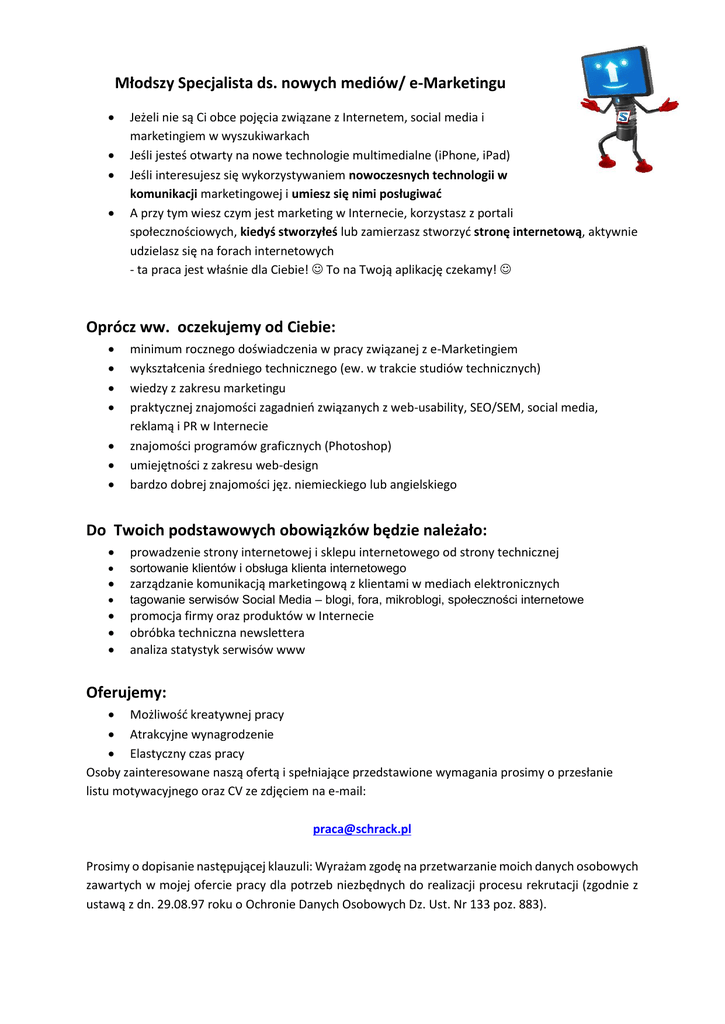 Młodszy Specjalista ds. nowych mediów/ e-Marketingu Jeżeli nie są Ci obce pojęcia związane z Internetem, social media i marketingiem w wyszukiwarkach Jeśli jesteś otwarty na nowe technologie multimedialne (iPhone, iPad) Jeśli interesujesz się wykorzystywaniem nowoczesnych technologii w komunikacji marketingowej i umiesz się nimi posługiwać A przy tym wiesz czym jest marketing w Internecie, korzystasz z portali społecznościowych, kiedyś stworzyłeś lub zamierzasz stworzyć stronę internetową, aktywnie udzielasz się na forach internetowych - ta praca jest właśnie dla Ciebie! To na Twoją aplikację czekamy! Oprócz ww. oczekujemy od Ciebie: minimum rocznego doświadczenia w pracy związanej z e-Marketingiem wykształcenia średniego technicznego (ew. w trakcie studiów technicznych) wiedzy z zakresu marketingu praktycznej znajomości zagadnień związanych z web-usability, SEO/SEM, social media, reklamą i PR w Internecie znajomości programów graficznych (Photoshop) umiejętności z zakresu web-design bardzo dobrej znajomości jęz. niemieckiego lub angielskiego Do Twoich podstawowych obowiązków będzie należało: prowadzenie strony internetowej i sklepu internetowego od strony technicznej sortowanie klientów i obsługa klienta internetowego zarządzanie komunikacją marketingową z klientami w mediach elektronicznych tagowanie serwisów Social Media – blogi, fora, mikroblogi, społeczności internetowe promocja firmy oraz produktów w Internecie obróbka techniczna newslettera analiza statystyk serwisów www Oferujemy: Możliwość kreatywnej pracy Atrakcyjne wynagrodzenie Elastyczny czas pracy Osoby zainteresowane naszą ofertą i spełniające przedstawione wymagania prosimy o przesłanie listu motywacyjnego oraz CV ze zdjęciem na e-mail: [email protected] Prosimy o dopisanie następującej klauzuli: Wyrażam zgodę na przetwarzanie moich danych osobowych zawartych w mojej ofercie pracy dla potrzeb niezbędnych do realizacji procesu rekrutacji (zgodnie z ustawą z dn. 29.08.97 roku o Ochronie Danych Osobowych Dz. Ust. Nr 133 poz. 883).