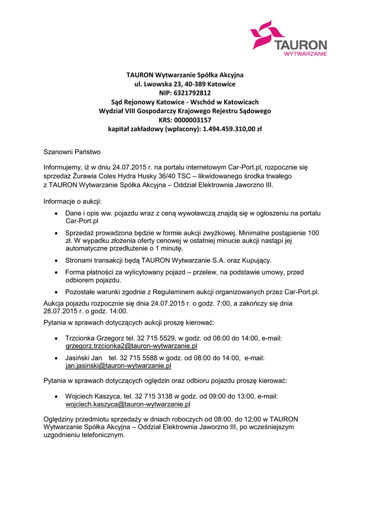 TAURON Wytwarzanie Spółka Akcyjna ul. Lwowska 23, 40-389 Katowice NIP: 6321792812 Sąd Rejonowy Katowice - Wschód w Katowicach Wydział VIII Gospodarczy Krajowego Rejestru Sądowego KRS: 0000003157 kapitał zakładowy (wpłacony): 1.494.459.310,00 zł Szanowni Państwo Informujemy, iż w dniu 24.07.2015 r. na portalu internetowym Car-Port.pl, rozpocznie się sprzedaż Żurawia Coles Hydra Husky 36/40 TSC – likwidowanego środka trwałego z TAURON Wytwarzanie Spółka Akcyjna – Oddział Elektrownia Jaworzno III. Informacje o aukcji: Dane i opis ww. pojazdu wraz z ceną wywoławczą znajdą się w ogłoszeniu na portalu Car-Port.pl Sprzedaż prowadzona będzie w formie aukcji zwyżkowej. Minimalne postąpienie 100 zł. W wypadku złożenia oferty cenowej w ostatniej minucie aukcji nastąpi jej automatyczne przedłużenie o 1 minutę. Stronami transakcji będą TAURON Wytwarzanie S.A. oraz Kupujący. Forma płatności za wylicytowany pojazd – przelew, na podstawie umowy, przed odbiorem pojazdu. Pozostałe warunki zgodnie z Regulaminem aukcji organizowanych przez Car-Port.pl. Aukcja pojazdu rozpocznie się dnia 24.07.2015 r. o godz. 7:00, a zakończy się dnia 28.07.2015 r. o godz. 14:00. Pytania w sprawach dotyczących aukcji proszę kierować: Trzcionka Grzegorz tel. 32 715 5529, w godz. od 08:00 do 14:00, e-mail: [email protected] Jasiński Jan tel. 32 715 5588 w godz. od 08:00 do 14:00, e-mail: [email protected] Pytania w sprawach dotyczących oględzin oraz odbioru pojazdu proszę kierować: Wojciech Kaszyca, tel. 32 715 3138 w godz. od 09:00 do 13:00, e-mail: [email protected] Oględziny przedmiotu sprzedaży w dniach roboczych od 08:00. do 12:00 w TAURON Wytwarzanie Spółka Akcyjna – Oddział Elektrownia Jaworzno III, po wcześniejszym uzgodnieniu telefonicznym.