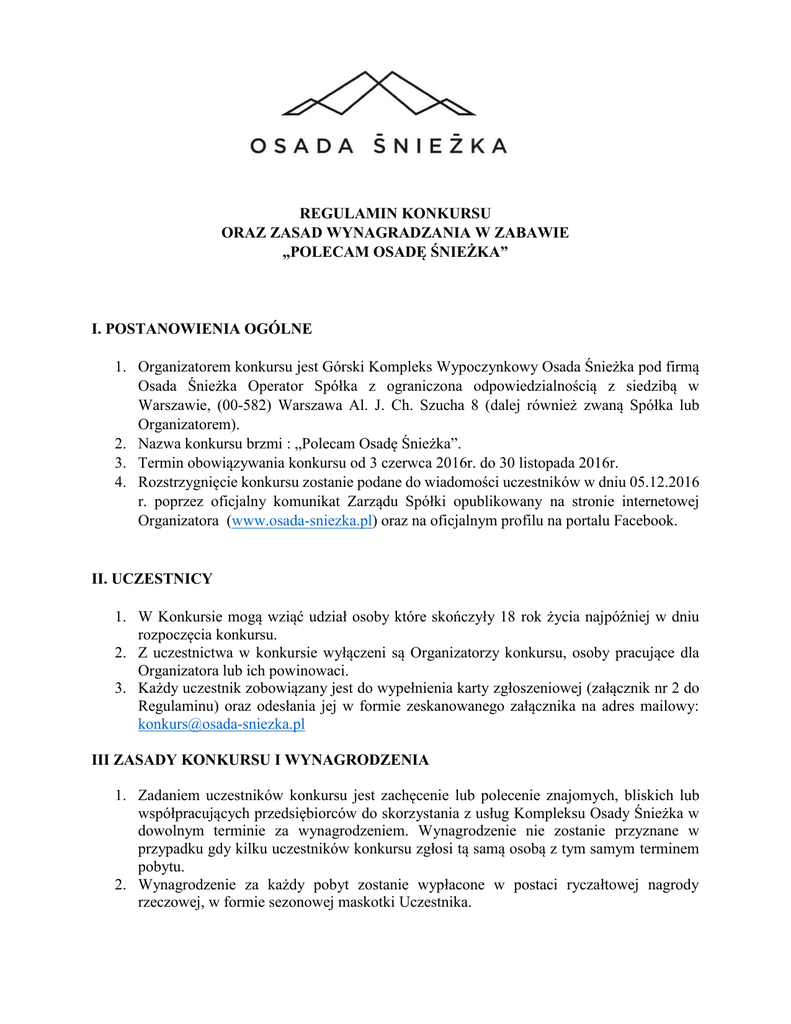 REGULAMIN KONKURSU ORAZ ZASAD WYNAGRADZANIA W ZABAWIE „POLECAM OSADĘ ŚNIEŻKA” I. POSTANOWIENIA OGÓLNE 1. Organizatorem konkursu jest Górski Kompleks Wypoczynkowy Osada Śnieżka pod firmą Osada Śnieżka Operator Spółka z ograniczona odpowiedzialnością z siedzibą w Warszawie, (00-582) Warszawa Al. J. Ch. Szucha 8 (dalej również zwaną Spółka lub Organizatorem). 2. Nazwa konkursu brzmi : „Polecam Osadę Śnieżka”. 3. Termin obowiązywania konkursu od 3 czerwca 2016r. do 30 listopada 2016r. 4. Rozstrzygnięcie konkursu zostanie podane do wiadomości uczestników w dniu 05.12.2016 r. poprzez oficjalny komunikat Zarządu Spółki opublikowany na stronie internetowej Organizatora (www.osada-sniezka.pl) oraz na oficjalnym profilu na portalu Facebook. II. UCZESTNICY 1. W Konkursie mogą wziąć udział osoby które skończyły 18 rok życia najpóźniej w dniu rozpoczęcia konkursu. 2. Z uczestnictwa w konkursie wyłączeni są Organizatorzy konkursu, osoby pracujące dla Organizatora lub ich powinowaci. 3. Każdy uczestnik zobowiązany jest do wypełnienia karty zgłoszeniowej (załącznik nr 2 do Regulaminu) oraz odesłania jej w formie zeskanowanego załącznika na adres mailowy: [email protected] III ZASADY KONKURSU I WYNAGRODZENIA 1. Zadaniem uczestników konkursu jest zachęcenie lub polecenie znajomych, bliskich lub współpracujących przedsiębiorców do skorzystania z usług Kompleksu Osady Śnieżka w dowolnym terminie za wynagrodzeniem. Wynagrodzenie nie zostanie przyznane w przypadku gdy kilku uczestników konkursu zgłosi tą samą osobą z tym samym terminem pobytu. 2. Wynagrodzenie za każdy pobyt zostanie wypłacone w postaci ryczałtowej nagrody rzeczowej, w formie sezonowej maskotki Uczestnika. 3. Każdy Uczestnik konkursu otrzyma wynagrodzenie za jeden zrealizowany pobyt, jedynie w przypadku gdy pobyt odbędzie się z jego polecenia niezależnie od terminu, ilości uczestników oraz długości pobytu. 4. Pobyt uczestnika konkursu będzie nagrodzony ryczałtowym wynagrodzeniem w formie sezonowej maskotki Uczestnika. 5. Aby uzyskać wynagrodzenie w konkursie należy na podany adres e-mail: [email protected] przesłać informację, na temat poleconego gościa wraz ze wskazaniem terminu pobytu oraz jego danych osobowych umożliwiających identyfikacje poleconego. 6. Wynagrodzenie zostanie przyznane w chwili gdy goście, którzy dzięki poleconemu opłacą zaliczkę za zarezerwowany pobyt w Osadzie Śnieżka lub po zameldowaniu się gości oraz rozliczeniu pobytu. 7. Wynagrodzenie nie zostanie przyznane, gdy rezerwacja nie zostanie potwierdzona zaliczką, lub zostanie anulowana. 8. Rozliczenie i wypłata wynagrodzenia dla poszczególnych uczestników konkursu nastąpi po upłynięciu terminu przyjmowania zgłoszeń do konkursu. 9. Do zgłoszenia należy dołączyć wypełniony Formularz zgłoszeniowy (załącznik nr 1). 10. Dodatkowe obostrzenia: a. Nie należy wysyłać danych oraz terminu pobytu osób, które nie wyrażają na to zgody b. Nie będą uznawane pobyty, zarezerwowane oraz potwierdzone zaliczką, które były zrealizowane przed rozpoczęciem konkursu. c. Pobyty polecone będą uznawane, wyłącznie w sprzedaży bezpośredniej Osady Śnieżka. V KONKURS I JURY 1. Wszystkie potwierdzone zgłoszenia za które uczestnicy otrzymają wynagrodzenie, wezmą udział w konkursie o Nagrodę Główną oraz Nagrody Dodatkowe. 2. Jury dokona weryfikacji wszystkich zgłoszeń oraz poleceń dokonanych przez Uczestników konkursu przed przyznaniem Nagrody Głównej oraz Nagród Dodatkowych. 3. Nagrodę Główna oraz Nagrody Dodatkowe Jury przyzna trzem Uczestnikom konkursu, którzy polecieli największą liczbę osób lub pobytów, a osoby z ich polecenia zrealizowały i opłaciły pobyt w Kompleksie Osada Sniezka. 4. Jury przyzna nagrody Uczestnikom odpowiednio według ilości zrealizowanych zgłoszeń. Zwycięzca Nagrody Głównej będzie Uczestnik z polecenia którego zrealizowano najwięcej pobytów. W przypadku poleceń „ex aequo” o zwycięstwie zdecyduje wartość zgłoszenia. 5. Decyzje Jury będą traktowane jako ostateczne. 6. W skład Jury chodzą: Dariusz Surynt – Prezes Zarządu Teresa Królak – Dyrektor Marketingu Anna Brzózko-Jaworska – Kierownik Marketingu VI NAGRODA GŁOWNA I NAGRODY DODATKOWE 1. Jury przyzna Nagrodę Główną oraz Nagrody Dodatkowe w postaci : Nagroda Główna - tygodniowy pobyt w kompleksie Osada Śnieżka dla dwóch osób i 2 dzieci do lat 16, w okresie świąt Bożego Narodzenia lub ferii 2017r., pobyt obejmuje wyżywienie: śniadanie i obiadokolację I i II Nagroda Dodatkowa - weekendowy pobyt w kompleksie Osada Śnieżka dla dwóch osób i 2 dzieci do lat 16, w wybranym terminie, w tym także okresie świąt Bożego Narodzenia lub ferii 2017r., pobyt obejmuje wyżywienie: śniadanie i obiadokolację. 2. Zwycięzcy Nagrody Głównej oraz I i II Nagrody Dodatkowej zostaną powiadomieni o werdykcie Jury drogą e-mailową. Wynik całego konkursu zostanie opublikowany na stornie Organizatora oraz portalu Facebook. VII POSTANOWIENIA KOŃCOWE Uczestnik Konkursu z chwilą nadesłania zgłoszeń do konkursu oświadcza, że: 1. Akceptuje niniejszym regulamin. 2. Jest autorem zgłoszeń oraz posiada zgodę osób, którym polecił Osadę Śnieżka na przekazanie ich danych oraz terminu pobytu. 3. Odpowiedzialność za wszelkie roszczenia osób trzecich związane z konkursem, które mogłyby być skierowane do Organizatorów Konkursu, przyjmuje na siebie Uczestnik Konkursu. 4. Wyraża zgodę na przetwarzanie swoich danych osobowych na potrzeby konkursu, zgodnie z ustawą o Ochronie Danych Osobowych z dnia 29 sierpnia 1997r. Dz.U. Nr 133 poz. 833 z poz. zm., 5. Organizator zastrzega sobie prawo do wprowadzenia zmian w regulaminie. O wprowadzonych zmianach Uczestnicy konkursu zostaną niezwłocznie powiadomieni przez Organizatora drogą e-mailową lub w formie komunikatu zamieszczonego na stronie Organizatora. Publikacja no
