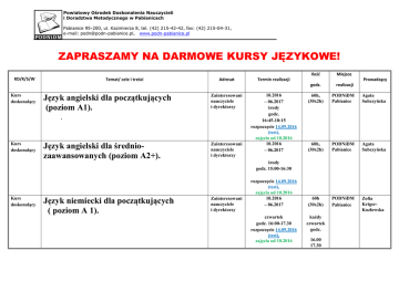 Powiatowy Ośrodek Doskonalenia Nauczycieli i Doradztwa Metodycznego w Pabianicach Pabianice 95-200, ul. Kazimierza 8, tel. (42) 215-42-42, fax: (42) 215-04-31, e-mail: [email protected], www.podn-pabianice.pl ZAPRASZAMY NA DARMOWE KURSY JĘZYKOWE! KD/K/S/W Temat/ cele i treści Adresat Kurs doskonalący Język angielski dla początkujących (poziom A1). . Zainteresowani nauczyciele i dyrektorzy Kurs doskonalący Język angielski dla średniozaawansowanych (poziom A2+). Zainteresowani nauczyciele i dyrektorzy Kurs doskonalący Język niemiecki dla początkujących ( poziom A 1). Ilość Miejsce godz. realizacji Termin realizacji 10.2016 – 06.2017 środy godz. 16:45-18:15 rozpoczęcie 14.09.2016 (test), zajęcia od 10.2016 10.2016 – 06.2017 Prowadzący 60h, (30x2h) PODNiDM Pabianice Agata Subczyńska 60h, (30x2h) PODNiDM Pabianice Agata Subczyńska 60h (30x2h) PODNiDM Pabianice Zofia KrigerKozłowska środy godz. 15:00-16:30 Zainteresowani nauczyciele i dyrektorzy rozpoczęcie 14.09.2016 (test), zajęcia od 10.2016 10.2016 – 06.2017 czwartek godz. 16:00-17.30 rozpoczęcie 14.09.2016 (test), zajęcia od 10.2016 każdy czwartek godz. 16.00 17.30