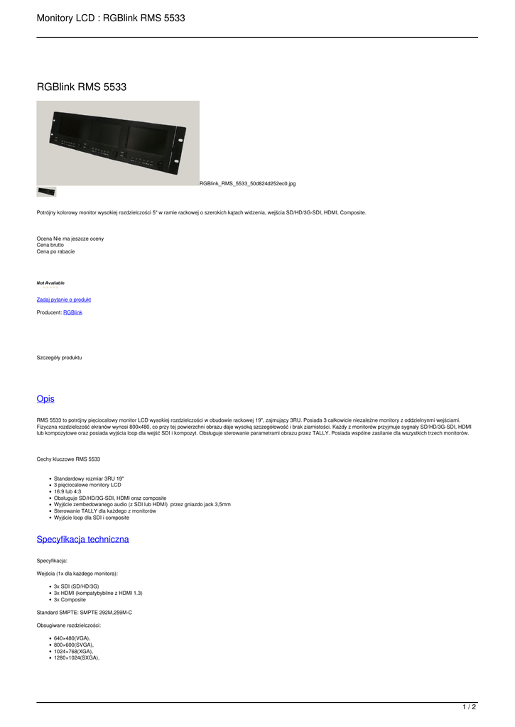 Monitory LCD : RGBlink RMS 5533 RGBlink RMS 5533 RGBlink_RMS_5533_50d824d252ec0.jpg Potrójny kolorowy monitor wysokiej rozdzielczości 5" w ramie rackowej o szerokich kątach widzenia, wejścia SD/HD/3G-SDI, HDMI, Composite. Ocena Nie ma jeszcze oceny Cena brutto Cena po rabacie Zadaj pytanie o produkt Producent: RGBlink Szczegóły produktu Opis RMS 5533 to potrójny pięciocalowy monitor LCD wysokiej rozdzielczości w obudowie rackowej 19", zajmujący 3RU. Posiada 3 całkowicie niezależne monitory z oddzielnynmi wejściami. Fizyczna rozdzielczość ekranów wynosi 800x480, co przy tej powierzchni obrazu daje wysoką szczegółowość i brak ziarnistości. Każdy z monitorów przyjmuje sygnały SD/HD/3G-SDI, HDMI lub kompozytowe oraz posiada wyjścia loop dla wejść SDI i kompozyt. Obsługuje sterowanie parametrami obrazu przez TALLY. Posiada wspólne zasilanie dla wszystkich trzech monitorów. Cechy kluczowe RMS 5533 Standardowy rozmiar 3RU 19" 3 pięciocalowe monitory LCD 16:9 lub 4:3 Obsługuje SD/HD/3G-SDI, HDMI oraz composite Wyjście zembedowanego audio (z SDI lub HDMI) przez gniazdo jack 3,5mm Sterowanie TALLY dla każdego z monitorów Wyjście loop dla SDI i composite Specyfikacja techniczna Specyfikacja: Wejścia (1x dla każdego monitora): 3x SDI (SD/HD/3G) 3x HDMI (kompatybybilne z HDMI 1.3) 3x Composite Standard SMPTE: SMPTE 292M,259M-C Obsugiwane rozdzielczości: 640×480(VGA), 800×600(SVGA), 1024×768(XGA), 1280×1024(SXGA), 1/2 Monitory LCD : RGBlink RMS 5533 1600×1200(UXGA), HDTV: 480p,720p,1080p,1080i NTSC,PAL oraz SECAM Napięcie zasilania: 12V DC Pobór mocy: poniżej 24 W Wymiary: 480 x 130 x 42 mm Masa: 2,1 kg Temperatura pracy: 0 - 40℃ Wilgotność: 10% - 90% Temperatora przechowywania: -15 - +60 ℃ Parametry ekranów: Rozmiar: 5 cali Rozdzielczość: 800x480 Format obrazu: 16:9 / 4:3 Kąty widzenia: (w pionie/w poziomie): 140 stopni / 120 stopni Jasność: 350 cd/m2 Kontrast: 500:1 English RMS 5533S is a 19”3RU standard rack mounting LCD monitor, with 3 high resolution 5” LCD panels of independent input controlling, 800×RGB×480, and wide viewing angle. Each monitor of RMS 5533S accepts 1 3G/HD/SD-SDI, 1 DVI, 1 VGA, and 1 Composite video, each input with loop through output. Support SDI and HDMI embedded audio output .RMS 5533S has a 2-pin pole 12V DC power connector for all the 3 LCD panels. Features: Standard 3 unit rack mount size 5 inch LCD ×3 800×RGB×480 for each LCD 16:9 / 4:3 adjustable 3G/HD/SD-SDI, DVI, VGA, Composite video SDI embedded audio output via 3.5mm earphone socket HDMI embedded audio output via 3.5mm earphone socket Max input resolution 2048 x 1152 or 2560 x 816 Underscan / Overscan switch Viewangle adjustable structure Each input with loop through Auto input standard detection 2/2 Powered by TCPDF (www.tcpdf.org)