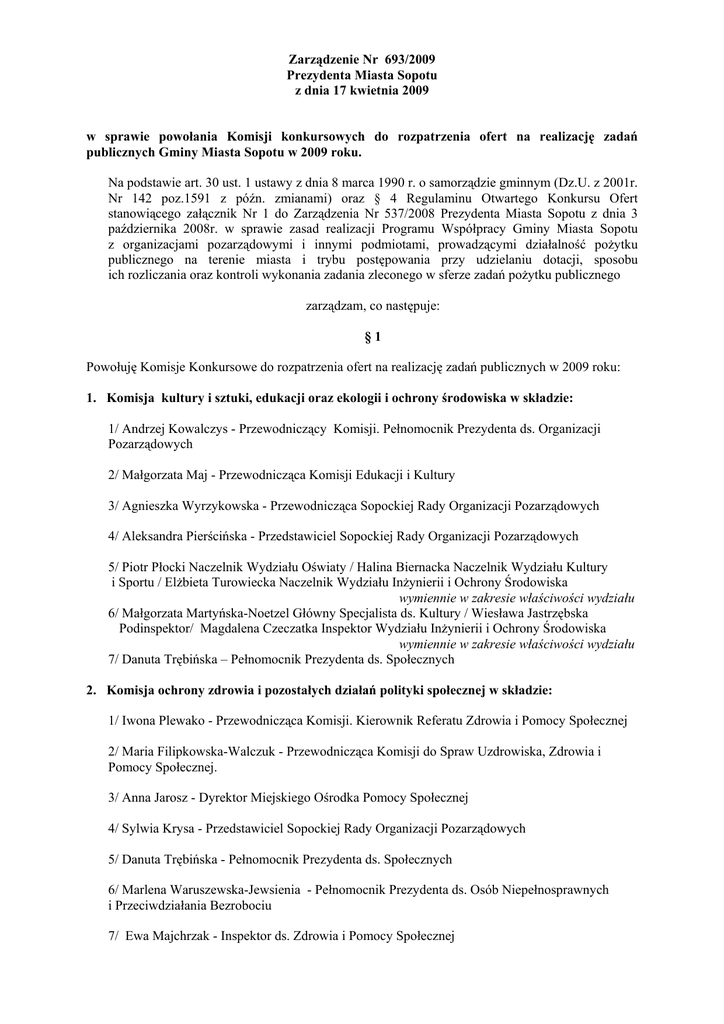 Zarządzenie Nr 693/2009 Prezydenta Miasta Sopotu z dnia 17 kwietnia 2009 w sprawie powołania Komisji konkursowych do rozpatrzenia ofert na realizację zadań publicznych Gminy Miasta Sopotu w 2009 roku. Na podstawie art. 30 ust. 1 ustawy z dnia 8 marca 1990 r. o samorządzie gminnym (Dz.U. z 2001r. Nr 142 poz.1591 z późn. zmianami) oraz § 4 Regulaminu Otwartego Konkursu Ofert stanowiącego załącznik Nr 1 do Zarządzenia Nr 537/2008 Prezydenta Miasta Sopotu z dnia 3 października 2008r. w sprawie zasad realizacji Programu Współpracy Gminy Miasta Sopotu z organizacjami pozarządowymi i innymi podmiotami, prowadzącymi działalność poŜytku publicznego na terenie miasta i trybu postępowania przy udzielaniu dotacji, sposobu ich rozliczania oraz kontroli wykonania zadania zleconego w sferze zadań poŜytku publicznego zarządzam, co następuje: §1 Powołuję Komisje Konkursowe do rozpatrzenia ofert na realizację zadań publicznych w 2009 roku: 1. Komisja kultury i sztuki, edukacji oraz ekologii i ochrony środowiska w składzie: 1/ Andrzej Kowalczys - Przewodniczący Komisji. Pełnomocnik Prezydenta ds. Organizacji Pozarządowych 2/ Małgorzata Maj - Przewodnicząca Komisji Edukacji i Kultury 3/ Agnieszka Wyrzykowska - Przewodnicząca Sopockiej Rady Organizacji Pozarządowych 4/ Aleksandra Pierścińska - Przedstawiciel Sopockiej Rady Organizacji Pozarządowych 5/ Piotr Płocki Naczelnik Wydziału Oświaty / Halina Biernacka Naczelnik Wydziału Kultury i Sportu / ElŜbieta Turowiecka Naczelnik Wydziału InŜynierii i Ochrony Środowiska wymiennie w zakresie właściwości wydziału 6/ Małgorzata Martyńska-Noetzel Główny Specjalista ds. Kultury / Wiesława Jastrzębska Podinspektor/ Magdalena Czeczatka Inspektor Wydziału InŜynierii i Ochrony Środowiska wymiennie w zakresie właściwości wydziału 7/ Danuta Trębińska – Pełnomocnik Prezydenta ds. Społecznych 2. Komisja ochrony zdrowia i pozostałych działań polityki społecznej w składzie: 1/ Iwona Plewako - Przewodnicząca Komisji. Kierownik Referatu Zdrowia i Pomocy Społecznej 2/ Maria Filipkowska-Walczuk - Przewodnicząca Komisji do Spraw Uzdrowiska, Zdrowia i Pomocy Społecznej. 3/ Anna Jarosz - Dyrektor Miejskiego Ośrodka Pomocy Społecznej 4/ Sylwia Krysa - Przedstawiciel Sopockiej Rady Organizacji Pozarządowych 5/ Danuta Trębińska - Pełnomocnik Prezydenta ds. Społecznych 6/ Marlena Waruszewska-Jewsienia - Pełnomocnik Prezydenta ds. Osób Niepełnosprawnych i Przeciwdziałania Bezrobociu 7/ Ewa Majchrzak - Inspektor ds. Zdrowia i Pomocy Społecznej 8/ Maciej Rusek - Kierownik Referatu Integracji Europejskiej 9/ Andrzej Kowalczys - Pełnomocnik Prezydenta ds. Organizacji Pozarządowych 3. Komisja kultury fizycznej i sportu oraz turystyki w składzie: 1/ Halina Biernacka - Przewodnicząca Komisji. Naczelnik Wydziału Kultury i Sportu 2/ Jerzy Hall - Przewodniczący Komisji Bezpieczeństwa i Statutu Miasta. 3/ Agnieszka Wyrzykowska - Przewodnicząca Sopockiej Rady Organizacji Pozarządowych 4/ Lucjan Brudzyński - Przedstawiciel Sopockiej Rady Organizacji Pozarządowych 5/ Jacek Podgórski - Inspektor ds. Sportu 6/ Katarzyna Stawiasz - Inspektor ds. Turystyki 7/ Andrzej Kowalczys - Pełnomocnik Prezydenta ds. Organizacji Pozarządowych 4. Komisja profilaktyki i terapii uzaleŜnień, przeciwdziałania patologiom społecznym w składzie: 1/ Małgorzata Pobłocka - Przewodnicząca Komisji. Pełnomocnik Prezydenta ds. UzaleŜnień 2/ Iwona Plewako - Kierownik Referatu Zdrowia i Pomocy Społecznej 3/ Agnieszka Wyrzykowska - Przewodnicząca Sopockiej Rady Organizacji Pozarządowych 4/ Marian Chwastniewski - Przedstawiciel Sopockiej Rady Organizacji Pozarządowych 5/ Wieczesław Augustyniak - Przewodniczący Rady Miasta Sopotu 6/ Tadeusz Węsierski - Członek Miejskiej Komisji Rozwiązywania Problemów Alkoholowych 7/ Andrzej Kowalczys - Pełnomocnik Prezydenta ds. Organizacji Pozarządowych. 5. Komisja turystyki i promocji miasta w składzie: 1/ Anna Dyksińska - Przewodnicząca Komisji. Inspektor ds. Informacji i Promocji Miasta 2/ Andrzej Pawiński - Radny Miasta Sopotu 3/ Agnieszka Wyrzykowska - Przewodnicząca Sopockiej Rady Organizacji Pozarządowych 4/ Marian Chwastniewski - Przedstawiciel Sopockiej Rady Organizacji Pozarządowych 5/ Halina Biernacka - Naczelnik Wydziału Kultury i Sportu 6/ Katarzyna Stawiasz - Inspektor ds. Turystyki 7/ Katarzyna Matuszak - Przedstawiciel Sopockiej Rady Organizacji Pozarządowych 8/ Andrzej Kowalczys - Pełnomocnik Prezydenta ds. Organizacji Pozarządowych §2 Regulamin pracy Komisji Konkursowych ds. wyboru ofert na realizację zadań publicznych Gminy Miasta Sopotu w 2009 roku stanowi załącznik Nr 1 do niniejszego Zarządzenia. §3 Zarządzenie wchodzi w Ŝycie z dniem podpisania. Załącznik nr 1 do Zarządzenia Nr 693/2009 Prezydenta Miasta Sopotu z dnia 17 kwietnia 2009r. Regulamin pracy Komisji Konkursowych ds. wyboru ofert na realizację zadań publicznych Gminy Miasta Sopotu w 2009 roku. 1. Niniejszy Regulamin określa kompetencje oraz zadania Komisji Konkursowej zwanej dalej Komisją. 2. W skład Komisji wchodzą osoby wymienione w akcie powołania. 3. Komisja rozpoczyna działalność z dniem jej powołania przez Prezydenta Miasta Sopotu. 4. Komisja pracuje w trakcie posiedzeń. 5. Do zadań Komisji naleŜy: a) ustalanie listy podmiotów spełniających kryteria konkursu; b) opiniowanie zgłoszonych ofert; c) określenie zakresu rzeczowego, formy przyznania dotacji oraz kwoty dotacji; d) wnioskowanie do Prezydenta Miasta Sopotu o zatwierdzenie propozycji wyłonionej oferty i wysokości dotacji. 6. W skład Komisji wchodzą: przewodniczący Komisji, sekretarz Komisji oraz pozostali członkowie. 7. Komisja na pierwszym posiedzeniu wybiera sekretarza Komisji spośród swoich członków. 8. Pracą Komisji kieruje przewodniczący Komisji powołany przez Prezydenta Miasta Sopotu. 9. Do zadań przewodniczącego Komisji naleŜy w szczególności: wyznaczanie posiedz