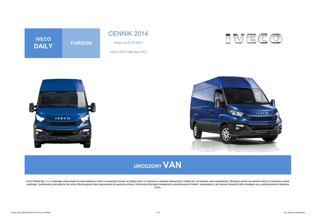 CENNIK 2014 IVECO DAILY FURGON Ważny od 01.07.2014 Ceny w PLN netto (bez VAT) URODZONY VAN Iveco Poland Sp. z o.o. zastrzega sobie prawo do wprowadzania zmian w niniejszym cennik, w każdej chwili i to zarówno w zakresie oferowanych modeli jak i ich budowy oraz wyposażenia. Niniejszy cennik nie stanowi oferty w rozumieniu prawa cywilnego i publikowany jest jedynie dla celów informacyjnych jako zaproszenie do zawarcia umowy. Informacje dotyczące dostępności prezentowanych modeli i wyposażenia, jak również aktualnej oferty dostępne są u autoryzowanych dealerów Iveco. Cennik_Daily_MY2014-2014-07-01.xlsx / FURGON 1/3 IPL / Sylwester Baczkowski IVECO DAILY Furgon Model KM Wysokość dachu [mm] Rozstaw osi [mm] Kubatura [m3] Poj. 35S11 V 106 2,3 l. 90 900 93 400 95 900 97 900 101 900 35S13 V 126 2,3 l. 93 300 95 800 98 300 100 300 104 300 35S15 V 146 2,3 l. 95 700 98 200 100 700 102 700 35S15 V 146 3,0 l. 97 700 100 200 102 700 35S17 V 170 3,0 l. 100 700 103 200 35S21 V 205 3,0 l. 105 700 35C11 V 106 2,3 l. 35C13 V 126 2,3 l. 35C15 V 146 35C15 V Cena netto [PLN] H2 = 1.920 mm 3.520 L 4.100 12 m3 16 m3 3.520 L 13,4 m3 H3 = 2.110 mm 4.100 18 m3 4.100 L 19,6 m3 - 99 900 103 900 - - 102 300 106 300 - 106 700 - 104 700 108 700 - 104 700 108 700 - 106 700 110 700 - 105 700 107 700 111 700 - 109 700 113 700 - 108 200 110 700 112 700 116 700 -- 114 700 118 700 -- - 99 500 102 000 104 000 108 000 - 106 000 110 000 - - 101 900 104 400 106 400 110 400 - 108 400 112 400 - 2,3 l. - 104 300 106 800 108 800 112 800 - 110 800 114 800 - 146 3,0 l. - 106 300 108 800 110 800 114 800 - 112 800 116 800 - 35C17 V 170 3,0 l. - 109 300 111 800 113 800 117 800 - 115 800 119 800 - 35C21 V 205 3,0 l. - 114 300 116 800 118 800 122 800 - 120 800 124 800 - 35C15 V H 146 3,0 l. - 111 300 113 800 115 800 119 800 - 117 800 121 800 - 35C17 V H 170 3,0 l. - 114 300 116 800 118 800 122 800 - 120 800 124 800 - 50C15 V 146 3,0 l. - 116 300 118 800 120 800 124 800 128 800 122 800 126 800 130 800 50C17 V 170 3,0 l. - 119 300 121 800 123 800 127 800 131 800 125 800 129 800 133 800 50C21 V 205 3,0 l. - 124 300 126 800 128 800 132 800 136 800 130 800 134 800 138 800 50C15 V H 146 3,0 l. - 124 300 126 800 128 800 132 800 136 800 130 800 134 800 138 800 50C17 V H 170 3,0 l. - 127 300 129 800 131 800 135 800 139 800 133 800 137 800 141 800 60C 60C15 V H 146 3,0 l. - - - - 133 800 137 800 - 135 800 139 800 60C17 V H 170 3,0 l. - - - - 137 800 141 800 - 139 800 143 800 65C 65C15 V H 146 3,0 l. - - - - 136 200 140 200 - 138 200 142 200 65C17 V H 170 3,0 l. - - - - 140 200 144 200 - 142 200 146 200 70C 70C15 V H 146 3,0 l. - - - - 138 400 142 400 - 140 400 144 400 70C17 V H 170 3,0 l. - - - - 142 400 146 400 - 144 400 148 400 35S 35C 50C Cennik_Daily_MY2014-2014-07-01.xlsx / FURGON - CENY H1 = 1.545 mm 3.000 3.520 7,3 m3 9,0 m3 3.520 10,8 m3 2/3 4.100 L 17,5 m3 IPL / Sylwester Baczkowski IVECO DAILY Furgon DOPŁATY DO WERSJI BAZOWEJ Model 35S 35C 50C 60C 65C 70C 3.000 -2 500 - Rozstaw osi [mm] 3.520 3.520 L 4.100 0 2 000 6 000 -2 000 0 4 000 -2 000 0 4 000 0 0 0 Model 35-70 Model 35-70 Model 35S 35C 50C 60C 65C 70C Manualna 6M 0 4.100 L 8 000 4 000 4 000 4 000 Skrzynia biegów Zautomatyzowana 6A 5 900 SEMI WINDOW furgon pół-przeszklony 3 900 Zawieszenie PRZEDNIE mechaniczne QUAD QUAD LEAF TOR 0 900 0 0 0 0 0 - Cennik_Daily_MY2014-2014-07-01.xlsx / FURGON - OPCJE PAKIETY WYPOSAŻENIOWE [PLN NETTO] STANDARD COMFORT PLUS TOP 0 System ESP Kąt otwarcia tylnych drzwi 2700 Ławka dla 2 pasażerów Fotel kierowcy - regulowany w 3 kierunkach Poduszka powietrzna kierowcy Okładzina na tylnej ścianie kabiny Przygotowanie do montażu radia Lusterka - elektrycznie sterowane i podgrzewane Kosz na koło zapasowe Koło zapasowe Bez zestawu naprawczego opon Centralny zamek ze zdalnym sterowaniem Elektryczne sterow. szybami w drzwiach bocznych BOSCH ALTERNATOR 4 900 Klimatyzacja manualna Sprężarka klima. 170cm3 Ławka dla 2 pasażerów ze stolikiem w oparciu Fotel kierowcy sprężynowany, reg. w 3 kierunkach 5 900 Klimatyzacja manualna Sprężarka klima. 170cm3 Ławka dla 2 pasażerów ze stolikiem w oparciu Półka górna nad szybą Światła przeciwmgielne Radio z MP3 7 900 Klimatyzacja automatyczna Sprężarka klima. 170cm3 Ławka dla 2 pasażerów ze stolikiem w oparciu Fotel kierowcy sprężynowany, reg. w 3 kierunkach Półka górna nad szybą Światła przeciwmgielne Radio CD + bluetooth Deska rozdzielcza KOMFORT Wyświetlacz MATRIX Tempomat Zawieszenie TYLNE mechan. pneumat. 0 0 0 0 0 0 6 900 7 900 7 900 9 900 9 900 9 900 [PLN NETTO] PAKIETY FUNKCJONALNE OFF-ROAD 4 500 Blokada tylnego mostu Osłona miski olejowej Tylne zawieszenie półeliptyczne z resorem pomocniczym TRANSPORT 2 500 Złącze elek. 13 PIN-DIN Hak holowniczy kulowy D-50 Tachograf cyfrowy 3/3 CITY 1 700 Ścianka działowa z oknem stałym Czujniki cofania w panelu 3 światło stop + oświetlenie [PLN NETTO] ECO 2 900 System Stop-Start Akumulatory 105Ah/850 Alternator 180A (12V) Przełącznik EcoSwitch Opony ECO WINTER 3 900 Szyba przednia - podgrzewana Ogrzewanie postojowe wodne (WEBASTO) IPL / Sylwester Baczkowski