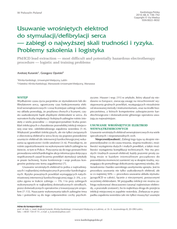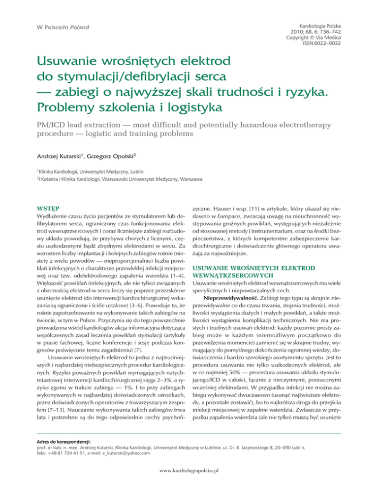 Kardiologia Polska 2010; 68, 6: 736–742 Copyright © Via Medica ISSN 0022–9032 W Polsce/In Poland Usuwanie wrośniętych elektrod do stymulacji/defibrylacji serca — zabiegi o najwyższej skali trudności i ryzyka. Problemy szkolenia i logistyka PM/ICD lead extraction — most difficult and potentially hazardous electrotherapy procedure — logistic and training problems Andrzej Kutarski1, Grzegorz Opolski2 1Klinika Kardiologii, Uniwersytet Medyczny, Lublin 2I Katedra i Klinika Kardiologii, Warszawski Uniwersytet Medyczny, Warszawa WSTĘP Wydłużenie czasu życia pacjentów ze stymulatorem lub defibrylatorem serca, ograniczony czas funkcjonowania elektrod wewnątrzsercowych i coraz liczniejsze zabiegi rozbudowy układu powodują, że przybywa chorych z licznymi, często uszkodzonymi bądź zbędnymi elektrodami w sercu. Za wzrostem liczby implantacji i kolejnych zabiegów rośnie (niestety z wielu powodów — nieproporcjonalnie) liczba powikłań infekcyjnych o charakterze przewlekłej infekcji miejscowej oraz tzw. odelektrodowego zapalenia wsierdzia [1–4]. Większość powikłań (infekcyjnych, ale nie tylko) związanych z obecnością elektrod w sercu leczy się poprzez przezskórne usunięcie elektrod (do interwencji kardiochirurgicznej wskazania są ograniczone i ściśle ustalone) [3–6]. Powoduje to, że rośnie zapotrzebowanie na wykonywanie takich zabiegów na świecie, w tym w Polsce. Przyczynia się do tego powszechnie prowadzona wśród kardiologów akcja informacyjna dotycząca współczesnych zasad leczenia powikłań stymulacji (artykuły w prasie fachowej, liczne konferencje i sesje podczas kongresów poświęcone temu zagadnieniu) [7]. Usuwanie wrośniętych elektrod to jedna z najtrudniejszych i najbardziej niebezpiecznych procedur kardiologicznych. Ryzyko poważnych powikłań wymagających natychmiastowej interwencji kardiochirurgicznej sięga 2–3%, a ryzyko zgonu w trakcie zabiegu — 1%. I to przy zabiegach wykonywanych w najbardziej doświadczonych ośrodkach, przez doświadczonych operatorów z towarzyszącym zespołem [7–13]. Nauczanie wykonywania takich zabiegów trwa lata i potrzebne są do tego odpowiednie cechy psychofi- zyczne. Hauser i wsp. [11] w artykule, który ukazał się niedawno w Europace, zwracają uwagę na nieuchronność występowania groźnych powikłań, występujących niezależnie od stosowanej metody i instrumentarium, oraz na środki bezpieczeństwa, z których kompetentne zabezpieczenie kardiochirurgiczne i doświadczenie głównego operatora uważają za najważniejsze. USUWANIE WROŚNIĘTYCH ELEKTROD WEWNĄTRZSERCOWYCH Usuwanie wrośniętych elektrod wewnątrzsercowych ma wiele specyficznych i niepowtarzalnych cech. Nieprzewidywalność. Zabiegi tego typu są skrajnie nieprzewidywalne co do czasu trwania, stopnia trudności, możliwości wystąpienia dużych i małych powikłań, a także możliwości wystąpienia komplikacji technicznych. Nie ma prostych i trudnych usuwań elektrod; każdy pozornie prosty zabieg może w każdym (niemożliwym początkowo do przewidzenia momencie) zamienić się w skrajnie trudny, wymagający do pomyślnego dokończenia ogromnej wiedzy, doświadczenia i bardzo szerokiego asortymentu sprzętu. Jest to procedura usuwania nie tylko uszkodzonych elektrod, ale w co najmniej 50% — procedura usuwania układu stymulującego/ICD w całości, łącznie z nieczynnymi, porzuconymi wcześniej elektrodami. W przypadku infekcji nie można zabiegu wykonywać dwuczasowo (usunąć najświeższe elektrody, a pozostałe zostawić), bo to najkrótsza droga do przejścia infekcji miejscowej w zapalnie wsierdzia. Zwłaszcza w przypadku zapalenia wsierdzia (ale nie tylko) muszą być usunięte Adres do korespondencji: prof. dr hab. n. med. Andrzej Kutarski, Klinika Kardiologii, Uniwersytet Medyczny w Lublinie, ul. Dr. K. Jaczewskiego 8, 20–090 Lublin, faks: +48 81 724 41 51, e-mail: [email protected] www.kardiologiapolska.pl 737 Usuwanie wrośniętych elektrod do stymulacji/defibrylacji serca Rycina 1. Relatywnie „proste” usunięcie 8-letniego układu DDD w przypadku infekcji miejscowej. Częściowy sukces radiologiczny (wg kryteriów HRS 2009), gdyż w ścianie przedsionka pozostał „łepek” elektrody przedsionkowej (strzałka) również te „wpadnięte”, z proksymalnym końcem w układzie żylnym bądź sercu. Wymaga to wykorzystania zupełnie innych, bardzo złożonych technik i wyszkolenia w zakresie metod stosowanych w radiologii zabiegowej, a także umiejętności posługiwania się sprzętem stosowanym w tej specjalności [7]. Nieprzerywalność. O ile każdy zabieg implantacji (np. CRT-D) można przerwać i wykonać najprostszą jego wersję, planując rozbudowę systemu w przyszłości, a ablacji można (bez bezpośredniej szkody dla pacjenta) nie dokończyć (dopuszczając plan „doablowania czegoś” w przyszłości), o tyle zabieg usuwania elektrod musi być dokończony! Uszkodzenie osłonki elektrody i odsłonięcie jej metalowej spirali powoduje, że tworzy się miejsce powstawania zakrzepicy i źródło zatorowości płucnej (antykoagulacja wdrożona u pacjentów bezpośrednio po takim zabiegu tylko znacząco zwiększa ryzyko powikłań krwotocznych). Nieprzewidywalny jest również czas trwania zabiegu. Zwykle jest dłuższy od implantacji układu (średni czas trwania zabiegu w materiale własnym obejmującym 430 pacjentów wynosi 115 min), choć często przekracza 3 godziny [7]. Zdarza się, że może wynosić 6 godzin i więcej, więc możliwość takiego znacznego wydłużenia czasu trwania zabiegu bezwzględnie muszą przewidywać warunki organizacyjne. Niebezpieczeństwo powikłań. Historia przezskórnego usuwania elektrod liczy ponad 20 lat. Pozwoliło to na poznanie potencjalnych powikłań (nie zawsze do uniknięcia nawet w najlepszych ośrodkach). Jednocześnie zdobyte w tym czasie doświadczenie przyczyniło się do poprawy skuteczności techniki operacyjnej usuwania wro