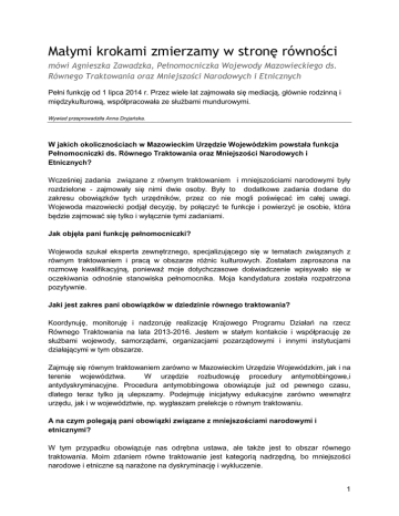 Małymi krokami zmierzamy w stronę równości mówi Agnieszka Zawadzka, Pełnomocniczka Wojewody Mazowieckiego ds. Równego Traktowania oraz Mniejszości Narodowych i Etnicznych Pełni funkcję od 1 lipca 2014 r. Przez wiele lat zajmowała się mediacją, głównie rodzinną i międzykulturową, współpracowała ze służbami mundurowymi. Wywiad przeprowadziła Anna Dryjańska. W jakich okolicznościach w Mazowieckim Urzędzie Wojewódzkim powstała funkcja Pełnomocniczki ds. Równego Traktowania oraz Mniejszości Narodowych i Etnicznych? Wcześniej zadania związane z równym traktowaniem i mniejszościami narodowymi były rozdzielone - zajmowały się nimi dwie osoby. Były to dodatkowe zadania dodane do zakresu obowiązków tych urzędników, przez co nie mogli poświęcać im całej uwagi. Wojewoda mazowiecki podjął decyzję, by połączyć te funkcje i powierzyć je osobie, która będzie zajmować się tylko i wyłącznie tymi zadaniami. Jak objęła pani funkcję pełnomocniczki? Wojewoda szukał eksperta zewnętrznego, specjalizującego się w tematach związanych z równym traktowaniem i pracą w obszarze różnic kulturowych. Zostałam zaproszona na rozmowę kwalifikacyjną, ponieważ moje dotychczasowe doświadczenie wpisywało się w oczekiwania odnośnie stanowiska pełnomocnika. Moja kandydatura została rozpatrzona pozytywnie. Jaki jest zakres pani obowiązków w dziedzinie równego traktowania? Koordynuję, monitoruję i nadzoruję realizację Krajowego Programu Działań na rzecz Równego Traktowania na lata 2013-2016. Jestem w stałym kontakcie i współpracuję ze służbami wojewody, samorządami, organizacjami pozarządowymi i innymi instytucjami działającymi w tym obszarze. Zajmuję się równym traktowaniem zarówno w Mazowieckim Urzędzie Wojewódzkim, jak i na terenie województwa. W urzędzie rozbudowuję procedury antymobbingowe,i antydyskryminacyjne. Procedura antymobbingowa obowiązuje już od pewnego czasu, dlatego teraz tylko ją ulepszamy. Podejmuję inicjatywy edukacyjne zarówno wewnątrz urzędu, jak i w województwie, np. wygłaszam prelekcje o równym traktowaniu. A na czym polegają pani obowiązki związane z mniejszościami narodowymi i etnicznymi? W tym przypadku obowiązuje nas odrębna ustawa, ale także jest to obszar równego traktowania. Moim zdaniem równe traktowanie jest kategorią nadrzędną, bo mniejszości narodowe i etniczne są narażone na dyskryminację i wykluczenie. 1 Jestem w stałym kontakcie z organizacjami mniejszości narodowych i etnicznych na terenie województwa. Uczestniczę w różnego rodzaju wydarzeniach mniejszości, pomagam w uzyskaniu patronatu wojewody ważnym inicjatywom kulturalnym. Reaguję też na incydenty wymierzone w mniejszości. To do mnie trafiają skargi związane z dewastacją miejsc pamięci mniejszości narodowych i etnicznych. Do moich zadań należy wówczas pomoc, wsparcie i koordynacja działań służb. Mam stały kontakt z Komendą Stołeczną Policji i Komendą Wojewódzką Policji, z pełnomocnikami zajmującymi się prawami człowieka, z komendantami. Jakie są pani cele jako pełnomocniczki? Przyjęłam strategię małych kroków. Duże zmiany bywają bardzo trudne do zaakceptowania, często łatwiej przeprowadzić je stopniowo. Może trwać to dłużej , ale dzięki temu zmiany są bardziej efektywne, gdyż ludzie mają czas na przystosowanie się. Moim celem jest wprowadzenie skutecznych procedur antymobbingowych i antydyskryminacyjnych w urzędzie w taki sposób, aby pracownicy w razie potrzeby nie wahali się z nich skorzystać. Zależy mi na budowaniu zaufania pracowników do funkcji pełnomocnika i do mnie osobiście, żeby w razie problemu nie bali się przyjść i sprawdzić, czy to czego doświadczają wyczerpuje znamiona mobbingu lub dyskryminacji. To ważne, żebyśmy jako organizacja rozwiązywali sytuacje trudne na początkowym etapie. Jednym z moich priorytetów jest też budowanie dobrych relacji z przedstawicielami mniejszości narodowych i etnicznych. Bardzo sobie cenię choćby kontakty z Romami. Często dostaję podziękowania i wyrazy uznania - to jest dla mnie wyznacznik sukcesu. Jak wygląda typowy dzień pani pracy? W moim przypadku nie można mówić o typowym dniu pracy, gdyż jest bardzo dynamiczna ze względu na dużą różnorodność zadań. Bardzo lubię pracę z ludźmi, więc staram się wychodzić z urzędu, spotykać się z partnerami w ich siedzibach i w terenie. Każdy dzień jest nietypowy, jestem w różnych miejscach, uczestniczę w wielu wydarzeniach, takich jak konferencje, uroczystości czy spotkania. Są oczywiście takie dni, kiedy jestem na miejscu w urzędzie. Wówczas m.in. analizuję dokumenty, tworzę rekomendacje zmian dla urzędu, zastanawiam się co jeszcze moglibyśmy zrobić. Czy któraś przesłanka dyskryminacji dostarcza szczególnych wyzwań w pani działalności? Przeciwdziałanie dyskryminacji zawsze jest wyzwaniem, niezależnie od przesłanki. Moim priorytetem jest dostosowywanie infrastruktury do potrzeb osób niepełnosprawnych, przy czym mam na myśli zarówno niepełnosprawność ruchową, jak i trudności w komunikacji. Sprawdzam bariery w naszym urzędzie, a następnie razem z kierownictwem urzędu szukamy środków, żeby dostosowywać naszą siedzibę do potrzeb osób z różnymi niepełnosprawnościami. Niestety nie jest to w pełni możliwe, gdyż urząd mieści się w 2 zabytkowym budynku, którego projekt nie uwzględniał dostępności. Robimy jednak co możemy, a jest to wyzwanie nie tylko finansowe, ale i architektoniczne. Dużo skarg do pani wpływa? Niewiele, aczkolwiek mała liczba skarg nie oznacza braku problemu, lecz to, że przed nami duża praca związana z podnoszeniem świadomości społecznej. Pewnie nie wszyscy wiedzą, że w ogóle można takie zażalenia składać. Gdy ktoś się zgłasza, jesteśmy bardzo otwarci, organizujemy spotkanie, tak żeby wspólnie zastanowić się nad tym, co zrobić.