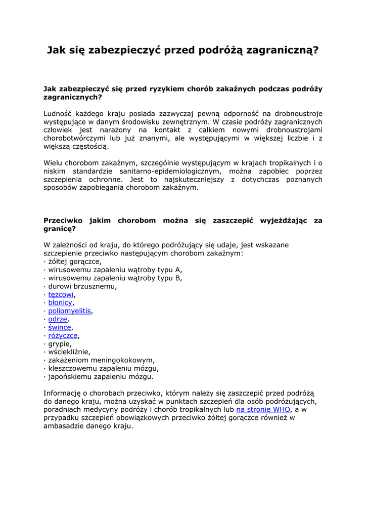 Jak się zabezpieczyć przed podróżą zagraniczną? Jak zabezpieczyć się przed ryzykiem chorób zakaźnych podczas podróży zagranicznych? Ludność każdego kraju posiada zazwyczaj pewną odporność na drobnoustroje występujące w danym środowisku zewnętrznym. W czasie podróży zagranicznych człowiek jest narażony na kontakt z całkiem nowymi drobnoustrojami chorobotwórczymi lub już znanymi, ale występującymi w większej liczbie i z większą częstością. Wielu chorobom zakaźnym, szczególnie występującym w krajach tropikalnych i o niskim standardzie sanitarno-epidemiologicznym, można zapobiec poprzez szczepienia ochronne. Jest to najskuteczniejszy z dotychczas poznanych sposobów zapobiegania chorobom zakaźnym. Przeciwko granicę? jakim chorobom można się zaszczepić wyjeżdżając za W zależności od kraju, do którego podróżujący się udaje, jest wskazane szczepienie przeciwko następującym chorobom zakaźnym: · żółtej gorączce, · wirusowemu zapaleniu wątroby typu A, · wirusowemu zapaleniu wątroby typu B, · durowi brzusznemu, · tężcowi, · błonicy, · poliomyelitis, · odrze, · śwince, · różyczce, · grypie, · wściekliźnie, · zakażeniom meningokokowym, · kleszczowemu zapaleniu mózgu, · japońskiemu zapaleniu mózgu. Informację o chorobach przeciwko, którym należy się zaszczepić przed podróżą do danego kraju, można uzyskać w punktach szczepień dla osób podróżujących, poradniach medycyny podróży i chorób tropikalnych lub na stronie WHO, a w przypadku szczepień obowiązkowych przeciwko żółtej gorączce również w ambasadzie danego kraju. Jak się zabezpieczyć przed groźnymi chorobami tropikalnymi przeciwko, którym nie ma szczepionek? Do chwili obecnej nie wyprodukowano skutecznej szczepionki przeciwko malarii. W przypadku tej choroby postępowanie profilaktyczne składa się z dwóch elementów: · chemioprofilaktyki, czyli zapobiegawczego przyjmowania leków przeciwmalarycznych w określonym schemacie, · unikania komarów, które przenoszą zarodźce malarii, poprzez odpowiedni strój oraz środki odstraszające owady. Nie ma również szczepionek przeciwko drobnoustrojom wywołującym tzw. biegunkę podróżnych, np. bakteriom z rodzaju Escherichia, Campylobacter, Salmonella, Shigella. Źródłem zakażenia tymi drobnoustrojami są zanieczyszczone nimi produkty pokarmowe i woda, a także ręce. Zapobieganie biegunce podróżnych polega na starannym przestrzeganiu zasad higieny osobistej, spożywaniu wyłącznie pokarmów poddanych obróbce termicznej, piciu tylko przegotowanej wody. Które szczepienia są obowiązkowe przed podróżą zagraniczną? Zaszczepienie przeciw określonym chorobom może stanowić warunek pozwolenia na wjazd do niektórych krajów. Przed wjazdem do Angoli, Beninu, Burkina Faso, Burundi, Demokratycznej Republiki Konga, Gabonu, Ghany, Gujany Francuskiej, Kamerunu, Liberii, Mali, Nigeru, Republiki Środkowo-Afrykańskiej, Ruandy, Sierra Leone, Togo, Wybrzeża Kości Słoniowej oraz na Wyspę Świętego Tomasza i Wyspę Książęcą konieczne jest zaszczepienie przeciwko żółtej gorączce. Przed udaniem się do Arabii Saudyjskiej na pielgrzymkę do Mekki obowiązkowe jest zaszczepienie przeciwko zakażeniom meningokokowym. Planując podróż, należy uzyskać z wyprzedzeniem informacje, które szczepienia są warunkiem uzyskania wizy do danego kraju. Więcej informacji można też uzyskać na stronach WHO w językach: angielskim, francuskim, hiszpańskim, rosyjskim lub chińskim. Czy są choroby, na które warto się zaszczepić przed podróżą nawet, gdy nie podlegają szczepieniom obowiązkowym? Oprócz szczepień obowiązkowych, WHO wyodrębnia dwie kategorie szczepień przed podróżą: rutynowe i zalecane. Szczepienia rutynowe obejmują szczepienia stosowane w danym kraju do uodpornienia dzieci zgodnie z obowiązującym programem szczepień. W wielu przypadkach od turystów lub osób udających się do innych krajów w celu podjęcia studiów lub pracy zarobkowej oczekuje się przedstawienia dokumentacji dotyczącej szczepień. W przypadku osób, które z jakiegoś powodu nie zostały zaszczepione pełnym cyklem szczepienia, wskazane jest podanie przed wyjazdem dawek przypominających lub uzupełnienie całego cyklu. Dotyczy to między innymi szczepionek przeciw błonicy, tężcowi, wzw B, poliomyelitis, odrze. Szczepienia zalecane wynikają ze zwiększonego ryzyka zakażenia w czasie podróży. Do tego typu szczepień można zaliczyć szczepienia przeciwko: wzw A, durowi brzusznemu, grypie, żółtej gorączce, zakażeniom meningokokowym, kleszczowemu zapaleniu mózgu, wściekliźnie, japońskiemu zapaleniu mózgu. Szczegółowe informacje o szczepieniach obowiązkowych i zalecanych do poszczególnych krajów i regionów, z uwzględnieniem aktualnej sytuacji epidemiologicznej, są publikowane i uaktualniane co 2 tygodnie na stronie internetowej Światowej Organizacji Zdrowia. Kiedy rozpocząć szczepienia przed planowaną podróżą? Uodpornienie najlepiej rozpocząć ok. 6-8 tygodni przed planowanym wyjazdem. Niektóre szczepienia wymagają podania kilku dawek w określonym schemacie szczepienia, z czego przed wyjazdem podaje się dwie dawki w odstępie 4 tygodni. Część szczepień wymaga podania tylko jednej dawki najpóźniej 2 tygodnie przed wyjazdem, np. szczepionkę przeciwko żółtej gorączce podaje się najpóźniej 10 dni przed wyjazdem. Ustalenie liczby i rodzaju szczepień u danej osoby zależy od: · czynników ryzyka związanych z podróżą, tj.: kraju docelowego i wymagań jego władz odnośnie szczepień, aktualnej sytuacji epidemiologicznej w tym kraju, czasu trwania i charakteru pobytu, warunków zakwaterowania oraz planowanych środków transportu; · czynników osobniczych, tj.: przebytych wcześniej szczepień i zakażeń pozostawiających odporność, stanu zdrowia, wieku, przeciwwskazań do szczepień; · właściwości szczepionki, tj.: wymagan